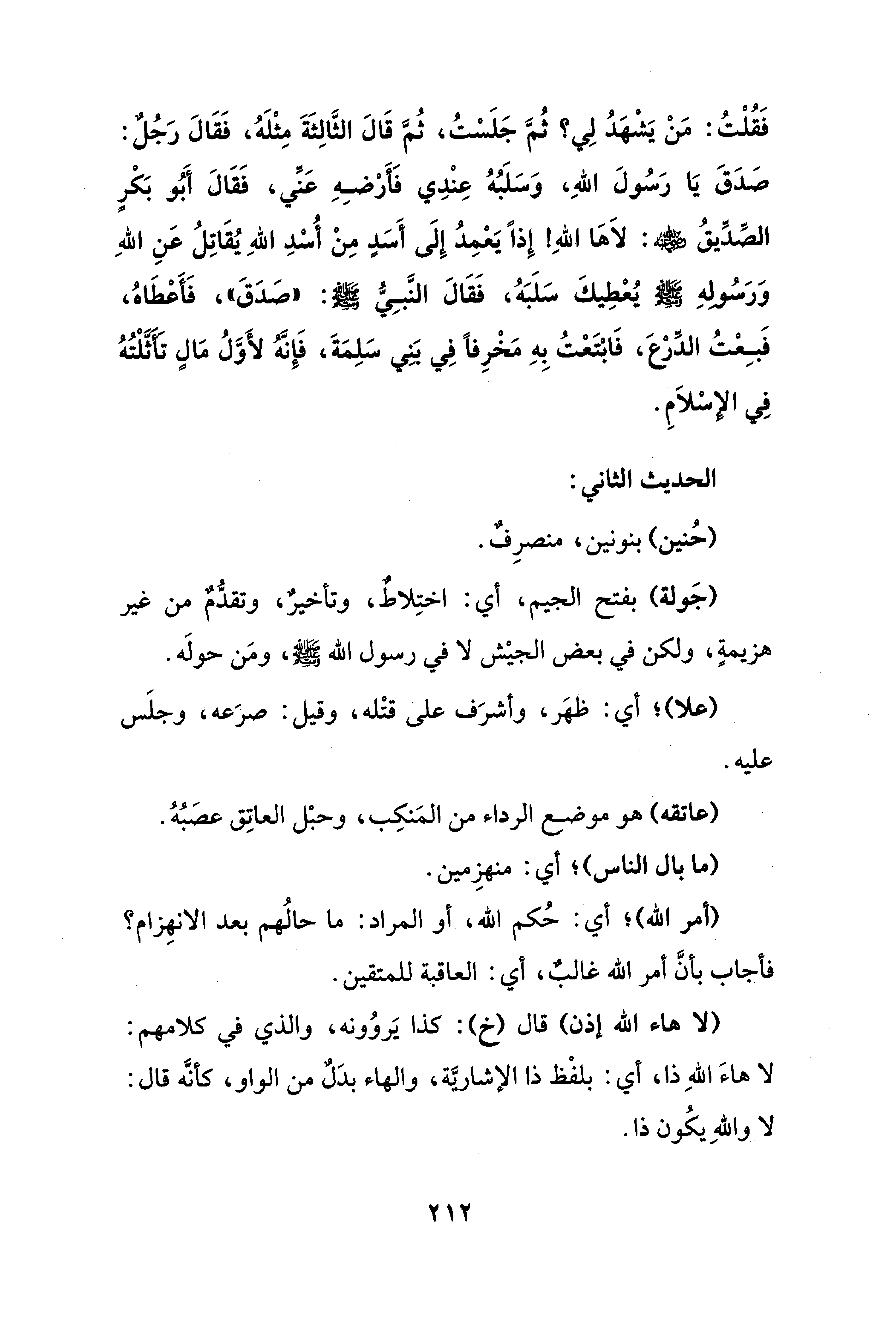 فَقُلْتُ: مَنْ يَشْهَدُ لِي؟ ثُمَّ جَلَسْتُ، ثُمَّ قَالَ الثَّالِثَةَ مِثْلَهُ، فَقَالَ رَجُلٌ: صَدَقَ يَا رَسُولَ اللهِ، وَسَلَبُهُ عِنْدِي فَأَرْضِهِ عَنِّي، فَقَالَ أَبُو بَكْرٍ الصِّدِّيقُ - رضي الله عنه -: لَاهَا اللهِ! إِذًا يَعْمِدُ إِلَى أَسَدٍ مِنْ أُسْدِ اللهِ يُقَاتِلُ عَنِ اللهِ وَرَسُولِهِ - صلى الله عليه وسلم - يُعْطِيكَ سَلَبَهُ، فَقَالَ النَّبِيُّ - صَلَّى الله عَلَيْهِ وَسَلَّمَ -: "صَدَقَ"، فَأَعْطَاهُ، فَبِعْتُ الدِّرْعَ، فَابْتَعْتُ بِهِ مَخْرِفًا فِي بَنِي سَلِمَةَ، فَإِنَّهُ لأَوَّلُ مَالٍ تَأَثَّلْتُهُ فِي الإِسْلَامِ.
