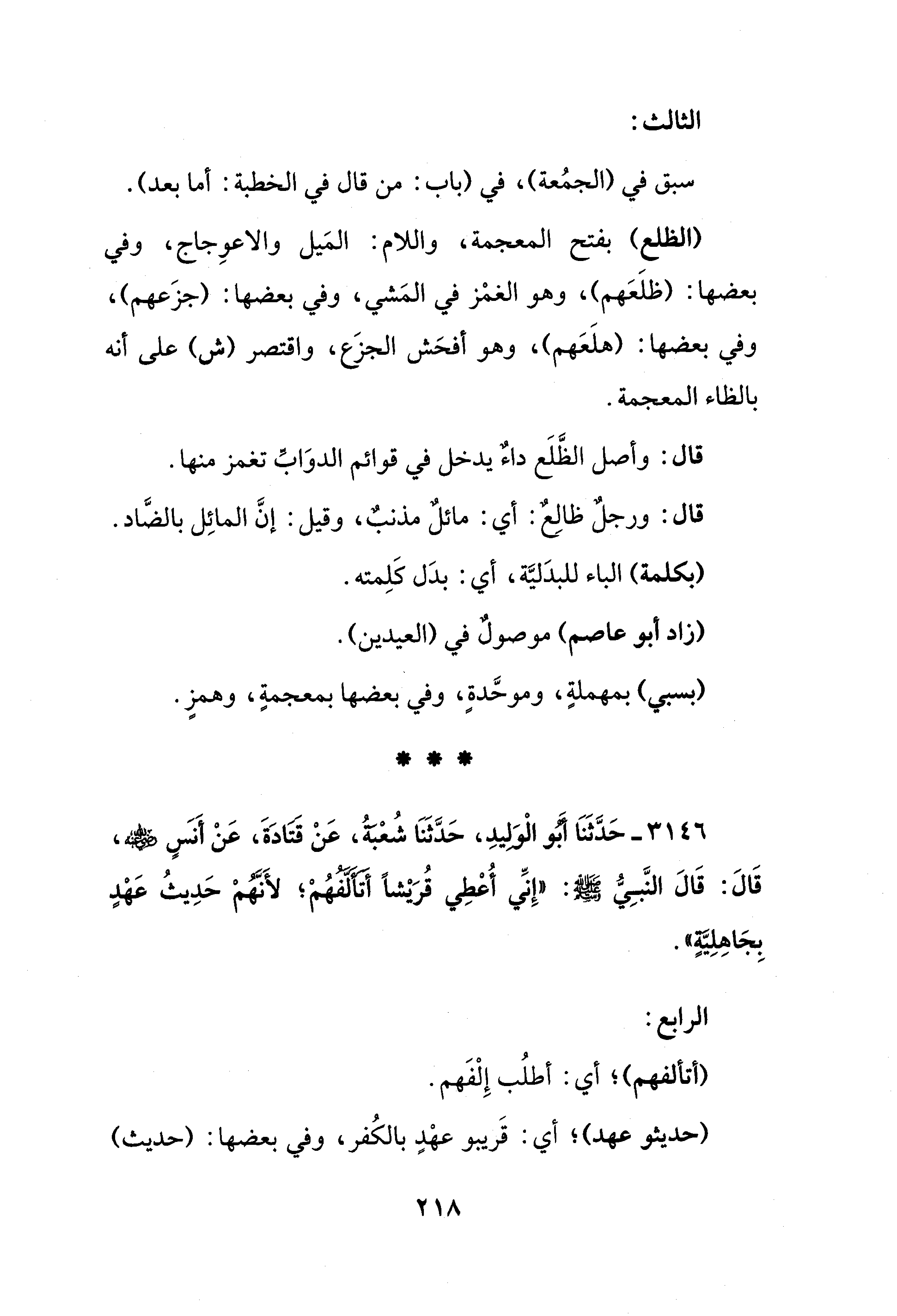 3146 - حَدَّثَنَا أَبُو الْوَبيدِ، حَدَّثَنَا شُعْبَةُ، عَنْ قتادَةَ، عَنْ أَنسٍ - رضي الله عنه -، قَالَ: قَالَ النَّبِيُّ - صلى الله عليه وسلم -: "إِنِّي أُعْطِي قُرَيْشًا أَتَأَلَّفُهُمْ؛ لأَنَّهمْ حَدِيثُ عَهْدٍ بِجَاهِلِيَّةٍ".