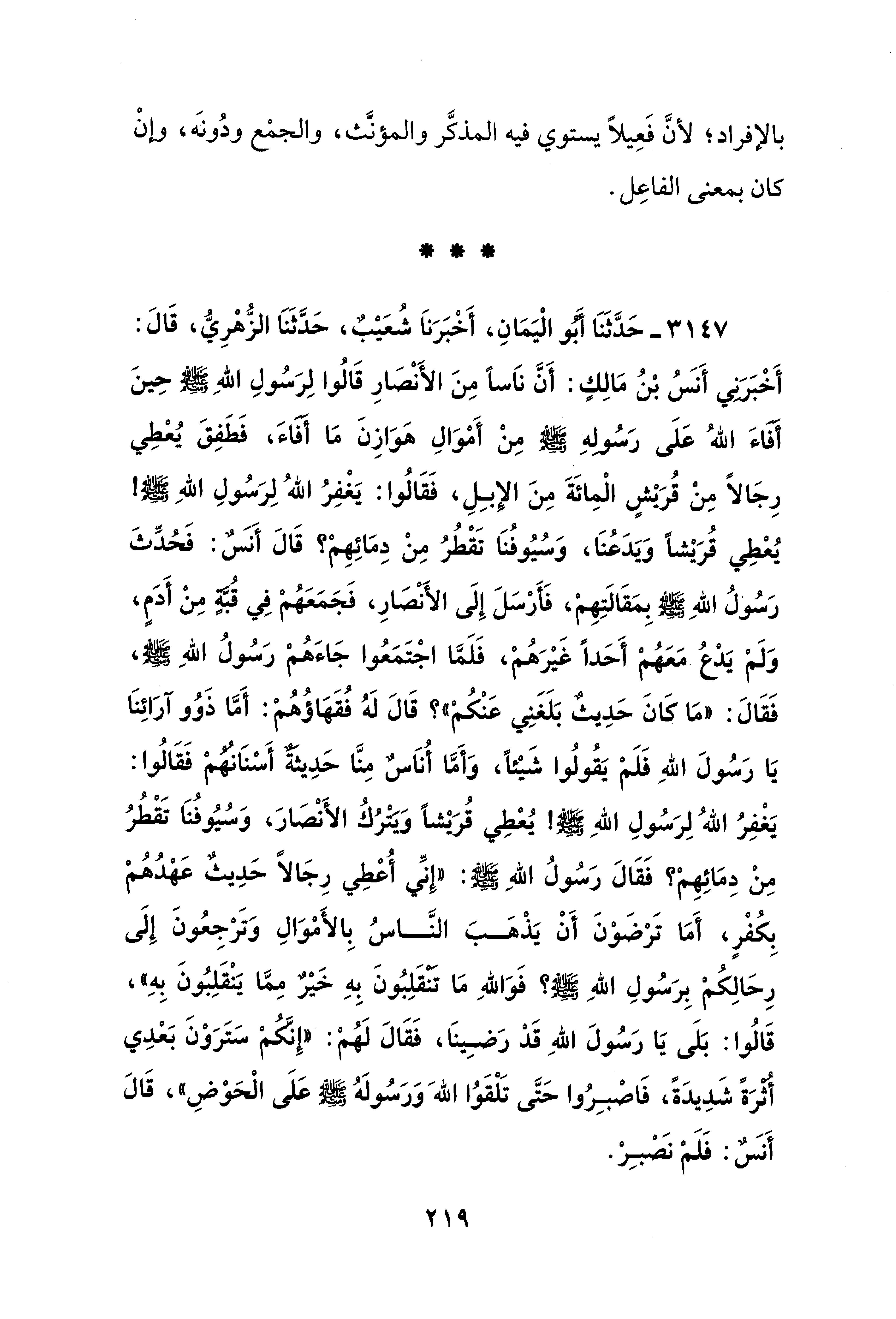 3147 - حَدَّثَنَا أَبُو الْيَمَانِ، أَخْبَرَنَا شُعَيْبٌ، حَدَّثَنَا الزُّهْرِيُّ، قَالَ: أَخْبَرَني أَنسُ بْنُ مَالِكٍ: أَنَّ نَاسًا مِنَ الأَنْصَارِ قَالُوا لِرَسُولِ اللهِ - صلى الله عليه وسلم - حِينَ أَفَاءَ اللهُ عَلَى رَسُولهِ - صلى الله عليه وسلم - مِنْ أَمْوَالِ هَوَازِنَ مَا أَفَاءَ، فَطَفِقَ يُعْطِي رِجَالًا مِنْ قُرَيْشٍ الْمِائَةَ مِنَ الإبِلِ، فَقَالُوا: يَغْفِرُ اللهُ لِرَسُولِ اللهِ - صلى الله عليه وسلم - يُعْطِي قُرَيْشًا وَيَدَعُنَا، وَسُيُوفُنَا تَقْطُرُ مِنْ دِمَائِهِمْ؟ قَالَ أَنسٌ: فَحُدِّثَ رَسُولُ اللهِ - صَلَّى الله عَلَيْهِ وَسَلَّمَ - بِمَقَالَتِهِمْ، فَأَرْسَلَ إِلَى الأَنْصَارِ، فَجَمَعَهُمْ فِي قُبَّةٍ مِنْ أَدَمٍ، وَلَمْ يَدْع مَعَهُمْ أَحَدًا غَيْرَهُمْ، فَلَمَّا اجْتَمَعُوا جَاءَهُمْ رَسُولُ اللهِ - صَلَّى الله عَلَيْهِ وَسَلَّمَ -، فَقَالَ: "مَا كَانَ حَدِيثٌ بَلَغَنِي عَنْكُمْ"؟ قَالَ لَهُ فُقَهَاؤُهُمْ: أَمَّا ذَوُو آرَائِنَا يَا رَسُولَ اللهِ فَلَمْ يَقُولُوا شَيْئًا، وَأَمَّا أُنَاسٌ مِنَّا حَدِيثَةٌ أَسْنَانُهُمْ فَقَالُوا: يَغْفِرُ اللهُ لِرَسُولِ اللهِ - صَلَّى الله عَلَيْهِ وَسَلَّمَ -! يُعْطِي قُرَيْشًا وَيَتْرُكُ الأَنْصَارَ، وَسُيُوفُنَا تَقْطُرُ مِنْ دِمَائِهِمْ؟ فَقَالَ رَسُولُ اللهِ - صلى الله عليه وسلم -: "إِنِّي أُعْطِي رِجَالًا حَدِيثٌ عَهْدُهُمْ بِكُفْرٍ، أَمَا تَرْضَوْنَ أَنْ يَذْهَبَ النَّاسُ بِالأَمْوَالِ وَتَرْجِعُونَ إِلَى رِحَالِكُمْ بِرَسُولِ اللهِ - صلى الله عليه وسلم -؟ فَوَاللهِ مَا تنقَلِبُونَ بِهِ خَيْرٌ مِمَّا يَنْقَلِبُونَ بِهِ"، قَالُوا: بَلَى يَا رَسُولَ اللهِ قَدْ رَضِينَا، فَقَالَ لَهُمْ: "إِنَّكمْ سَتَرَوْنَ بَعْدِي أُثْرَةً شَدِيدَةً، فَاصْبِرُوا حَتَّى تَلْقَوُا اللهَ وَرَسُولَهُ - صلى الله عليه وسلم - عَلَى الْحَوْضِ"، قَالَ أَنَسٌ: فَلَمْ نَصْبِرْ.