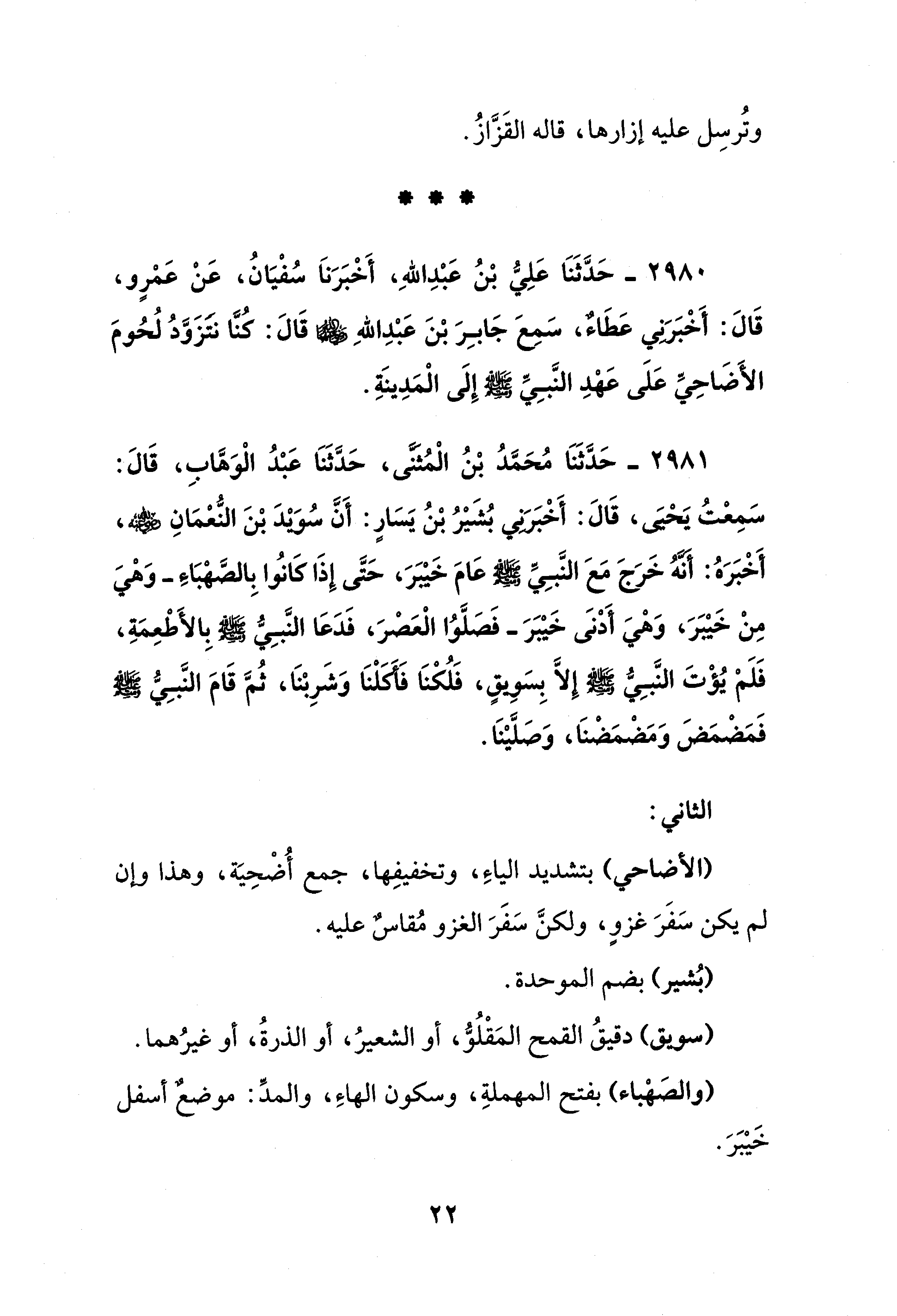 2981 - حَدَّثَنَا مُحَمَّدُ بْنُ الْمُثَنَّى، حَدَّثَنَا عَبْدُ الْوَهَّابِ، قَالَ: سَمِعْتُ يَحْيَى، قَالَ: أَخْبَرَنِي بُشَيْرُ بْنُ يَسَارٍ: أَنَّ سُوَيْدَ بْنَ النُّعْمَانِ - رضي الله عنه -، أَخْبَرَهُ: أنَّهُ خَرَجَ مَعَ النَّبِيِّ - صلى الله عليه وسلم - عَامَ خَيْبَرَ، حَتَّى إِذَا كَانُوا بِالصَّهْبَاءِ -وَهْيَ مِنْ خَيْبَرَ، وَهْيَ أَدْنىَ خَيْبَرَ- فَصَلَّوُا الْعَصْرَ، فَدَعَا النَّبِيُّ - صلى الله عليه وسلم - بِالأَطْعِمَةِ، فَلَمْ يُؤْتَ النَّبِيُّ - صلى الله عليه وسلم - إِلَّا بِسَوِيقٍ، فَلُكْنَا فَأَكَلْنَا وَشَرِبْنَا، ثُمَّ قَامَ النَّبِيُّ - صلى الله عليه وسلم - فَمَضْمَضَ وَمَضْمَضْنَا، وَصَلَّيْنَا.