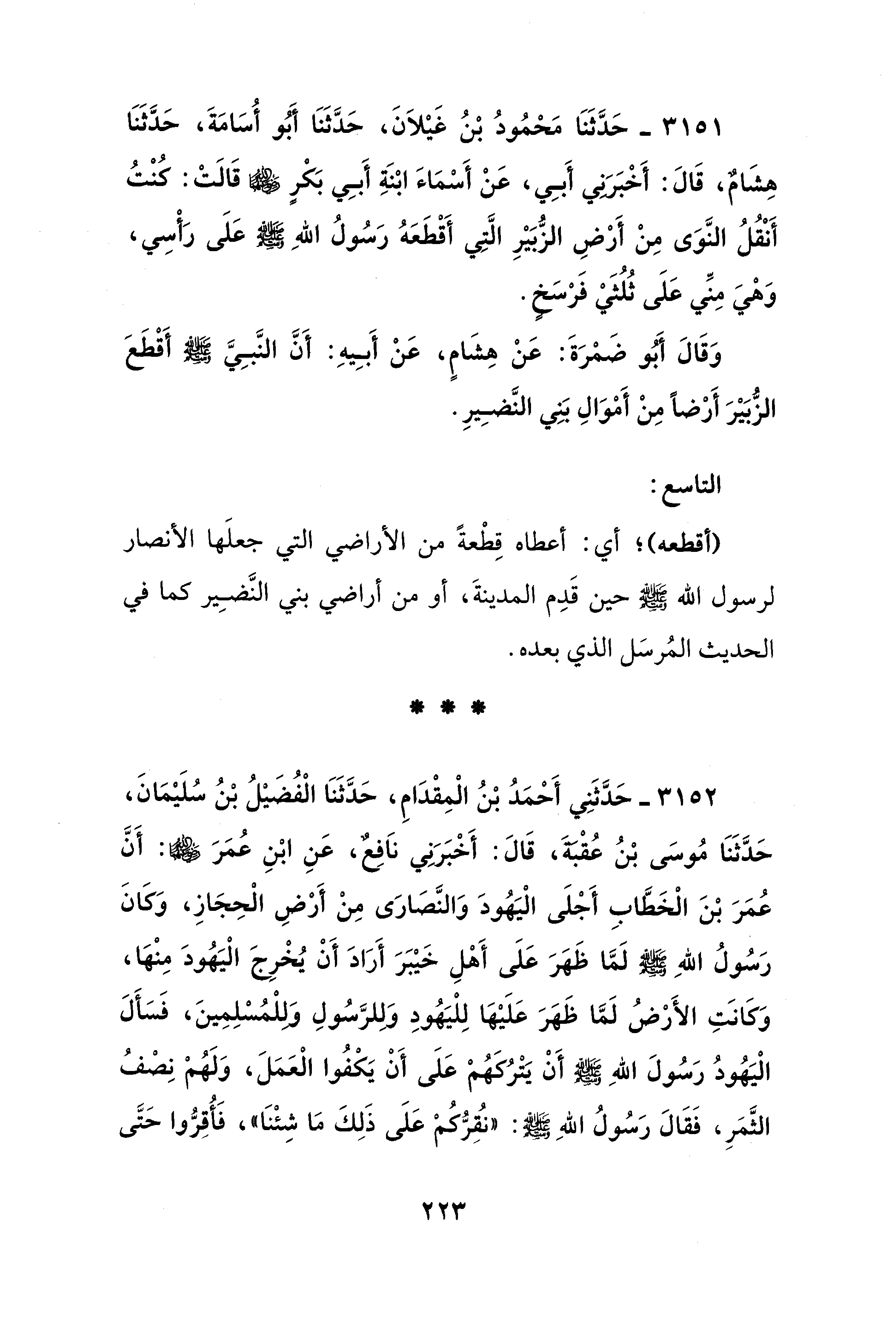 3151 - حَدَّثَنَا مَحْمُودُ بْنُ غَيْلَانَ، حَدَّثَنَا أَبُو أُسَامَةَ، حَدَّثَنَا هِشَامٌ، قَالَ: أَخْبَرَنِي أَبِي، عَنْ أَسْمَاءَ ابْنَةِ أَبِي بَكْرٍ - رضي الله عنهما - قَالَتْ: كُنْتُ أَنْقُلُ النَّوَى مِنْ أَرْضِ الزُّبَيْرِ الَّتِي أَقْطَعَهُ رَسُولُ اللهِ - صَلَّى الله عَلَيْهِ وَسَلَّمَ - عَلَى رَأْسِي، وَهْيَ مِنِّي عَلَى ثُلُثَيْ فَرْسَخٍ.