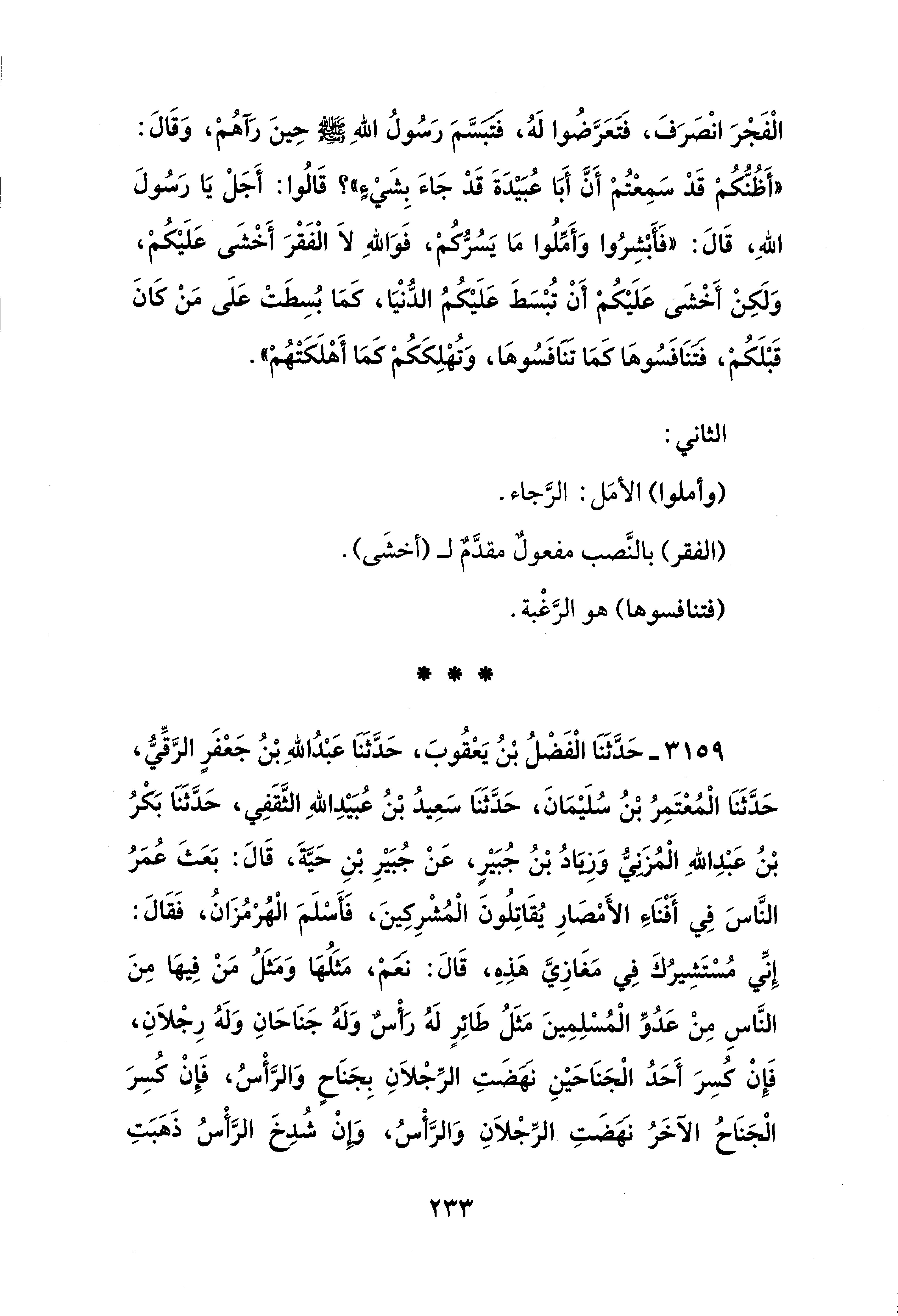 3159 - حَدَّثَنَا الْفَضْلُ بْنُ يَعْقُوبَ، حَدَّثَنَا عَبْدُ اللهِ بْنُ جَعْفَرٍ الرَّقِّيُّ، حَدَّثَنَا الْمُعْتَمِرُ بْنُ سُلَيْمَانَ، حَدَّثنا سَعِيدُ بْنُ عُبَيْدِ اللهِ الثَّقَفِي، حَدَّثَنَا بَكْرُ بْنُ عَبْدِ اللهِ الْمُزنيُّ وَزِيَادُ بْنُ جُبَيْرٍ، عَنْ جُبَيْرِ بْنِ حَيَّةَ، قَالَ: بَعَثَ عُمَرُ النَّاسَ فِي أَفْنَاءِ الأَمْصَارِ يُقَاتِلُونَ الْمُشْرِكِينَ، فَأَسْلَمَ الْهُرْمُزَانُ، فَقَالَ: إِنِّي مُسْتَشِيرُكَ فِي مَغَازِيَّ هَذِهِ، قَالَ: نعمْ، مَثَلُهَا وَمَثَلُ مَنْ فِيهَا مِنَ النَّاسِ مِنْ عَدُوِّ الْمُسْلِمِينَ مَثَلُ طَائِرٍ لَهُ رَأْسٌ وَلَهُ جَنَاحَانِ وَلَهُ رِجْلَانِ، فَإِنْ كُسِرَ أَحَدُ الْجَنَاحَيْنِ نَهَضَتِ الرِّجْلَانِ بِجَنَاحٍ وَالرَّأْسُ، فَإِنْ كسِرَ الْجَنَاحُ الآخَرُ نهضَتِ الرِّجْلَانِ وَالرَّأْسُ، وإنْ شُدِخَ الرَّأْسُ ذَهَبَتِ