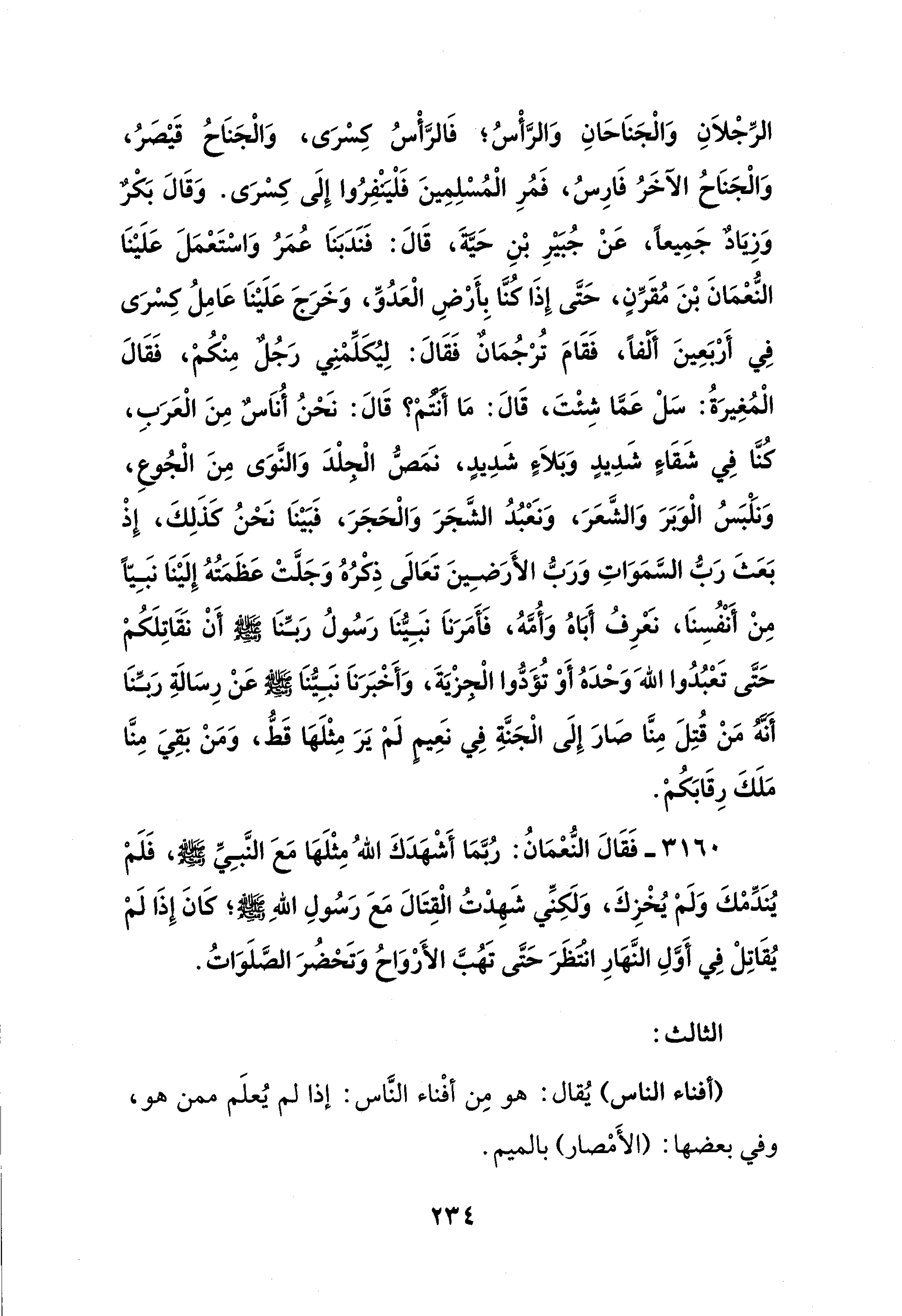 الرِّجْلَانِ وَالْجَنَاحَانِ وَالرَّأْسُ؛ فَالرَّأْسُ كِسْرَى، وَالْجَنَاحُ قَيْصَرُ، وَالْجَنَاحُ الآخَرُ فَارِسُ، فَمُرِ الْمُسْلِمِينَ فَلْيَنْفِرُوا إِلَى كِسْرَى. وَقَالَ بَكْرٌ وَزِيَادٌ جَمِيعًا، عَنْ جُبَيْرِ بْنِ حَيَّةَ، قَالَ: فَنَدَبَنَا عُمَرُ وَاسْتَعْمَلَ عَلَيْنَا النُّعْمَانَ بْنَ مُقَرِّنٍ، حَتَّى إِذَا كنَّا بِأرْضِ الْعَدُوِّ، وَخَرَجَ عَلَيْنَا عَامِلُ كِسْرَى فِي أَرْبَعِينَ أَلْفًا، فَقَامَ تُرْجُمَانٌ فَقَالَ: لِيُكَلِّمْنِي رَجُلٌ مِنْكُمْ، فَقَالَ الْمُغِيرَةُ: سَلْ عَمَّا شِئْتَ، قَالَ: مَا أَنتمْ؟ قَالَ: نَحْنُ أُنَاسٌ مِنَ الْعَرَبِ، كنَّا فِي شَقَاءٍ شَدِيدٍ وَبَلَاءٍ شَدِيدٍ، نَمَصُّ الْجِلْدَ وَالنَّوَى مِنَ الْجُوعِ، وَنلبَسُ الْوَبَرَ وَالشَّعَرَ، وَنَعْبُدُ الشَّجَرَ وَالْحَجَرَ، فَبَيْنَا نحنُ كَذَلِكَ، إِذْ بَعَثَ رَبُّ السَّمَوَاتِ وَرَبُّ الأَرَضِينَ تَعَالَى ذِكْرُهُ وَجَلَّتْ عَظَمَتُهُ إِلَيْنَا نبَيًّا مِنْ أَنْفُسِنَا، نعرِفُ أَبَاهُ وَأُمَّهُ، فَأَمَرَنَا نبَيُّنَا رَسُولُ رَبِّنَا - صلى الله عليه وسلم - أَنْ نَقَاتِلَكُمْ حَتَّى تَعْبُدُوا اللهَ وَحْدَهُ أَوْ تُؤَدُّوا الْجزْيَةَ، وَأَخْبَرَنَا نبَيُّنَا - صلى الله عليه وسلم - عَنْ رِسَالَةِ رَبِّنَا أَنَّهُ مَنْ قُتِلَ مِنَّا صَارَ إِلَى الْجَنَّةِ فِي نَعِيمٍ لَمْ يَرَ مِثْلَهَا قَطُّ، وَمَنْ بَقِيَ مِنَّا مَلَكَ رِقَابَكُمْ.