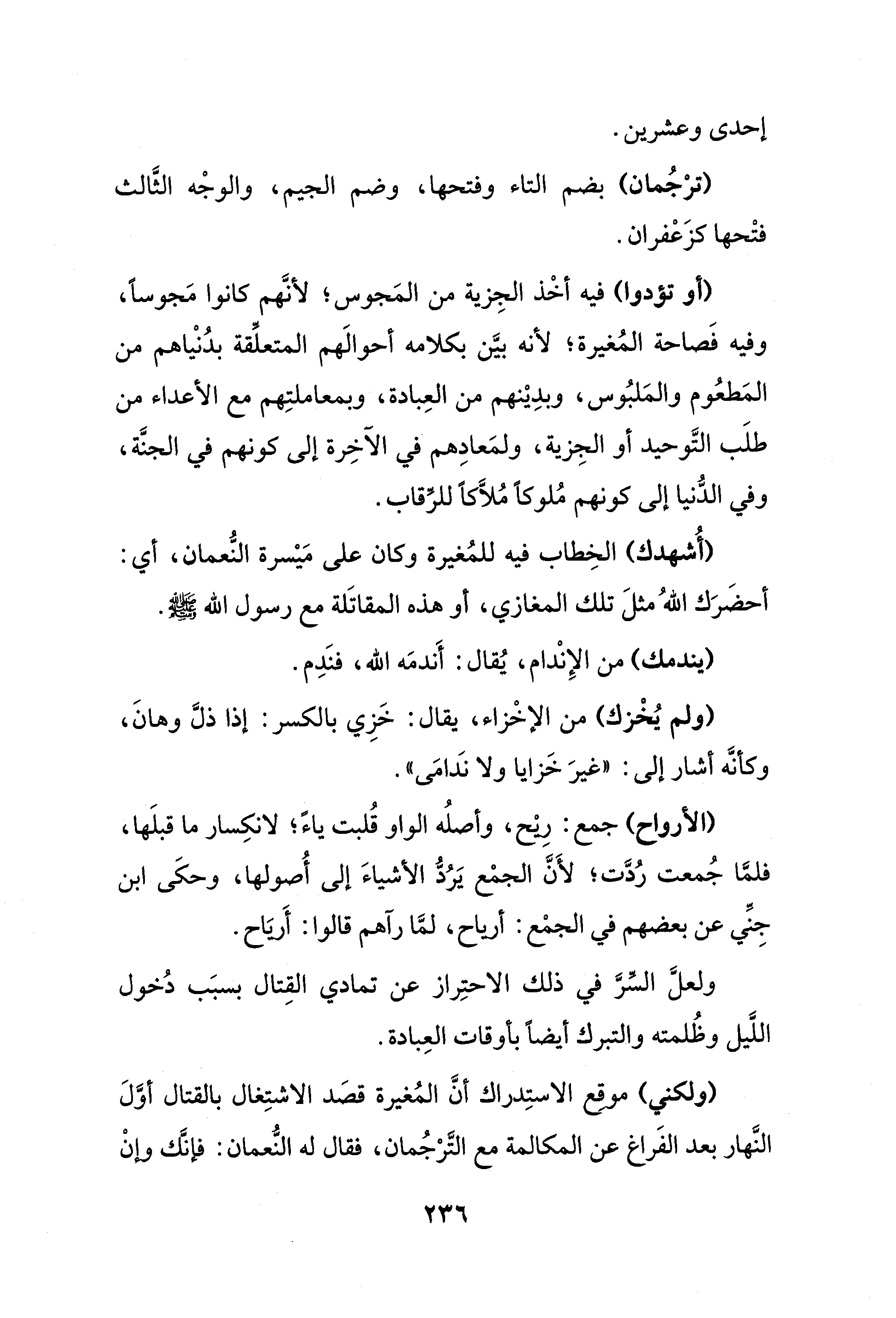(أو تؤدوا) فيه أخْذ الجِزية من المَجوس؛ لأنَّهم كانوا مَجوسًا، وفيه فَصاحة المُغيرة؛ لأنه بيَّن بكلامه أحوالَهم المتعلِّقة بدُنْياهم من المَطعُوم والمَلبُوس، وبدِيْنهم من العِبادة، وبمعاملتِهم مع الأعداء من طلَب التَّوحيد أو الجِزية، ولمَعادِهم في الآخِرة إلى كونهم في الجنَّة، وفي الدُّنيا إلى كونهم مُلوكًا مُلَّاكًا للرِّقاب.