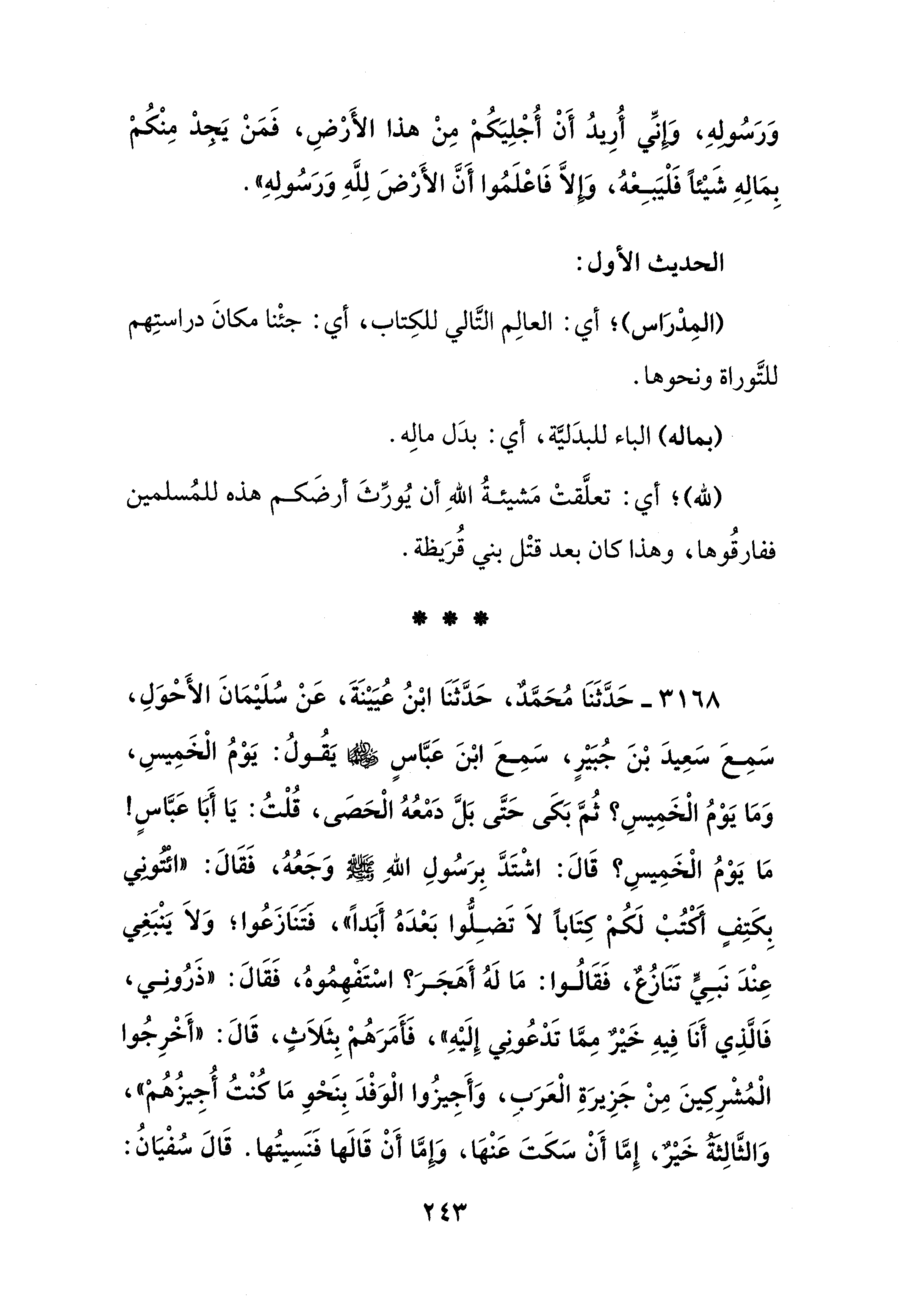 3168 - حَدَّثَنَا مُحَمَّدٌ، حَدَّثَنَا ابْنُ عُيَيْنَةَ، عَنْ سُلَيْمَانَ الأَحْوَلِ، سَمِعَ سَعِيدَ بْنَ جُبَيْرٍ، سَمِعَ ابْنَ عَبَّاسٍ - رضي الله عنهما - يَقُولُ: يَوْمُ الْخَمِيسِ، وَمَا يَوْمُ الْخَمِيسِ؟ ثُمَّ بَكَى حَتَّى بَلَّ دَمْعُهُ الْحَصَى، قُلْتُ: يَا أَبَا عَبَّاسٍ! مَا يَوْمُ الْخَمِيسِ؟ قَالَ: اشْتَدَّ بِرَسُولِ اللهِ - صلى الله عليه وسلم - وَجَعُهُ، فَقَالَ: "ائْتُونِي بِكَتِفٍ أَكْتُبْ لَكُمْ كِتَابًا لا تَضِلُّوا بَعْدَهُ أَبَدًا"، فتنَازَعُوا؛ وَلَا يَنْبَغِي عِنْدَ نبَيٍّ تَنَازُعٌ، فَقَالُوا: مَا لَهُ أَهَجَرَ؟ اسْتَفْهِمُوهُ، فَقَالَ: "ذَرُونِي، فَالَّذِي أَنَا فِيهِ خَيْرٌ مِمَّا تَدْعُونِي إِلَيْهِ"، فَأَمَرَهُمْ بِثَلَاثٍ، قَالَ: "أَخْرِجُوا الْمُشْرِكينَ مِنْ جَزِيرَةِ الْعَرَبِ، وَأَجِيزُوا الْوَفْدَ بِنَحْوِ مَا كُنْتُ أُجِيزُهُمْ"، وَالثَّالِثةُ خَيْرٌ، إِمَّا أَنْ سَكَتَ عَنْهَا، وَإمَّا أَنْ قَالَها فَنَسِيتُها. قَالَ سُفْيَانُ: