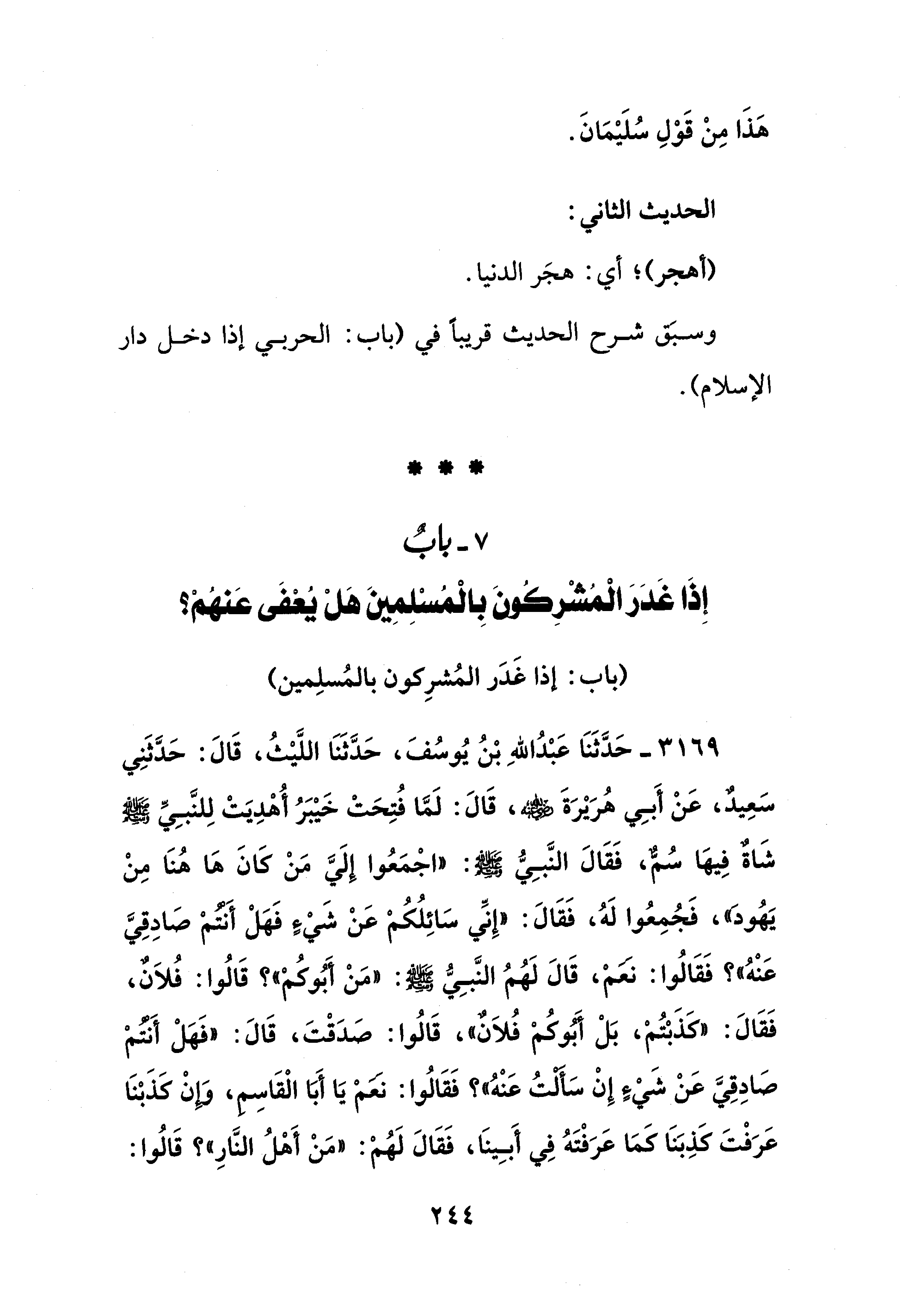 3169 - حَدَّثَنَا عَبْدُ اللهِ بْنُ يُوسُفَ، حَدَّثَنَا اللَّيْثُ، قَالَ: حَدَّثَنِي سَعِيدٌ، عَنْ أَبِي هُرَيْرَةَ - رضي الله عنه -، قَالَ: لَمَّا فُتِحَتْ خَيْبَرُ أُهْدِيَتْ لِلنَّبِيِّ - صَلَّى الله عَلَيْهِ وَسَلَّمَ - شَاةٌ فِيهَا سُمٌّ، فَقَالَ النَّبِيُّ - صَلَّى الله عَلَيْهِ وَسَلَّمَ -: "اجْمَعُوا إِلَيَّ مَنْ كَانَ هَا هُنَا مِنْ يَهُودَ"، فَجُمِعُوا لَهُ، فَقَالَ: "إِنِّي سَائِلُكُمْ عَنْ شَيْءٍ فَهَلْ أَنتمْ صَادِقِيَّ عَنْهُ"؟ فَقَالُوا: نعمْ، قَالَ لَهُمُ النَّبِيُّ - صَلَّى الله عَلَيْهِ وَسَلَّمَ -: "مَنْ أَبُوكُمْ"؟ قَالُوا: فُلَانٌ، فَقَالَ: "كَذَبْتُمْ، بَلْ أَبُوكُمْ فُلَانٌ"، قَالُوا: صَدَقْتَ، قَالَ: "فَهَلْ أَنتمْ صَادِقِيَّ عَنْ شَيْءٍ إِنْ سَأَلْتُ عَنْهُ"؟ فَقَالُوا: نعمْ يَا أَبَا الْقَاسِمِ، وَإِنْ كَذَبْنَا عَرَفْتَ كَذِبَنَا كمَا عَرَفْتَهُ فِي أَبِينَا، فَقَالَ لَهُمْ: "مَنْ أَهْلُ النَّارِ"؟ قَالُوا: