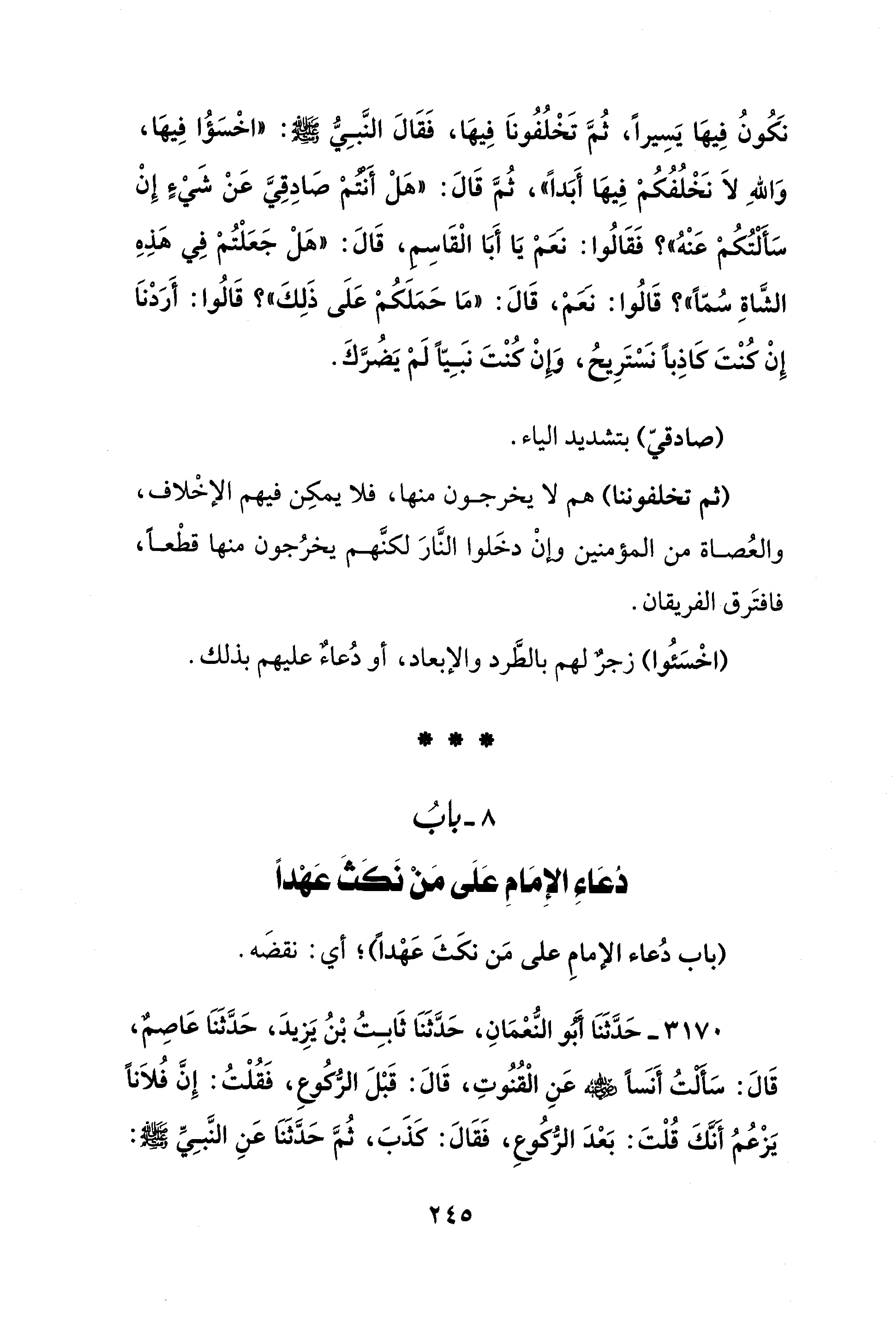 3170 - حَدَّثَنَا أَبُو النُّعْمَانِ، حَدَّثَنَا ثَابِتُ بْنُ يَزِيدَ، حَدَّثَنَا عَاصِمٌ، قَالَ: سَأَلْتُ أَنَسًا - رضي الله عنه - عَنِ الْقُنُوتِ، قَالَ: قَبْلَ الرُّكُوعِ، فَقُلْتُ: إِنَّ فُلَانًا يَزْعُمُ أنَّكَ قُلْتَ: بَعْدَ الرُّكُوعِ، فَقَالَ: كَذَبَ، ثُمَّ حَدَّثَنَا عَنِ النَّبِيِّ - صَلَّى الله عَلَيْهِ وَسَلَّمَ -: