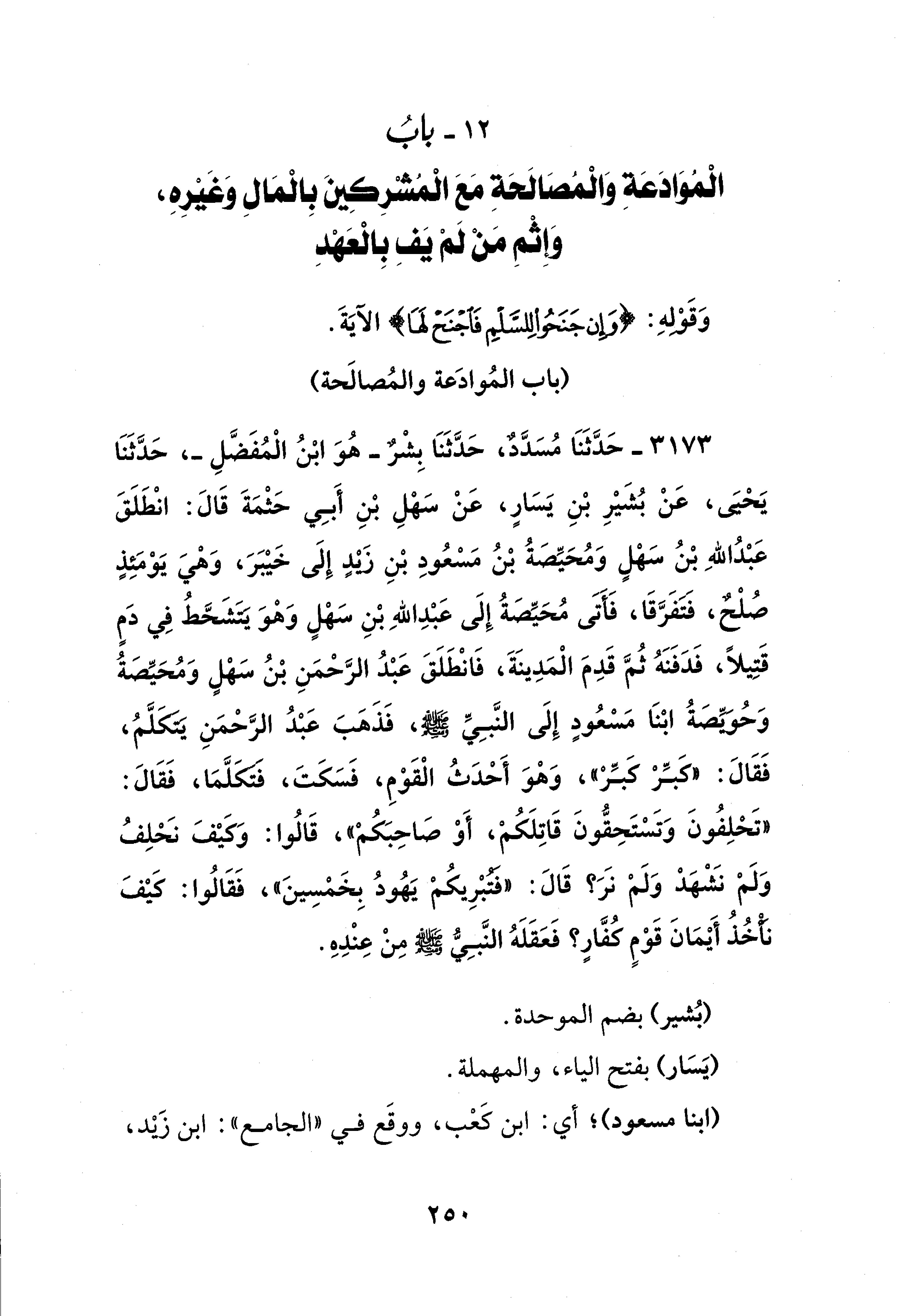 3173 - حَدَّثَنَا مُسَدَّدٌ، حَدَّثَنَا بِشْرُ -هُوَ ابْنُ الْمُفَضَّلِ-، حَدَّثَنَا يَحْيَى، عَنْ بُشَيْرِ بْنِ يَسَارٍ، عَنْ سَهْلِ بْنِ أَبِي حَثْمَةَ قَالَ: انْطَلَقَ عَبْدُ اللهِ بْنُ سَهْلٍ وَمُحَيِّصَةُ بْنُ مَسْعُودِ بْنِ زيدٍ إِلَى خَيْبَرَ، وَهْيَ يَوْمَئِذٍ صُلْخ، فتفَرَّقَا، فَأَتَى مُحَيِّصَةُ إِلَى عَبْدِ اللهِ بْنِ سَهْلٍ وَهْوَ يَتَشَحَّطُ فِي دَمٍ قَتِيلًا، فَدَفَنَهُ ثُمَّ قَدِمَ الْمَدِينَةَ، فَانْطَلَقَ عَبْدُ الرَّحْمَنِ بْنُ سَهْلٍ وَمُحَيِّصَةُ وَحُوَيِّصَةُ ابْنَا مَسْعُودٍ إِلَى النَّبِيِّ - صلى الله عليه وسلم -، فَذَهَبَ عَبْدُ الرَّحْمَنِ يَتكَلَّمُ، فَقَالَ: "كَبِّرْ كَبِّرْ"، وَهْوَ أَحْدَثُ الْقَوْمِ، فَسَكَتَ، فتكَلَّمَا، فَقَالَ: "تَحْلِفُونَ وَتَسْتَحِقُّونَ قَاتِلَكُمْ، أَوْ صَاحِبَكُمْ"، قَالُوا: وَكيْفَ نَحْلِفُ وَلَمْ نشهَدْ وَلَمْ نَرَ؟ قَالَ: "فَتُبْرِيكُمْ يَهُودُ بِخَمْسِينَ"، فَقَالُوا: كيْفَ نَأْخُذُ أَيْمَانَ قَوْمٍ كُفَّارٍ؟ فَعَقَلَهُ النَّبِيُّ - صَلَّى الله عَلَيْهِ وَسَلَّمَ - مِنْ عِنْدِهِ.