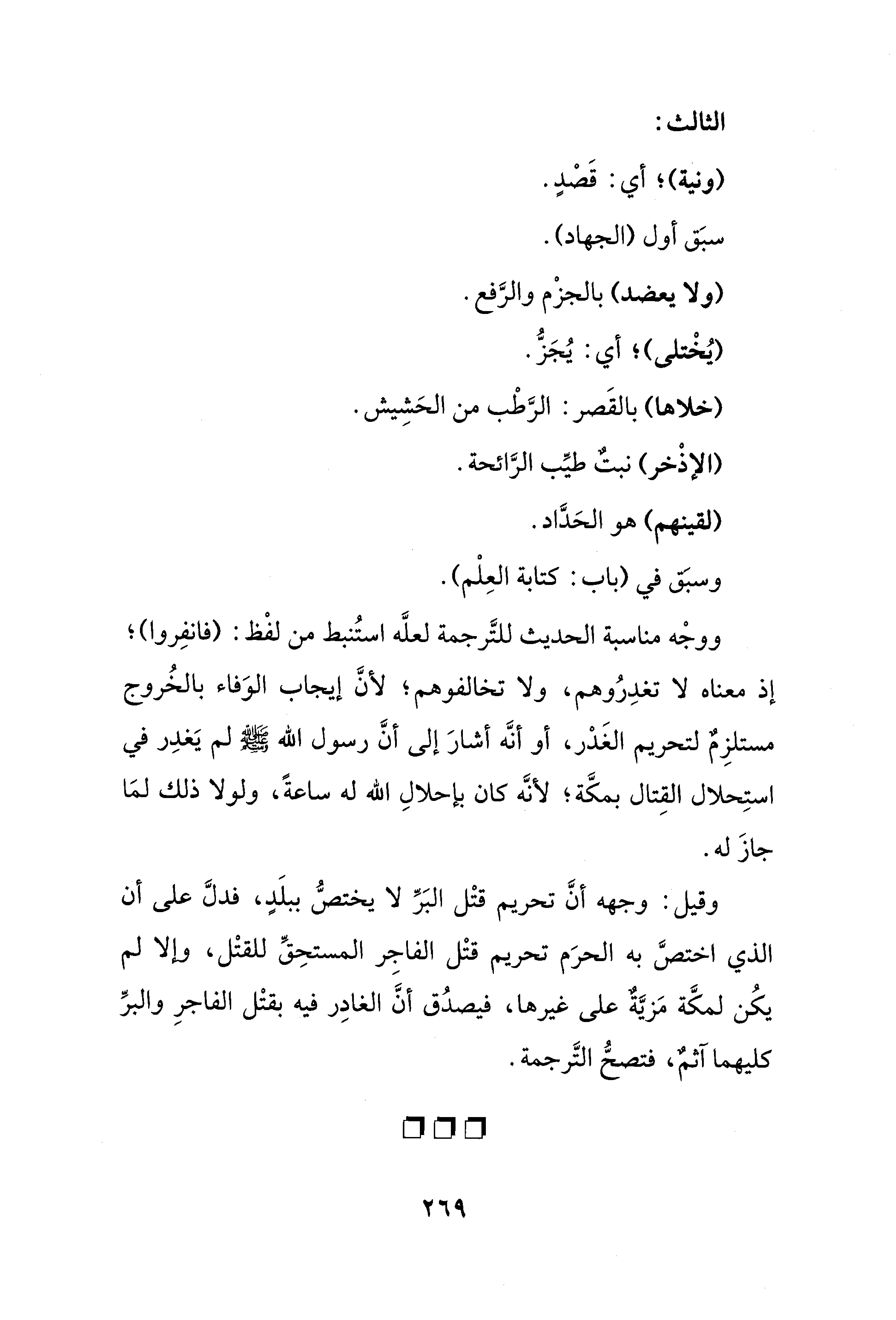 وقيل: وجهه أنَّ تحريم قتْل البَرِّ لا يختصُّ ببلَدٍ، فدلَّ على أن الذي اختصَّ به الحرَم تحريم قتْل الفاجِر المستحِقِّ للقتْل، وإلا لم يكُن لمكَّة مَزيَّةٌ على غيرها، فيصدُق أنَّ الغادِر فيه بقتْل الفاجرِ والبرِّ كليهما آثمٌ، فتصحُّ التَّرجمة.