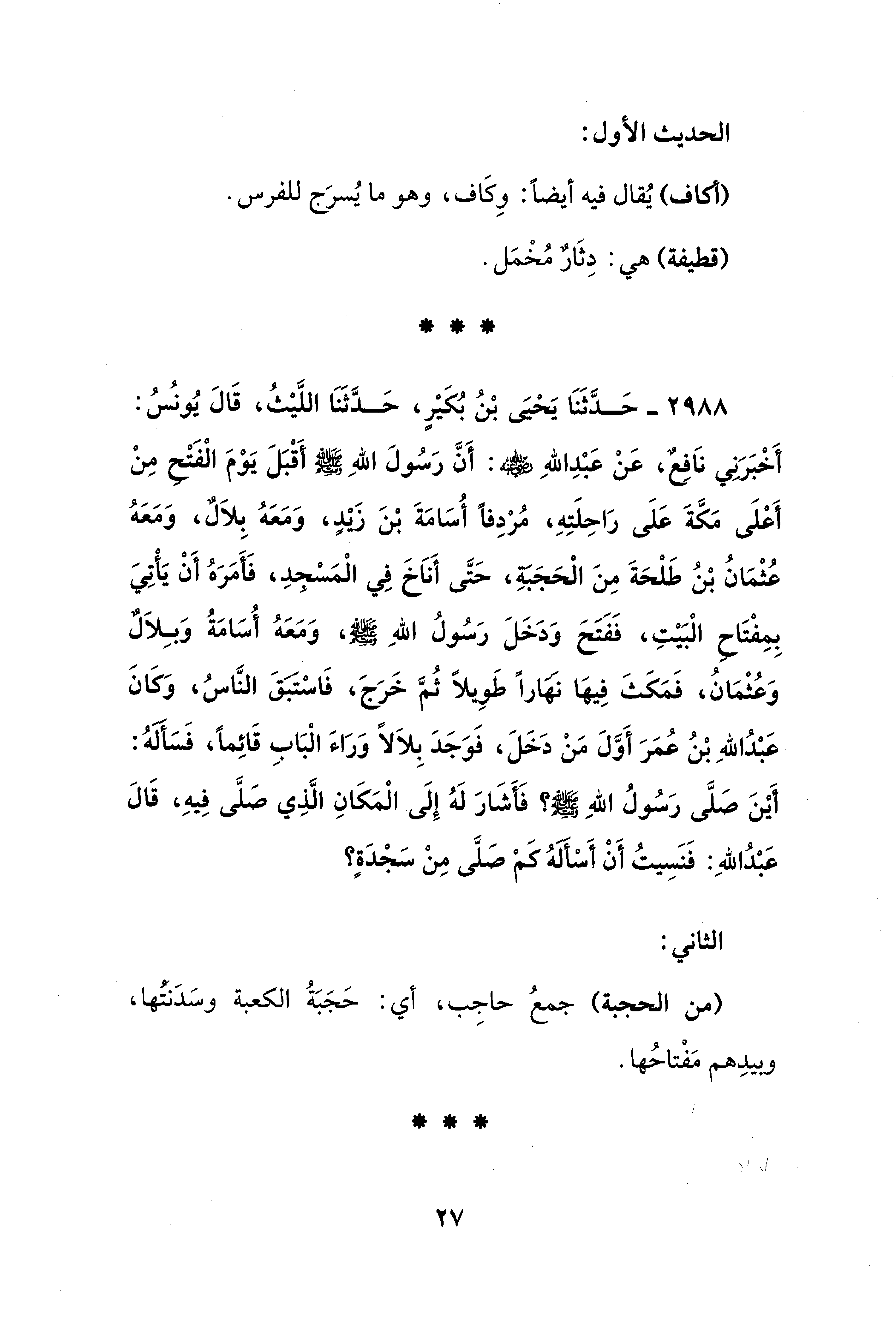 2988 - حَدَّثَنَا يَحْيَى بْنُ بُكَيْرٍ، حَدَّثَنَا اللَّيْثُ، قَالَ يُونس: أَخْبَرَنِي نَافِعٌ، عَنْ عَبْدِ اللهِ - رضي الله عنه -: أَنَّ رَسُولَ اللهِ - صلى الله عليه وسلم - أَقْبَلَ يَوْمَ الْفَتْحِ مِنْ أَعْلَى مَكَّةَ عَلَى رَاحِلَتِهِ، مُرْدِفًا أُسَامَةَ بْنَ زَيْدٍ، وَمَعَهُ بِلاَلٌ، وَمَعَهُ عُثْمَانُ بْنُ طَلْحَةَ مِنَ الْحَجَبَةِ، حَتَّى أَناَخَ فِي الْمَسْجدِ، فَأَمَرَهُ أَنْ يَأْتِيَ بِمِفْتَاحِ الْبَيْتِ، فَفَتَحَ وَدَخَلَ رَسُولُ اللهِ - صلى الله عليه وسلم -، وَمَعَهُ أُسَامَةُ وَبِلاَلٌ وَعُثْمَانُ، فَمَكَثَ فِيهَا نَهَارًا طَوِيلًا ثُمَّ خَرَجَ، فَاسْتَبَقَ النَّاسُ، وَكَانَ عَبْدُ اللهِ بْنُ عُمَرَ أَوَّلَ مَنْ دَخَلَ، فَوَجَدَ بِلاَلًا وَرَاءَ الْبَابِ قَائِمًا، فَسَأَلَهُ: أَيْنَ صَلَّى رَسُولُ اللهِ - صلى الله عليه وسلم -؟ فَأَشَارَ لَهُ إِلَى الْمَكَانِ الَّذِي صَلَّى فِيهِ، قَالَ عَبْدُ اللهِ: فَنَسِيتُ أَنْ أَسْأَلَهُ كَمْ صَلَّى مِنْ سَجْدَةٍ؟
