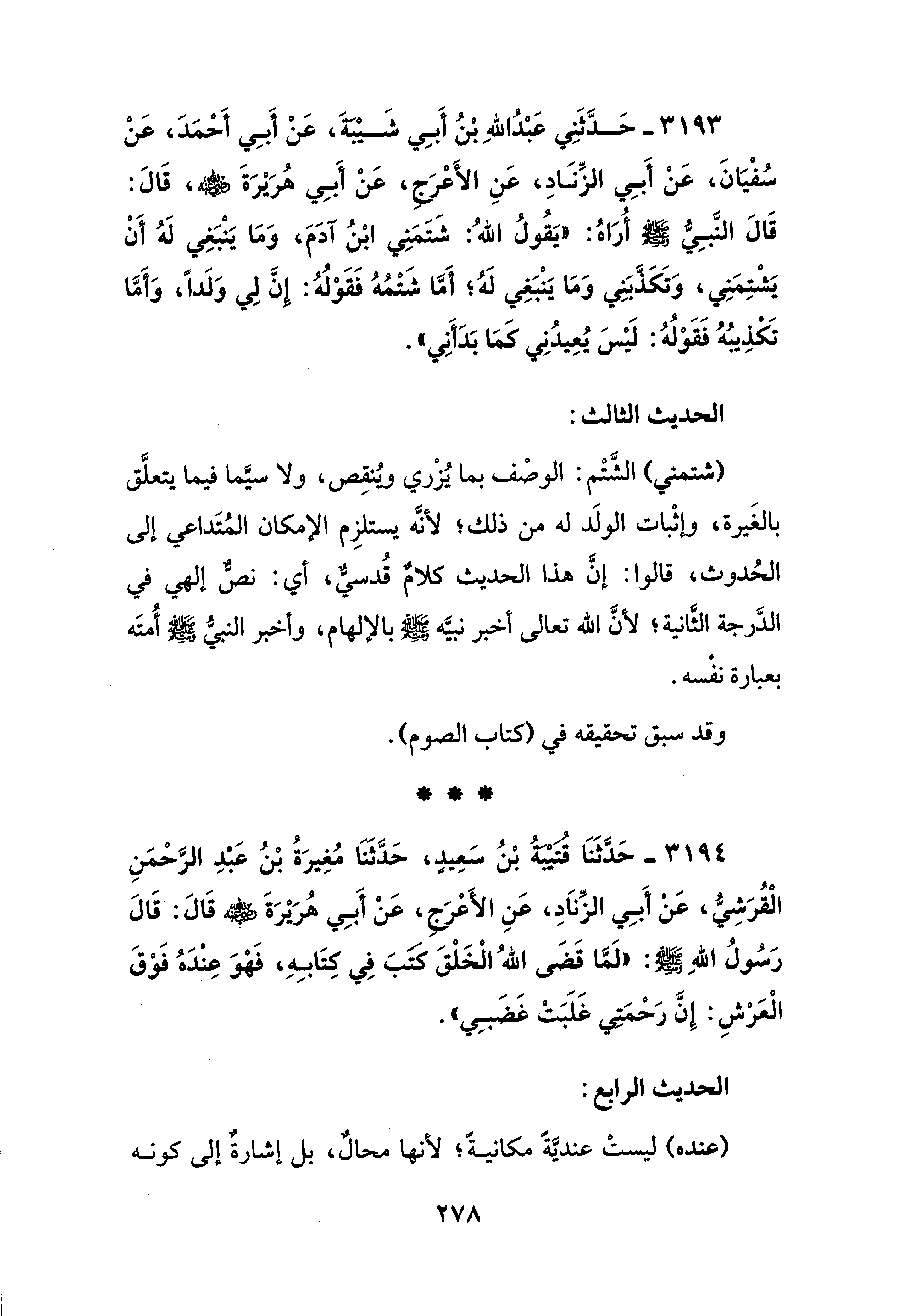 3193 - حَدَّثَنِي عَبْدُ اللهِ بْنُ أَبِي شَيْبَةَ، عَنْ أَبِي أَحْمَدَ، عَنْ سُفْيَانَ، عَنْ أَبِي الزِّنَادِ، عَنِ الأَعْرَج، عَنْ أَبِي هُرَيْرَةَ -رَضِيَ اللهُ عَنْهُ-، قَالَ: قَالَ النَّبِيُّ -صَلَّى اللهُ عَلَيْهِ وَسَلَّمَ- أُرَاهُ: "يَقُولُ اللهُ: شَتَمَنِي ابْنُ آدَمَ، وَمَا يَنْبَغِي لَهُ أَنْ يَشْتِمَنِي، وَتَكَذَّبَنِي وَمَا يَنْبَغِي لَهُ؛ أَمَّا شَتْمُهُ فَقَوْلُهُ: إنَّ لِي وَلَدًا، وَأَمَّا تَكْذِيبُهُ فَقَوْلُهُ: لَيْسَ يُعِيدُنِي كَمَا بَدَأَنِي".