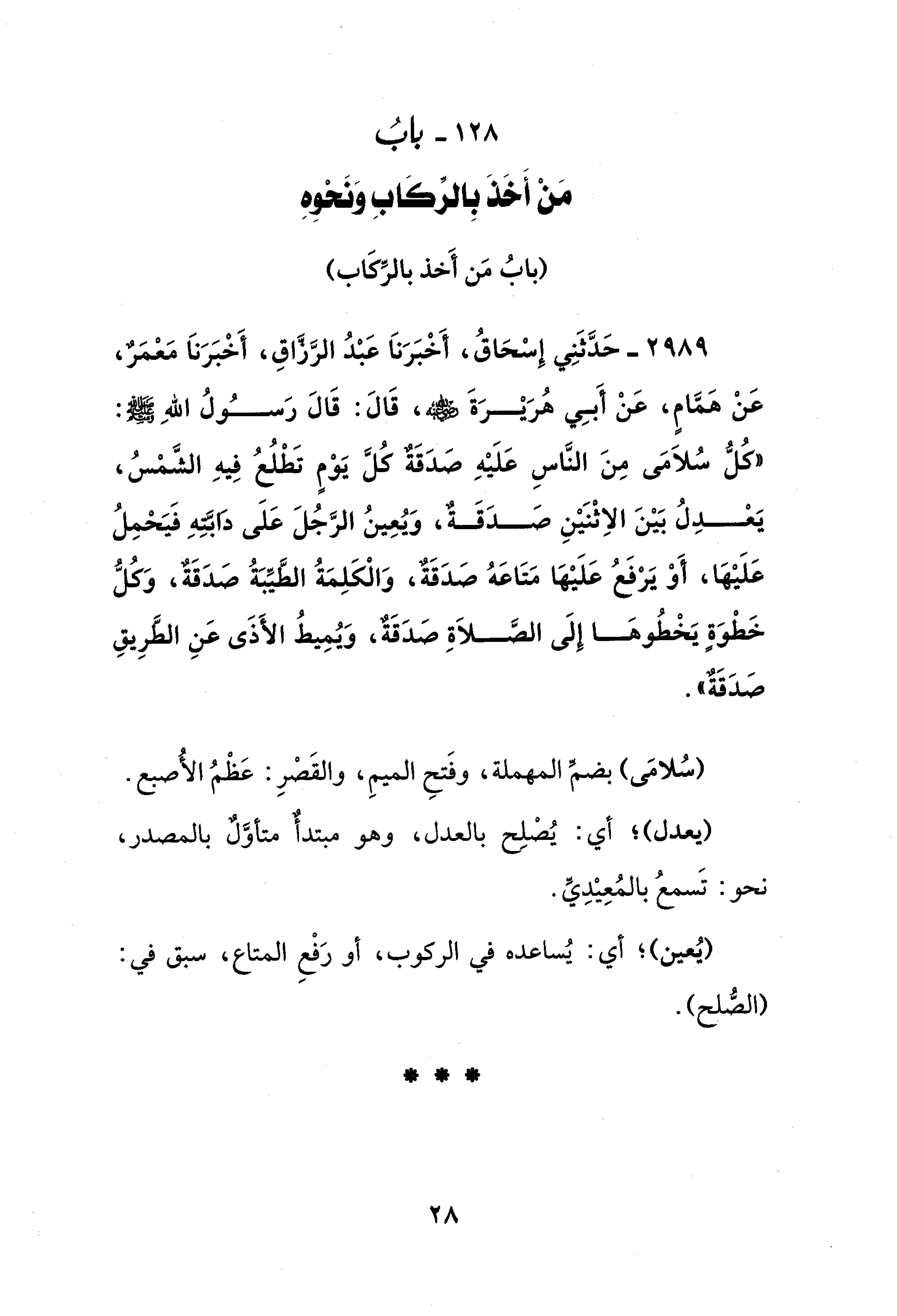 2989 - حَدَّثَنِي إِسْحَاقُ، أَخْبَرَنَا عَبْدُ الرَّزَّاقِ، أَخْبَرَنَا مَعْمَرٌ، عَنْ هَمَّامٍ، عَنْ أَبِي هُرَيْرَةَ - صلى الله عليه وسلم -، قَالَ: قَالَ رَسُولُ اللهِ - صلى الله عليه وسلم -: "كُلُّ سُلاَمَى مِنَ النَّاسِ عَلَيْهِ صَدَقَةٌ كُلَّ يَوْمٍ تَطْلُعُ فِيهِ الشَّمْسُ، يَعْدِلُ بَيْنَ الاِثْنَيْنِ صَدَقَةٌ، وَيُعِينُ الرَّجُلَ عَلَى دَابَّتِهِ فَيَحْمِلُ عَلَيْهَا، أَوْ يَرْفَعُ عَلَيْهَا مَتَاعَهُ صَدَقَةٌ، وَالْكَلِمَةُ الطَّيِّبَةُ صَدَقَةٌ، وَكُلُّ خَطْوَةٍ يَخْطُوهَا إِلَى الصَّلاَةِ صَدَقَةٌ، وَيُمِيطُ الأَذَى عَنِ الطَّرِيقِ صَدَقَةٌ".