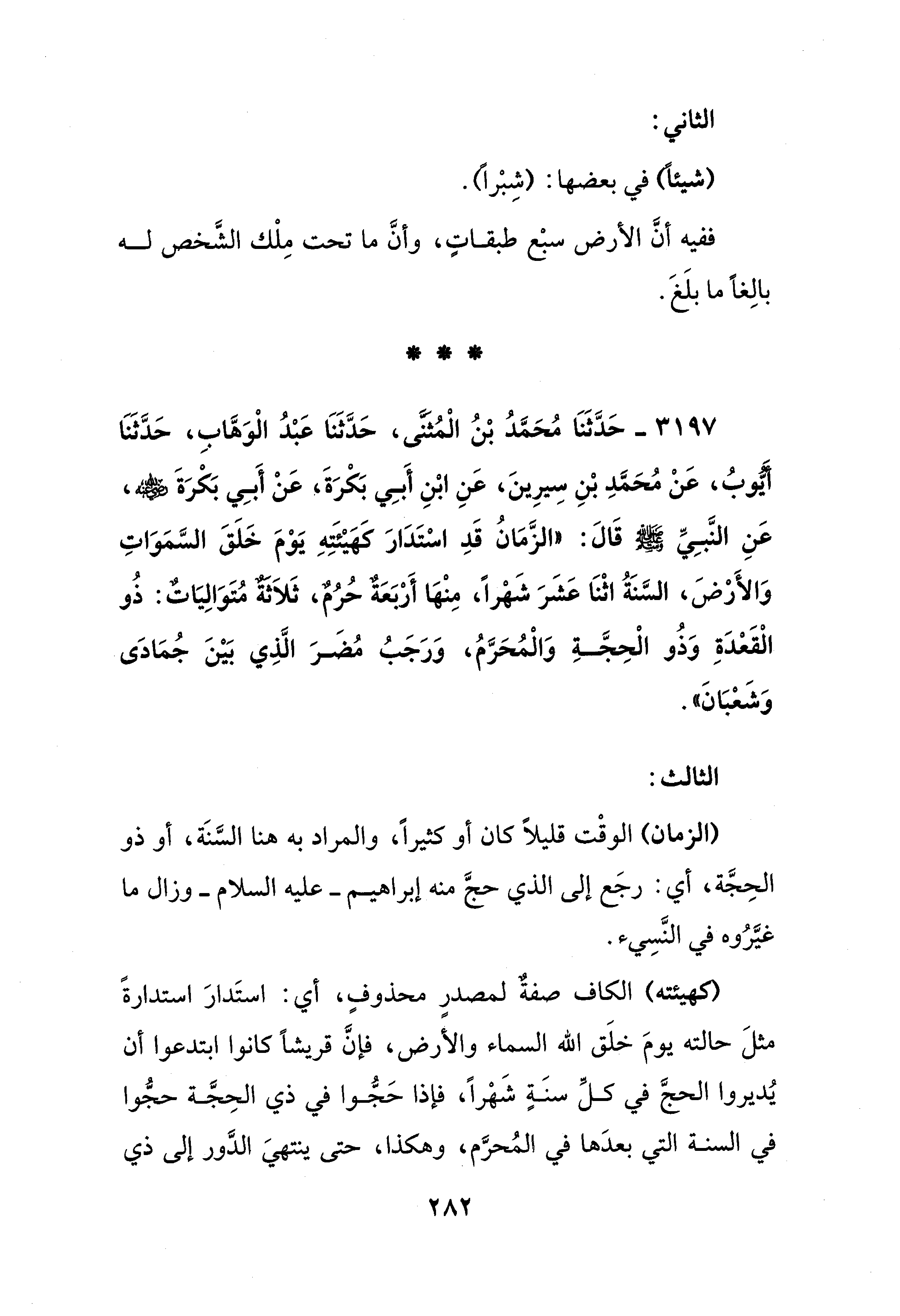 (كهيئته) الكاف صفة لمصدرٍ محذوفٍ، أي: استَدارَ استدارةً مثلَ حالته يومَ خلَق الله السماء والأرض، فإنَّ قريشًا كانوا ابتدعوا أن يُديروا الحجَّ في كلِّ سنَةٍ شَهْرًا، فإذا حَجُّوا في ذي الحِجَّة حجُّوا في السنة التي بعدَها في المُحرَّم، وهكذا، حتَّى ينتهيَ الدَّور إلى ذي