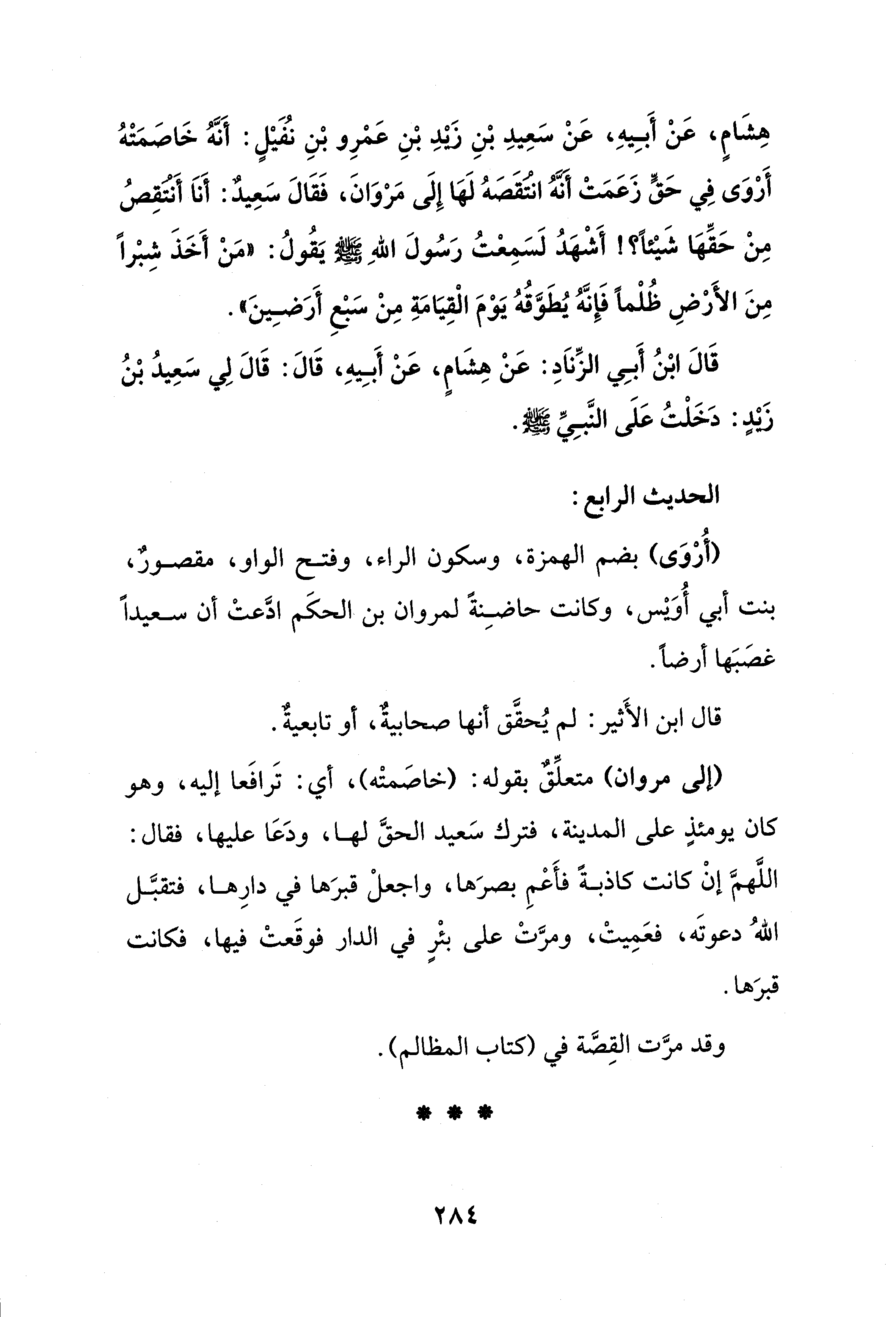 هِشَامٍ، عَنْ أَبِيهِ، عَنْ سَعِيدِ بْنِ زيدِ بْنِ عمرِو بْنِ نُفَيْلٍ: أنَّهُ خَاصَمَتْهُ أَروَى فِي حَقٍّ زَعَمَتْ أنه انتُقَصَهُ لَهَا إِلَى مروَانَ، فَقَالَ سَعِيدٌ: أَناَ أَنتُقِصُ مِنْ حَقِّهَا شَيْئًا؟ أَشْهَدُ لَسَمعتُ رَسُولَ اللهِ - صلى الله عليه وسلم - يَقُولُ: "مَنْ أَخَذَ شِبْرًا مِنَ الأَرْضِ ظُلْمًا فَإِنَّهُ يُطَوَّقُهُ يَوْمَ الْقِيَامَةِ مِنْ سَبع أَرَضِينَ".