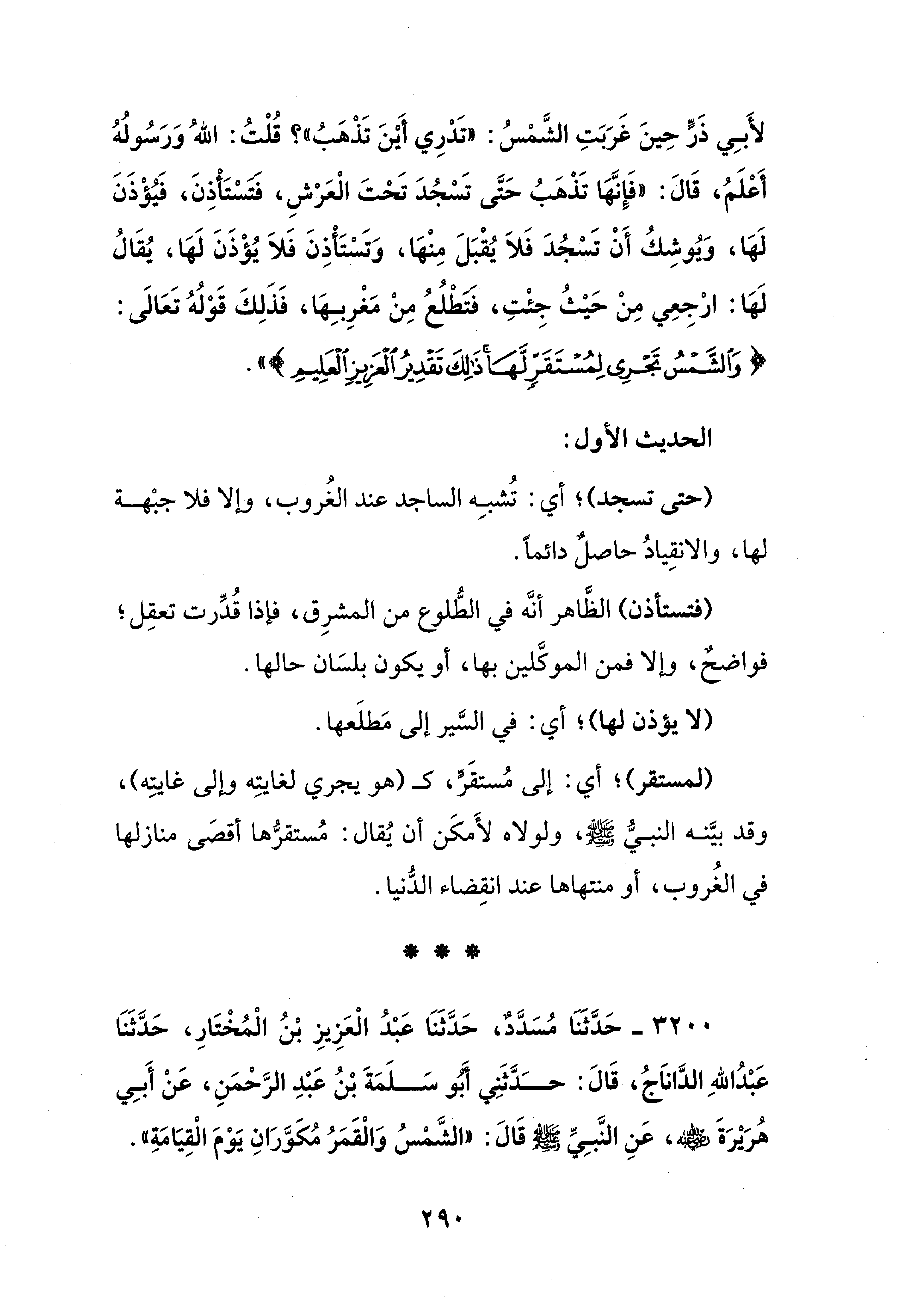 3200 - حَدَّثَنَا مُسَدَّدٌ، حَدَّثَنَا عَبْدُ الْعَزِيزِ بْنُ الْمُخْتَارِ، حَدَّثَنَا عَبْدُ اللهِ الدَّاناَجُ، قَالَ: حَدَّثَنِي أبو سَلَمَةَ بْنُ عَبْدِ الرحمَنِ، عَنْ أَبِي هُرَيْرَةَ - رضي الله عنه -، عَنِ النَّبِيِّ - صلى الله عليه وسلم - قَالَ: "الشَّمسُ وَالْقَمَرُ مُكَوَّرَانِ يَوْمَ الْقِيَامَةِ".