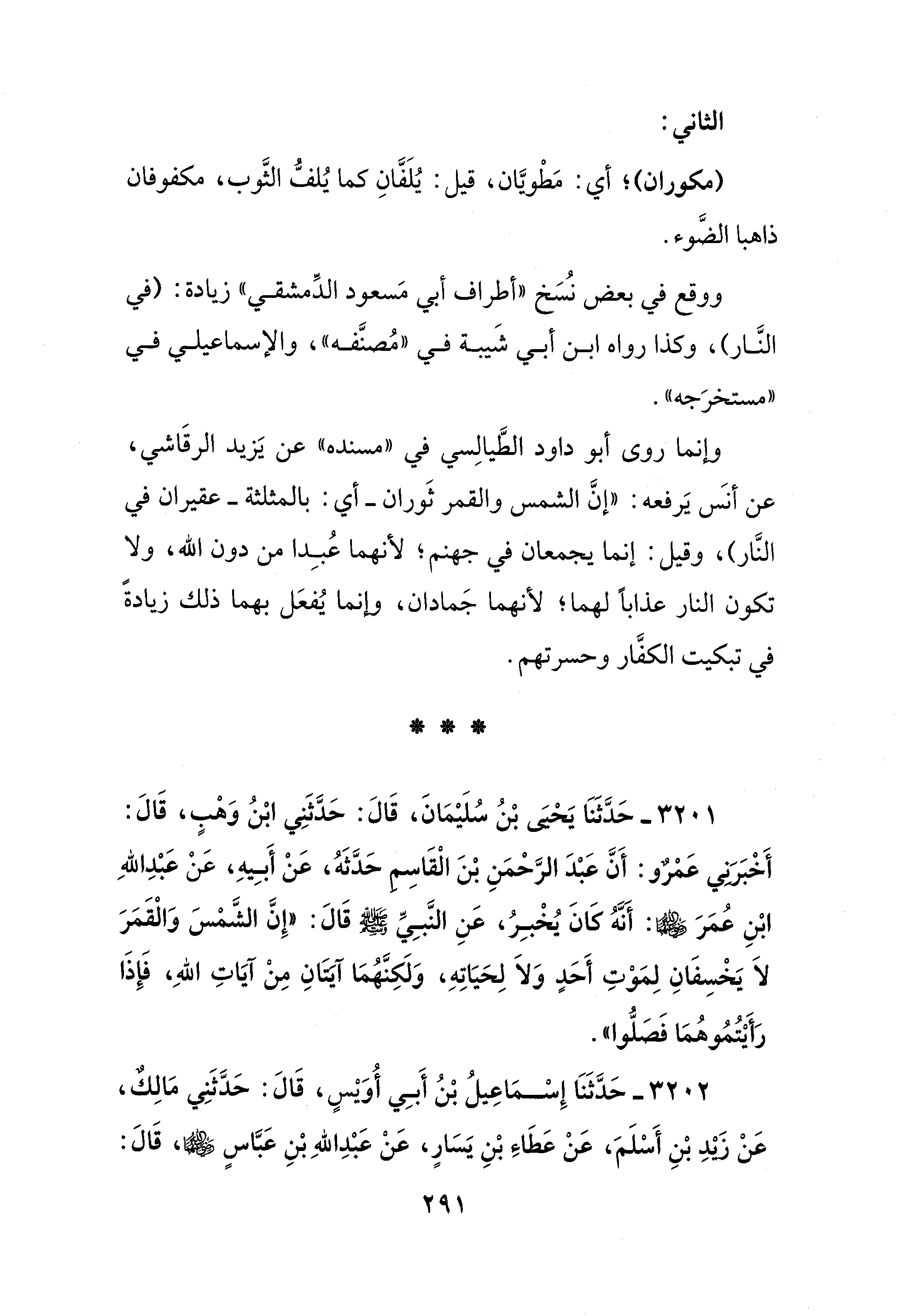 وإنما روى أبو داود الطَّيالِسي في "مسنده" عن يَزيد الرقَاشي، عن أنَس يَرفعه: "إنَّ الشمس والقمر ثَوران -أي: بالمثلثة- عقيران في النَّار"، وقيل: إنما يجمعان في جهنم؛ لأنهما عُبِدا من دون الله، ولا تكون النار عذابًا لهما؛ لأنهما جَمادان، وإنما يُفعَل بهما ذلك زيادةً في تبكيت الكفَّار وحسرتهم.