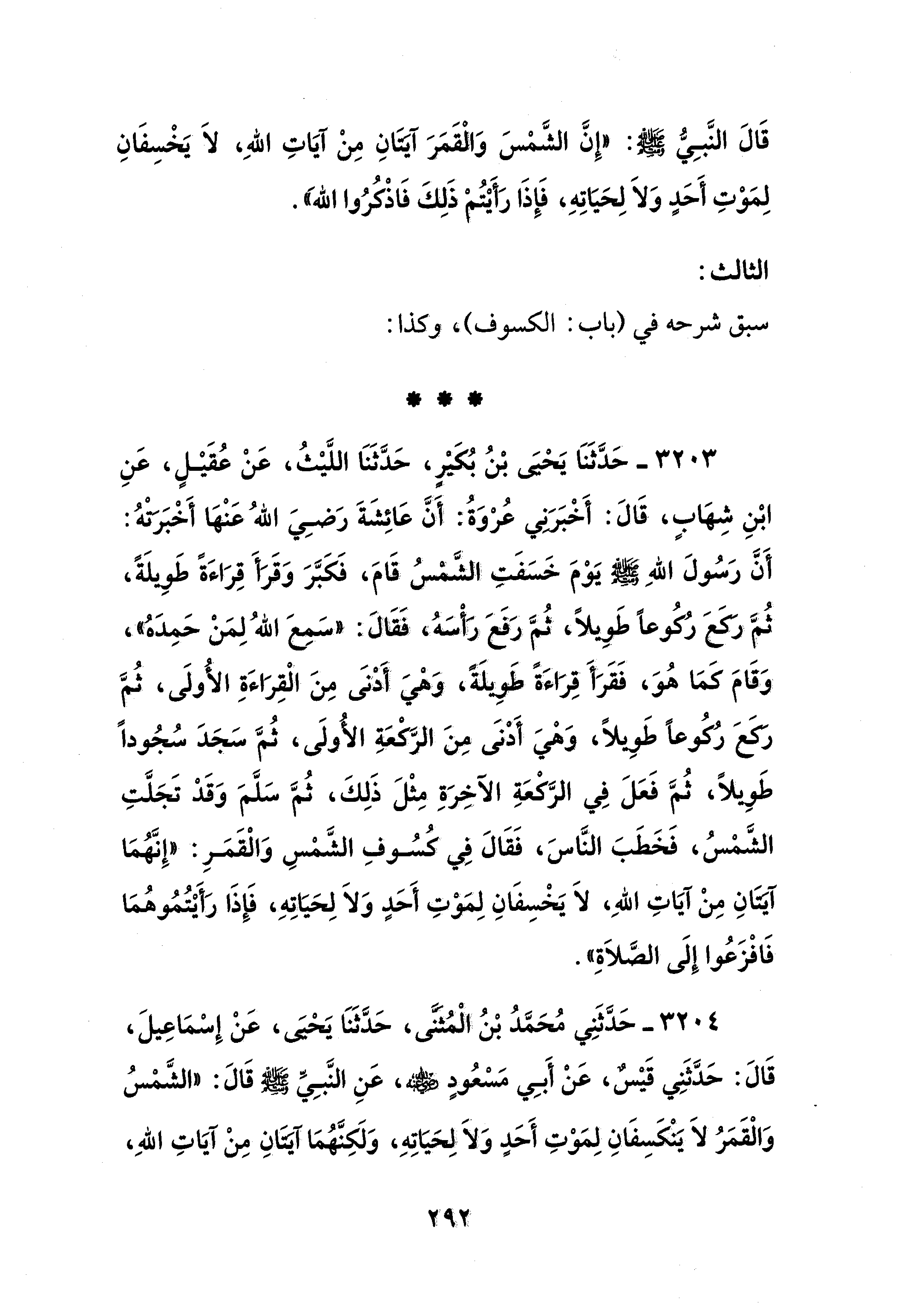 3203 - حَدَّثَنَا يحيَى بْنُ بُكَير، حَدَّثَنَا اللَّيْثُ، عَنْ عُقَيْلٍ، عَنِ ابْنِ شِهَابٍ، قَالَ: أَخْبَرَني عُروة: أَنَّ عَائِشَةَ رَضِيَ اللهُ عَنْهَا أَخْبَرتْهُ: أَنَّ رَسُولَ اللهِ - صلى الله عليه وسلم - يَوْمَ خَسَفَتِ الشَمسُ قَامَ، فَكَبَّرَ وَقَرَأَ قِرَاءَة طَوِيلَةً، ثُمَّ ركعَ رُكُوعًا طَوِيلًا، ثُمَّ رَفَعَ رَأسهُ، فَقَالَ: "سَمِعَ اللهُ لِمَنْ حَمِدَه"، وَقَامَ كَمَا هُوَ، فَقَرَأَ قِرَاءَةً طوِيلَة، وَهْيَ أَدنىَ مِنَ الْقِرَاءَةِ الأُولَى، ثُمَّ ركعَ رُكُوعًا طَوِيلًا، وَهْيَ أَدْنىَ مِنَ الركْعَةِ الأُولَى، ثُمَّ سَجَدَ سُجُودا طَوِيلًا، ثُمَّ فَعَلَ فِي الرَّكْعَةِ الآخِرَةِ مِثْلَ ذَلِكَ، ثُمَّ سَلَّمَ وَقَد تَجَلَّتِ الشَّمسُ، فَخَطَبَ النَّاسَ، فَقَالَ فِي كُسُوفِ الشمسِ وَالْقَمَرِ: "إِنَّهُمَا آيتَانِ مِنْ آيَاتِ اللهِ، لاَ يَخْسِفَانِ لِمَوْتّ أَحَدٍ وَلاَ لِحَياتِهِ، فَإِذَا رَأَيْتُمُوهُمَا فَافْزَعُوا إلَى الصَّلاَةِ".