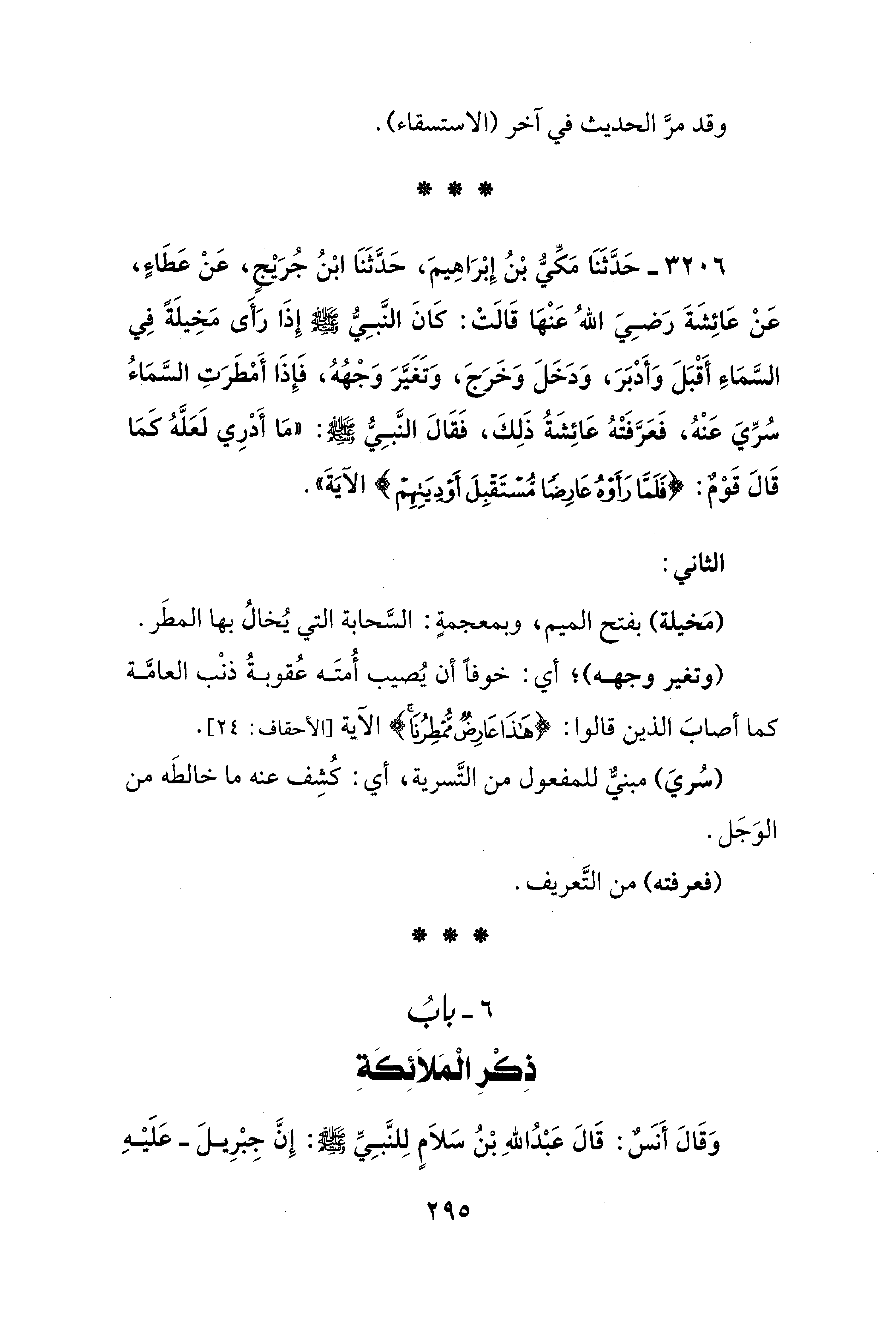 3206 - حَدَّثَنَا مَكِّيُّ بْنُ إِبْرَاهِيمَ، حَدَّثَنَا ابْنُ جُرَيْجٍ، عَنْ عَطَاءٍ، عَنْ عَائِشَةَ رَضِيَ اللهُ عَنْهَا قَالَتْ: كَانَ النَّبِيُّ - صلى الله عليه وسلم - إِذَا رَأَى مَخِيلَةً فِي السَّمَاءِ أَقْبَلَ وَأدبَرَ، وَدَخَلَ وَخَرَجَ، وَتَغَيَّرَ وَجْهُهُ، فَإِذَا أَمطَرَتِ السَّمَاءُ سُرِّيَ عَنْهُ، فَعَرَّفَتْهُ عَائِشَةُ ذَلِكَ، فَقَالَ النَّبِيُّ - صلى الله عليه وسلم -: "مَا أَدرِي لَعَلَّهُ كَمَا قَالَ قَوْمٌ: {فَلَمَّا رَأَوْهُ عَارِضًا مُسْتَقْبِلَ أَوْدِيَتِهِمْ} الآيَة".