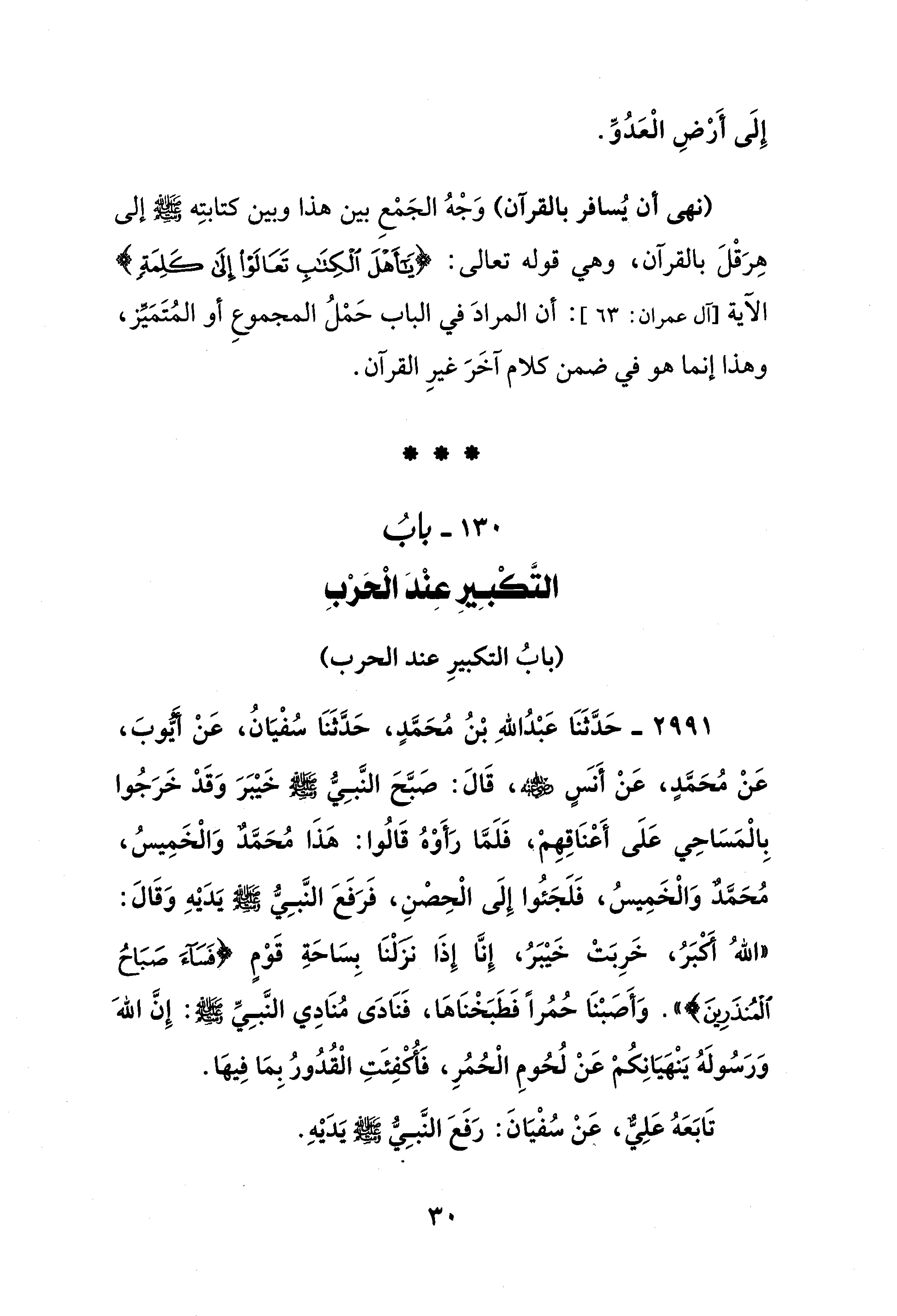 2991 - حَدَّثَنَا عَبْدُ اللهِ بْنُ مُحَمَّدٍ، حَدَّثَنَا سُفْيَانُ، عَنْ أَيُّوبَ، عَنْ مُحَمَّدٍ، عَنْ أَنسٍ - رضي الله عنه -، قَالَ: صَبَّحَ النَّبِيُّ - صلى الله عليه وسلم - خَيْبَرَ وَقَدْ خَرَجُوا بِالْمَسَاحِي عَلَى أَعْنَاقِهِمْ، فَلَمَّا رَأَوْهُ قَالُوا: هَذَا مُحَمَّدٌ وَالْخَمِيسُ، مُحَمَّدٌ وَالْخَمِيسُ، فَلَجَئُوا إِلَى الْحِصْنِ، فَرَفَعَ النَّبِيُّ - صلى الله عليه وسلم - يَدَيْهِ وَقَالَ: "اللهُ أَكْبَرُ، خَرِبَتْ خَيْبَرُ، إِنَّا إِذَا نزَلْنَا بِسَاحَةِ قَوْمٍ {فَسَاءَ صَبَاحُ الْمُنْذَرِينَ} ". وَأَصَبْنَا حُمُرًا فَطَبَخْنَاهَا، فَنَادَى مُنَادِي النَّبِيِّ - صلى الله عليه وسلم -: إِنَّ اللهَ وَرَسُولَهُ يَنْهَيَانِكُمْ عَنْ لُحُومِ الْحُمُرِ، فَأُكْفِئَتِ الْقُدُورُ بِمَا فِيهَا.