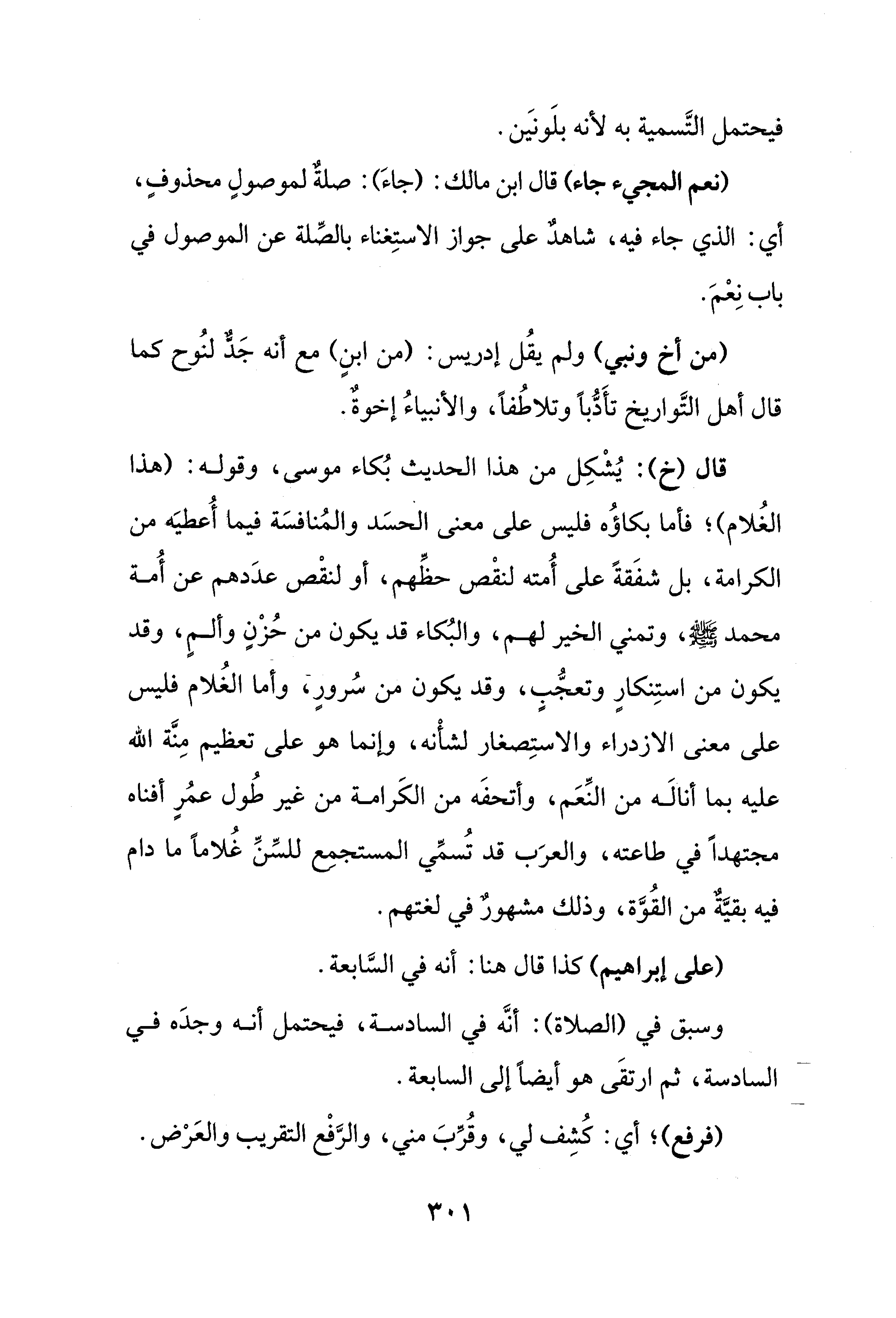 قال (خ): يُشْكِل من هذا الحديث بُكاء موسى، وقوله: (هذا الغُلام)؛ فأما بكاؤُه فليس على معنى الحسَد والمُنافسَة فيما أُعطيَه من الكرامة، بل شفَقةً على أُمته لنقْص حظِّهم، أو لنقْص عدَدهم عن أُمة محمد - صلى الله عليه وسلم -، وتمني الخير لهم، والبُكاء قد يكون من حُزْنٍ وألمٍ، وقد يكون من استِنكارٍ وتعجُّبٍ، وقد يكون من سُرورٍ؛ وأما الغُلام فليس على معنى الازدراء والاستِصغار لشأْنه، وإنما هو على تعظيم مِنَّة الله عليه بما أنالَه من النّعَم، وأتحفَه من الكَرامة من غير طُول عمُرٍ أفناه مجتهدًا في طاعته، والعرَب قد تُسمِّي المستجمِع للسِّنِّ غُلامًا ما دام فيه بقيَّةٌ من القُوَّة، وذلك مشهور في لغتهم.