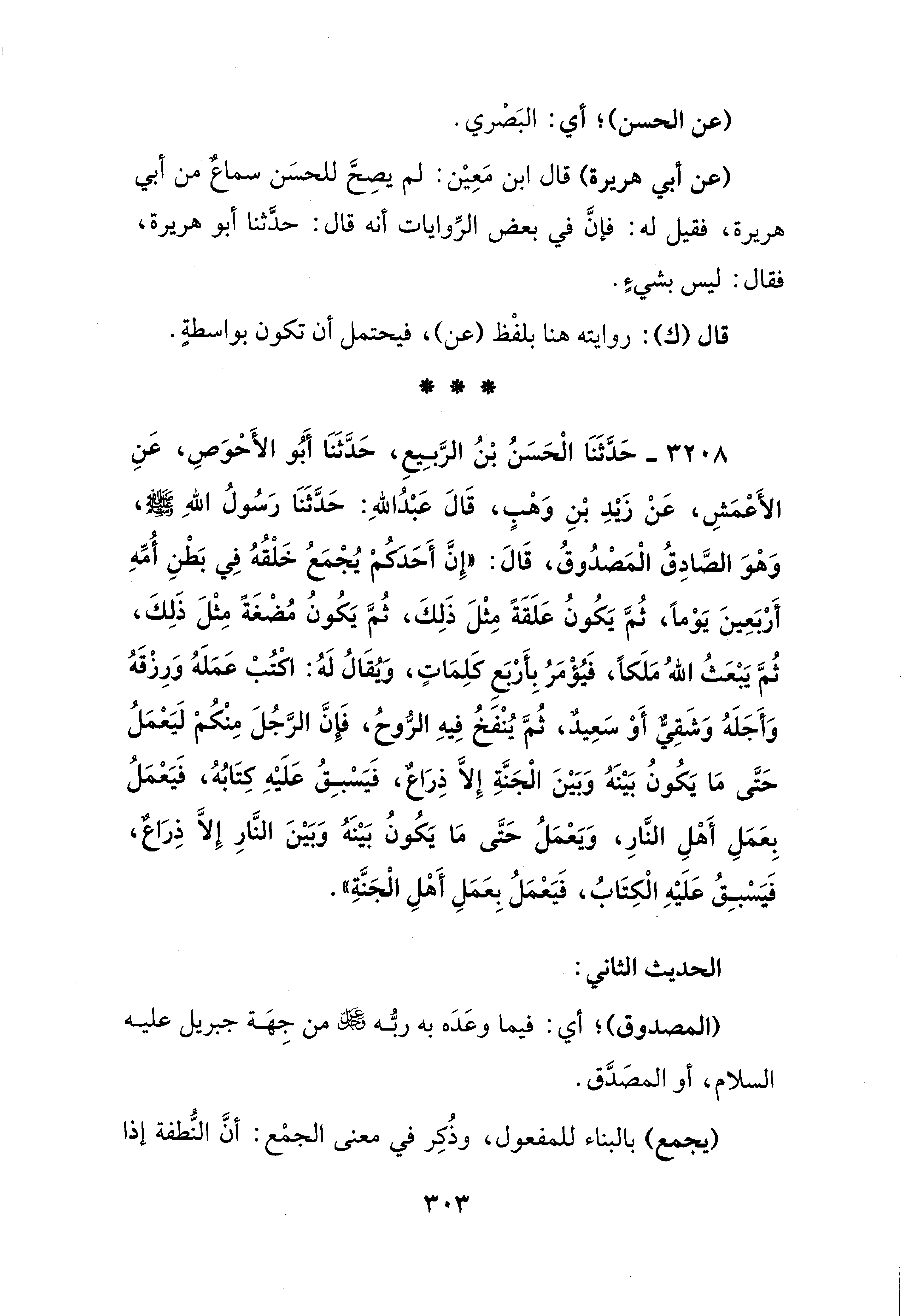 3208 - حَدَّثَنَا الْحَسَنُ بْنُ الرَّبِيعِ، حَدَّثَنَا أَبُو الأَحوَصِ، عَنِ الأَعمَشِ، عَنْ زَيْدِ بْنِ وَهْبٍ، قَالَ عَبْدُ اللهِ: حَدَّثَنَا رَسُولُ اللهِ - صلى الله عليه وسلم -، وَهْوَ الصَّادِقُ الْمصدُوقُ، قَالَ: "إِنَّ أَحَدكم يُجْمَعُ خَلْقُهُ فِي بَطْنِ أُمِّهِ أَربَعِينَ يَوْمًا، ثُمَّ يَكُونُ عَلَقَةً مِثْلَ ذَلِكَ، ثُمَّ يَكُونُ مُضْغَةً مِثْلَ ذَلِكَ، ثُمَّ يَبْعَثُ اللهُ مَلَكًا، فَيُؤْمَرُ بِأربَعٍ كَلِمَاتٍ، ويُقَالُ لَهُ: اكْتُبْ عَمَلَهُ وَرِزْقَهُ وَأَجَلَهُ وَشَقِيٌّ أَوْ سَعِيدٌ، ثُمَّ يُنْفخُ فِيهِ الرُّوحُ، فَإِنَّ الرَّجُلَ مِنْكُم لَيَعمَلُ حَتَّى مَا يَكُونُ بَيْنَهُ وَبَيْنَ الْجَنَّةِ إِلَّا ذِرَاعٌ، فَيَسْبِقُ عَلَيْهِ كِتَابُهُ، فَيَعمَلُ بِعَمَلِ أَهْلِ النَّارِ، وَيَعمَلُ حَتَّى مَا يَكُونُ بَيْنَهُ وَبَيْنَ النَّارِ إِلَّا ذِرَاعٌ، فَيَسْبِقُ عَلَيْهِ الْكِتَابُ، فَيَعمَلُ بِعَمَلِ أَهْلِ الْجَنَّةِ".