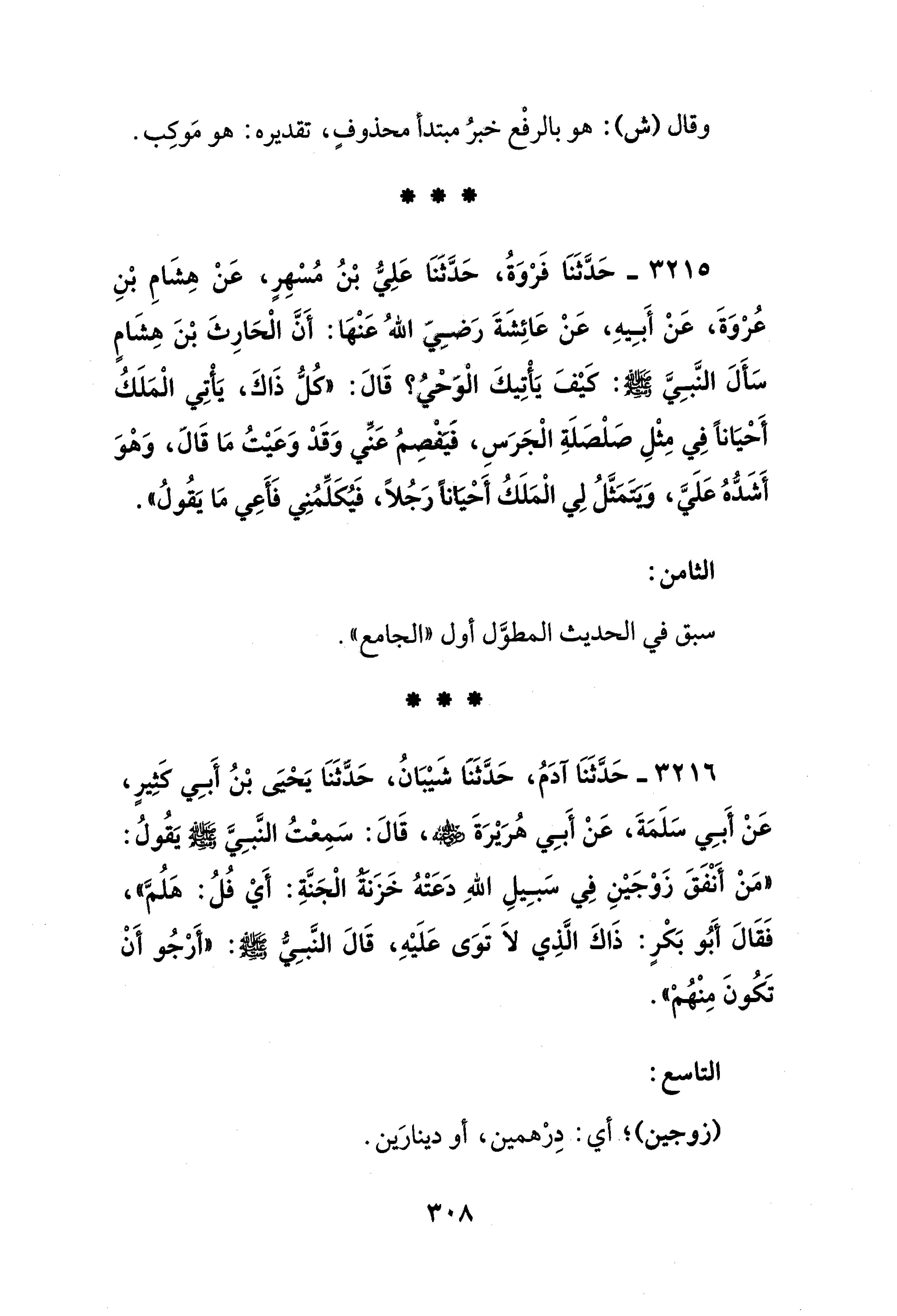 3216 - حَدَّثَنَا آدَمُ، حَدَّثَنَا شَيْبَانُ، حَدَّثَنَا يحيَى بْنُ أَبِي كَثِيرٍ، عَنْ أَبِي سَلَمَةَ، عَنْ أَبِي هُرَيْرَةَ - رضي الله عنه -، قَالَ: سَمعتُ النَّبِيَّ - صلى الله عليه وسلم - يَقُولُ: "مَنْ أَنْفَقَ زَوْجَيْنِ فِي سَبِيلِ اللهِ دَعَتْهُ خَزَنةُ الْجَنَّةِ: أَيْ فُلُ: هَلُمَّ"، فَقَالَ أَبُو بَكْرٍ: ذَاكَ الَّذِي لاَ تَوَى عَلَيْهِ، قَالَ النَّبِيُّ - صلى الله عليه وسلم -: "أرجُو أَنْ تَكُونَ مِنْهم".
