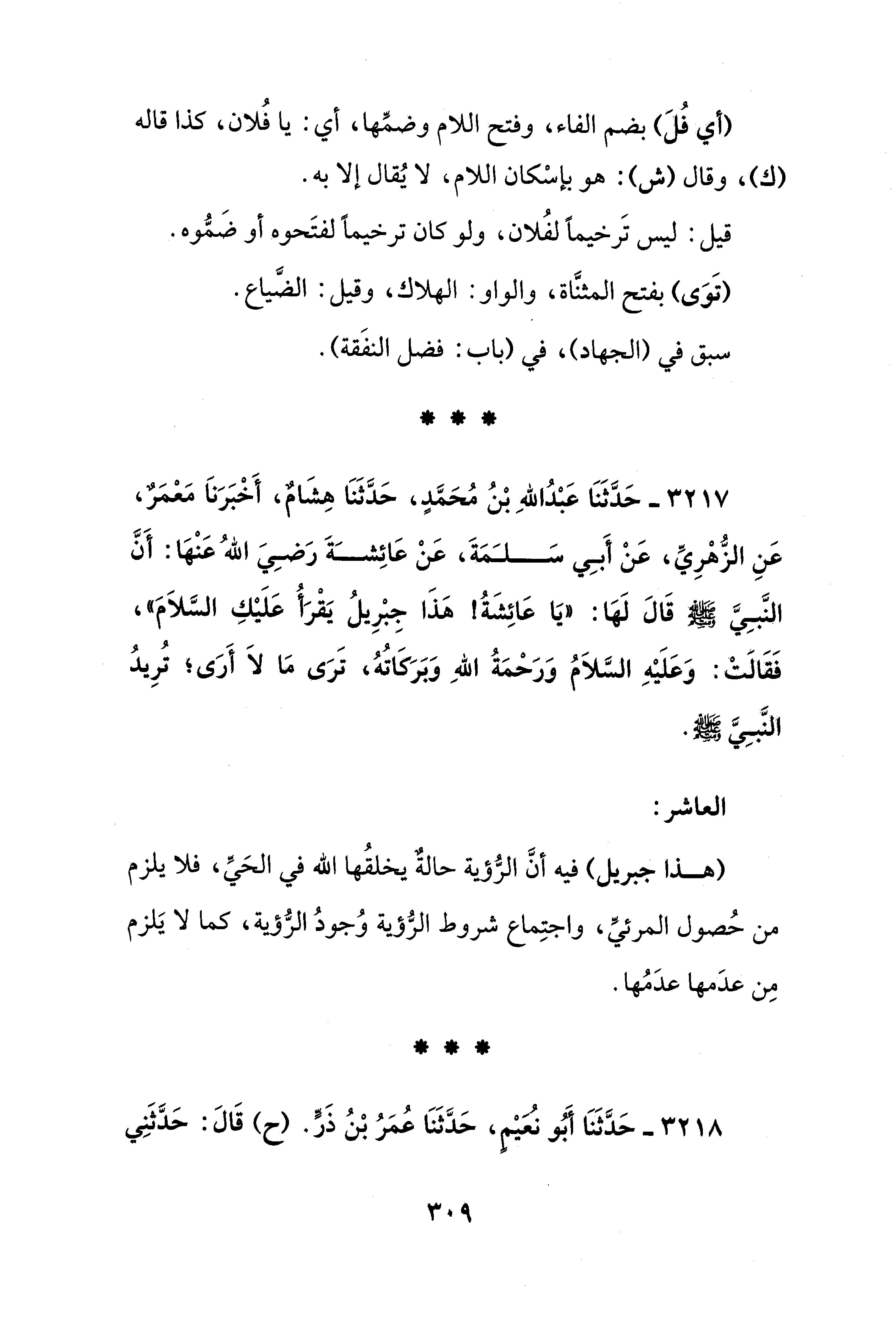3217 - حَدَّثَنَا عَبْدُ اللهِ بْنُ مُحَمَّدٍ، حَدَّثَنَا هِشَامٌ، أَخْبَرَنَا معمر، عَنِ الزُّهْرِيّ، عَنْ أَبِي سَلَمَةَ، عَنْ عَائِشَةَ رَضِيَ اللهُ عَنْهَا: أَنَّ النَّبِيَّ - صلى الله عليه وسلم - قَالَ لَهَا: "يَا عَائِشَةُ! هَذَا جِبْرِيلُ يَقْرَأُ عَلَيْكِ السَّلاَم"، فَقَالتْ: وَعَلَيْهِ السَّلاَمُ وَرحمَةُ اللهِ وَبَرَكَاتُه، تَرَى مَا لاَ أَرَى؛ تريدُ النَّبِيَّ - صلى الله عليه وسلم -.