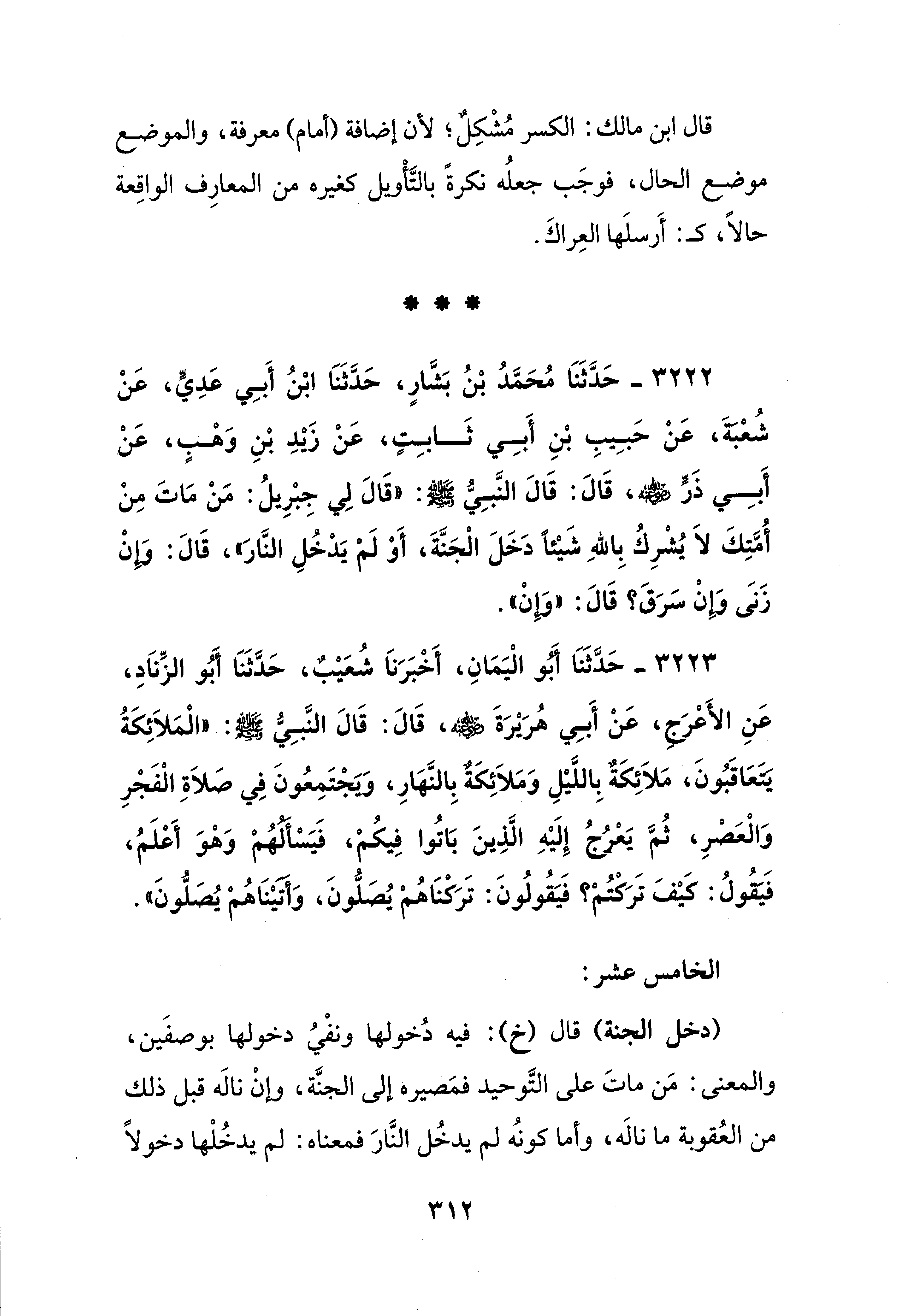 3222 - حَدَّثَنَا مُحَمَّدُ بْنُ بَشَّارٍ، حَدَّثَنَا ابْنُ أَبِي عَدِيّ، عَنْ شُعبةَ، عَنْ حَبِيبِ بْنِ أَبِي ثَابِتٍ، عَنْ زَيْدِ بْنِ وَهْبٍ، عَنْ أَبِي ذَرٍّ - رضي الله عنه -، قَالَ: قَالَ النَّبِيّ - صلى الله عليه وسلم -: "قَالَ لِي جِبْرِيلُ: مَنْ مَاتَ مِنْ أُمَّتِكَ لاَ يُشْرِكُ بِاللهِ شَيْئًا دَخَلَ الْجَنَّةَ، أَوْ لم يَدخُلِ النَّار"، قَالَ: وإنْ زَنىَ وإِنْ سَرَق؟ قَالَ: "وإن".