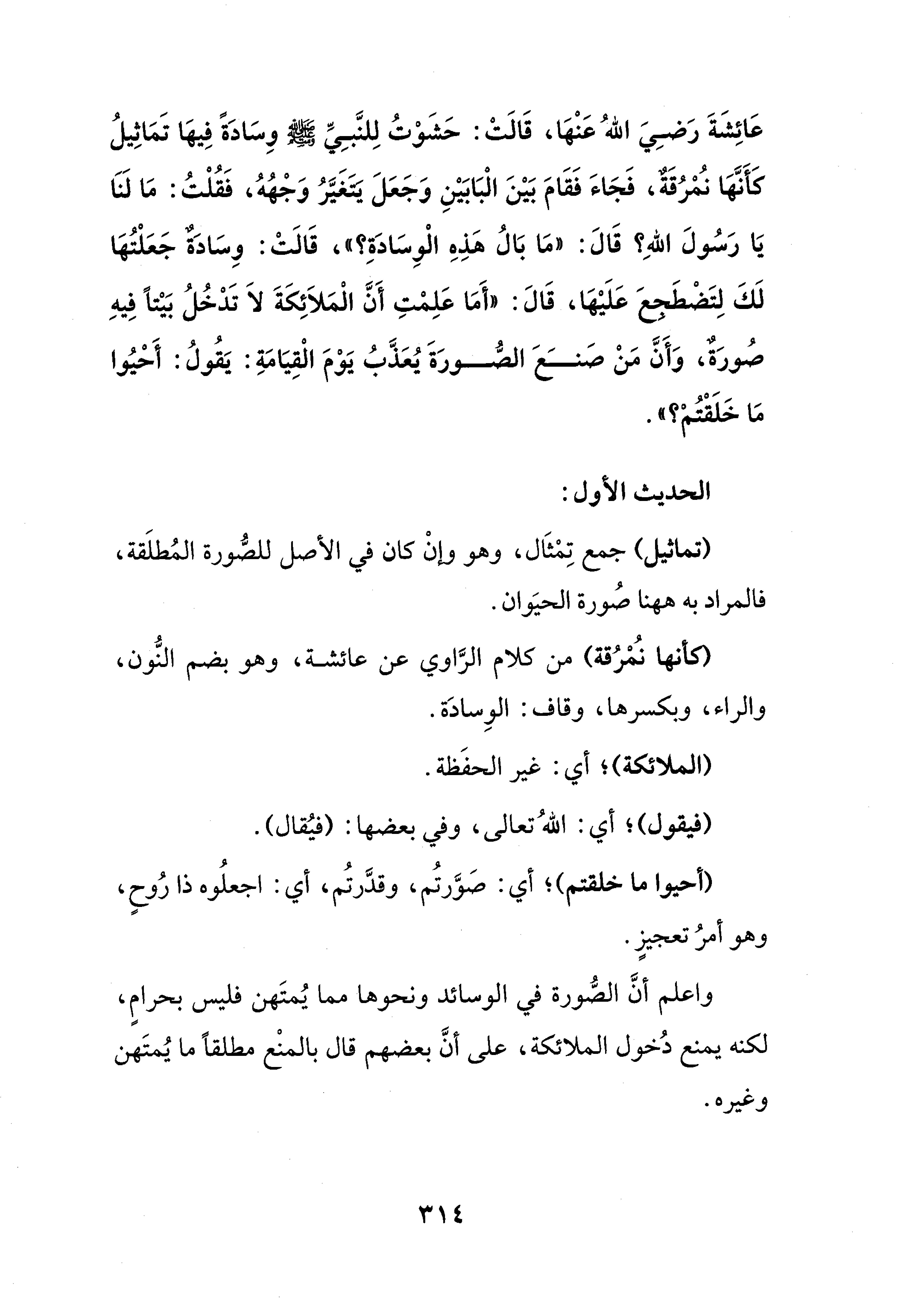 عَائِشَةَ رَضِيَ اللهُ عَنْهَا، قَالَتْ: حَشَوْتُ لِلنَّبِيِّ - صلى الله عليه وسلم - وِسَادَةً فِيهَا تَمَاثِيلُ كَأَنَّهَا نُمرُقَةٌ، فَجَاءَ فَقَامَ بَيْنَ الْبَابَيْنِ وَجَعَلَ يتغَيَّرُ وَجْهُهُ، فَقُلْتُ: مَا لَنَا يَا رَسُولَ اللهِ؟ قَالَ: "مَا بَالُ هَذِهِ الْوِسَادَة؟ "، قَالَتْ: وِسَادَةٌ جَعَلْتُهَا لَكَ لِتَضْطَجعَ عَلَيْهَا، قَالَ: " أَمَا عَلِمتِ أَنَّ الْمَلاَئِكَةَ لاَ تدخُلُ بَيْتًا فِيهِ صُورَة، وَأَنَّ مَنْ صَنعَ الصُّورَةَ يُعَذَّبُ يَوْمَ الْقِيَامَةِ: يَقُولُ: أَحيُوا مَا خَلَقْتم؟ ".