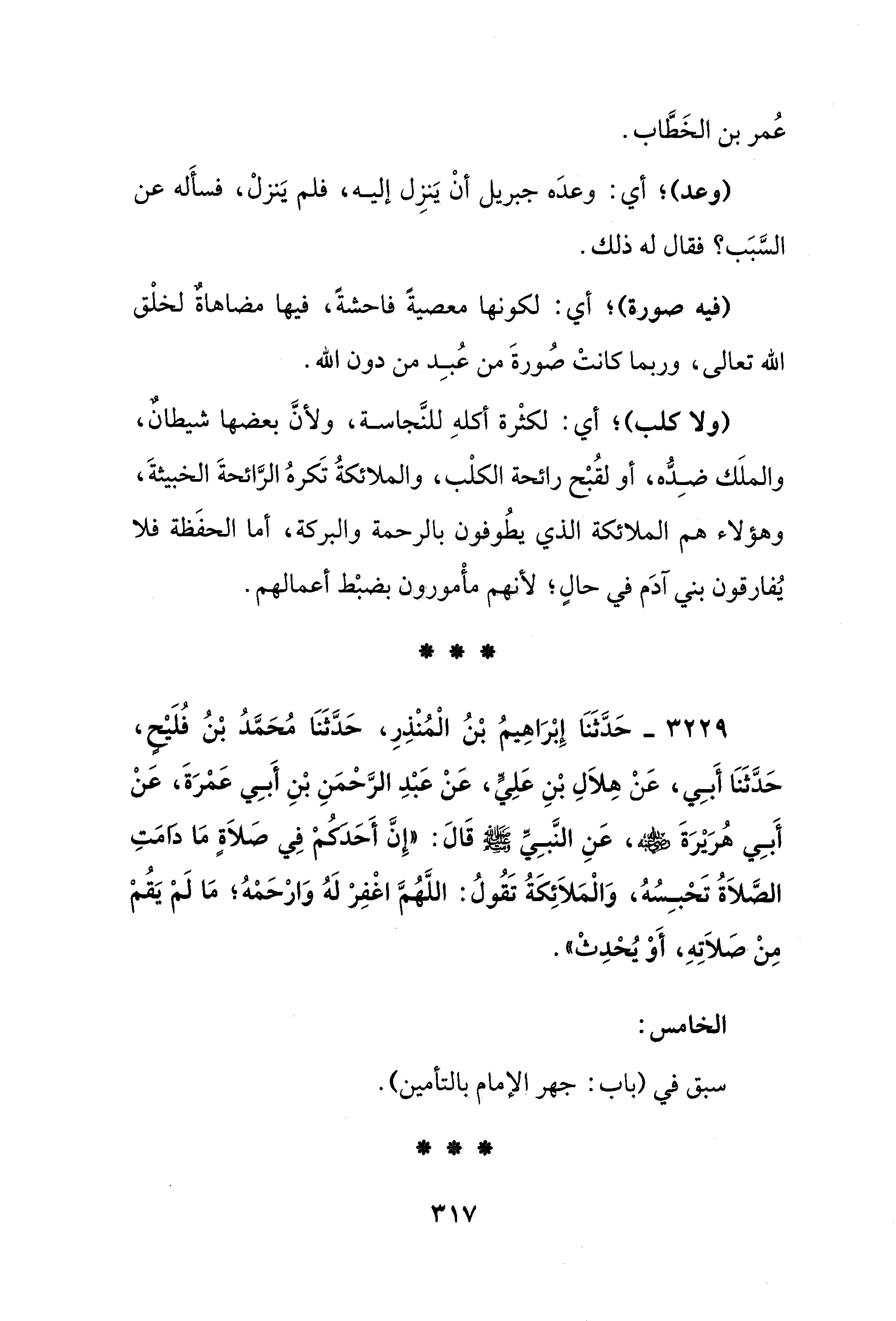 3229 - حَدَّثَنَا إِبْرَاهِيمُ بْنُ الْمنْذِرِ، حدَّثَنَا مُحَمَّدُ بْنُ فُلَيْحٍ، حَدَّثَنَا أَبِي، عَنْ هِلاَلِ بْنِ عَلِي، عَنْ عَبْدِ الرَّحمَنِ بْنِ أَبِي عَمرَةَ، عَنْ أَبِي هُرَيْرَة - رضي الله عنه -، عَنِ النَّبِيِّ - صلى الله عليه وسلم - قَالَ: "إِنَّ أَحَدكم فِي صَلاَةٍ مَا دامَتِ الصَّلاَةُ تَحبِسُهُ، وَالْمَلاَئِكَةُ تَقُولُ: اللَّهُمَّ اغْفِر لَهُ وَارحمهُ؛ مَا لم يَقم مِنْ صَلاَتِهِ، أَوْ يُحدِثْ".