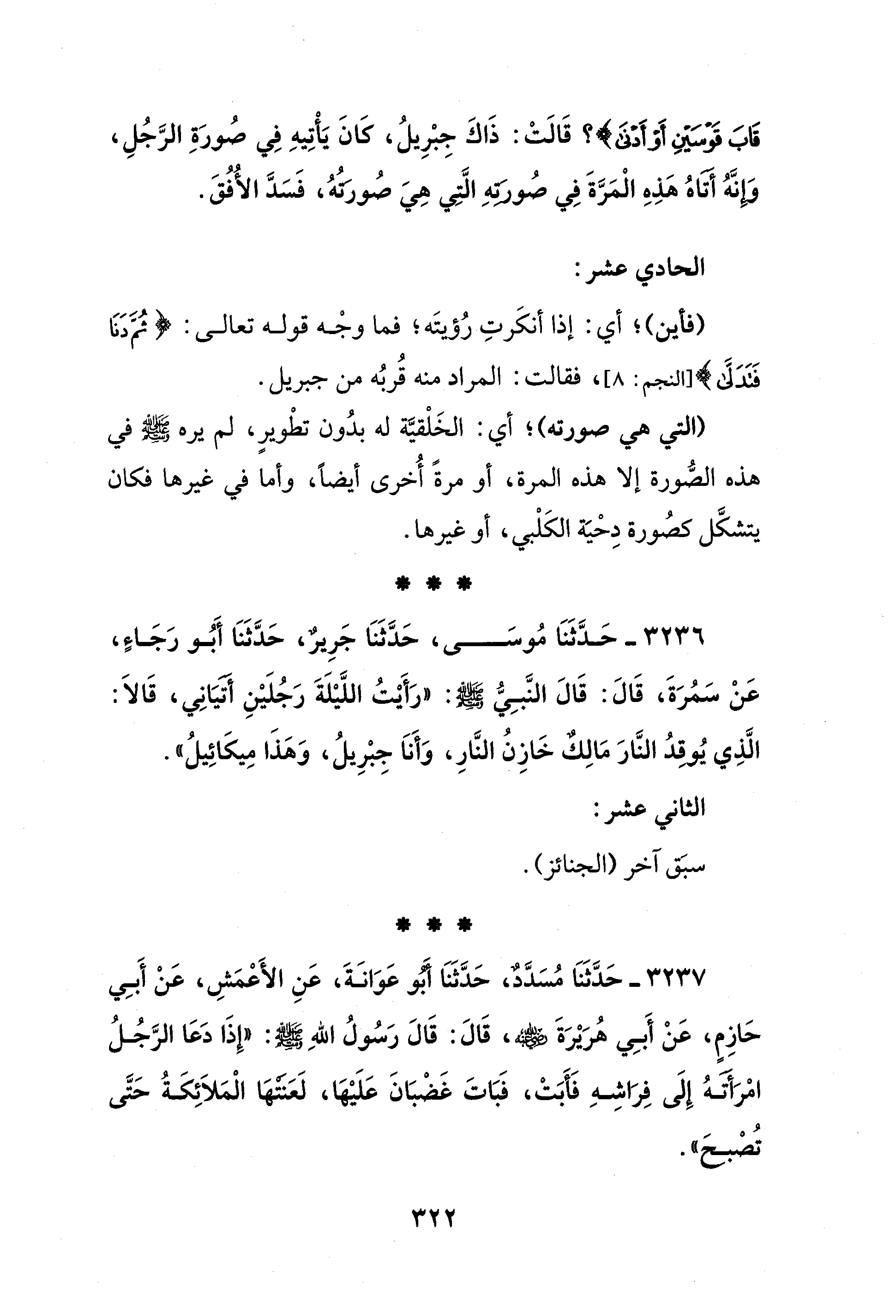 3237 - حَدَّثَنَا مُسَدَّدٌ، حَدَّثَنَا أبو عَوَانَةَ، عَنِ الأَعمَشِ، عَنْ أَبِي حَازِمٍ، عَنْ أَبِي هُرَيْرَة - رضي الله عنه -، قَالَ: قَالَ رَسُولُ اللهِ - صلى الله عليه وسلم -: "إِذَا دَعَا الرَّجُلُ امرَأتهُ إِلَى فِراشِهِ فَأَبَتْ، فَبَاتَ غَضْبَانَ عَلَيْهَا، لَعَنتهَا الْمَلاَئِكَةُ حَتَّى تُصبحَ".