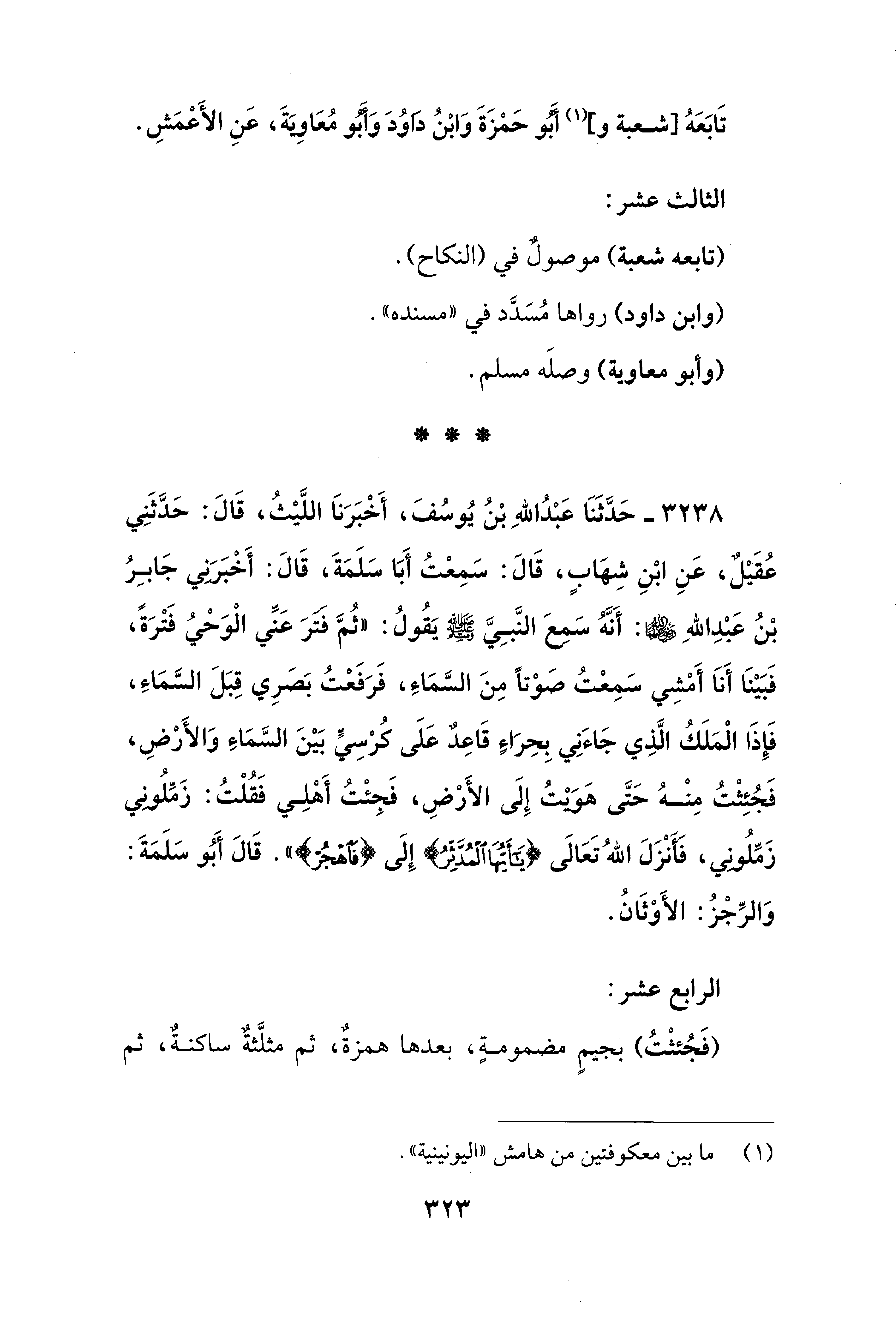 3238 - حَدَّثَنَا عَبْدُ اللهِ بْنُ يُوسُفَ، أَخْبَرَنَا اللَّيْثُ، قَالَ: حَدَّثَنِي عُقَيْلٌ، عَنِ ابْنِ شهَابٍ، قَالَ: سَمعتُ أَبَا سَلَمَةَ، قَالَ: أَخْبَرَنِي جَابِرُ بْنُ عَبْدِ اللهِ - رضي الله عنهما -: أَنَّهُ سَمِعَ النَّبِيَّ - صلى الله عليه وسلم - يَقُولُ: "ثُمَّ فترَ عَنِّي الْوَحيُ فَتْرَةً، فَبَيْنَا أَناَ أمشِي سَمِعتُ صَوْتًا مِنَ السَّمَاءَ، فَرَفعتُ بَصَرِي قِبَلَ السَّمَاءِ، فَإِذَا الْمَلَكُ الَّذِي جَاءَنِي بِحِرَاءٍ قَاعد عَلَى كرسِيِّ بَيْنَ السَّمَاءِ وَالأرضِ، فَجُئِثْتُ مِنْهُ حَتَّى هَويتُ إِلَى الأَرضِ، فَجِئْتُ أَهْلِي فَقُلْتُ: زَمِّلُوني زَمِّلُونِي، فَأَنْزَلَ اللهُ تَعَالَى {يَا أَيُّهَا الْمُدَّثِّرُ} إِلَى {فَاهْجُرْ}. قَالَ أَبُو سَلَمَةَ: وَالرِّجْزُ: الأَوْثَانُ.