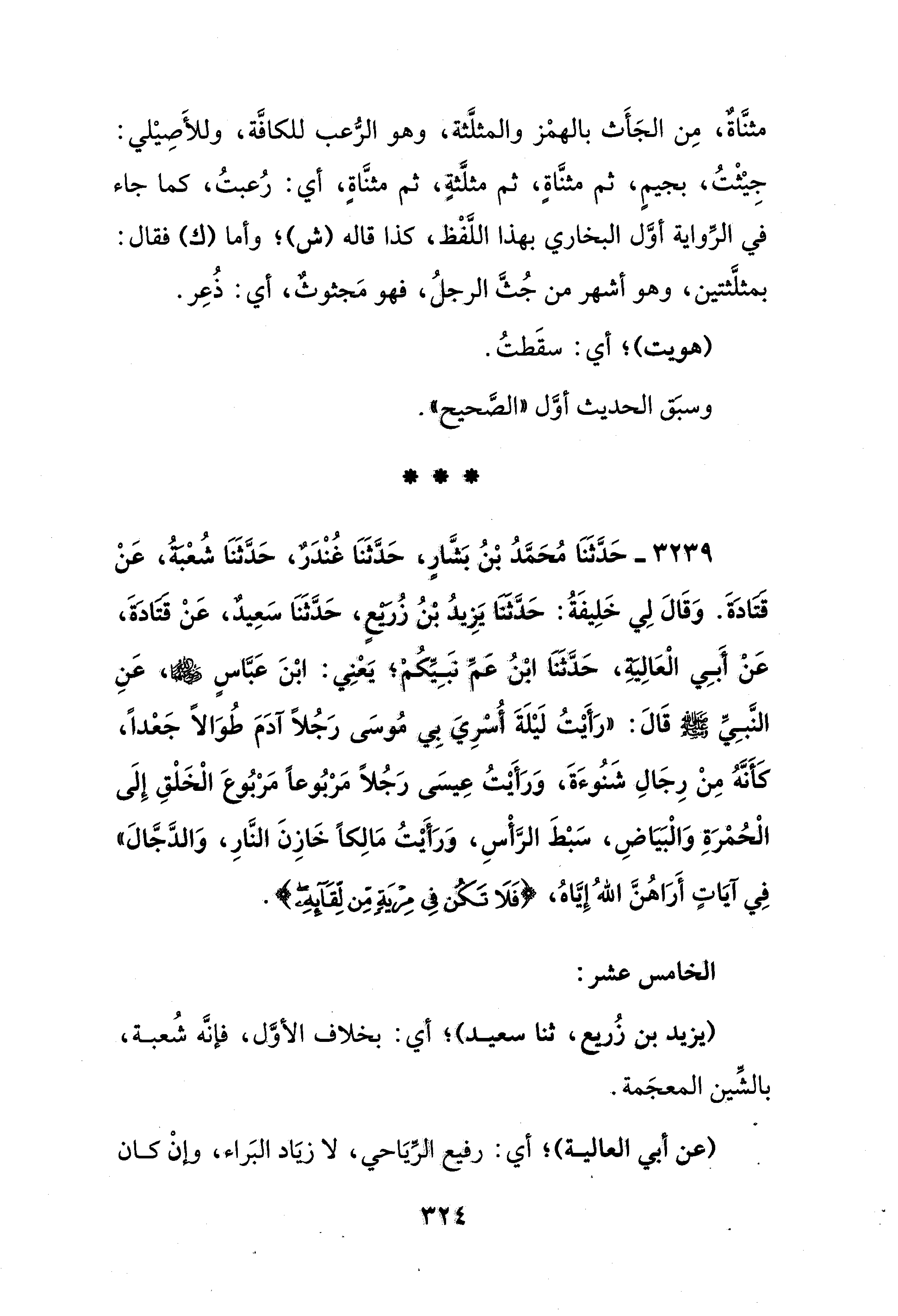 3239 - حَدَّثَنَا مُحَمَّدُ بن بَشَّارٍ، حَدَّثَنَا غُنْدَرٌ، حَدَّثَنَا شُعبةُ، عَنْ قتادَةَ. وَقَالَ لِي خَلِيفَةُ: حَدَّثنَا يَزِيدُ بْنُ زُرَيْعٍ، حَدَّثَنَا سَعِيدٌ، عَنْ قتادَةَ، عَنْ أَبِي الْعَالِيةِ، حَدَّثَنَا ابنُ عمِّ نبِيكم؛ يعنِي: ابْنَ عَبَّاسٍ - رضي الله عنهما -، عَنِ النَّبِيِّ - صلى الله عليه وسلم - قَالَ: "رَأَيتُ لَيلَةَ أسرِي بي موسَى رَجُلاً آَدَمَ طُوَالًا جَعدًا، كَأَنَّهُ مِنْ رِجَالِ شَنُوءَةَ، وَرَأَيتُ عِيسى رَجُلًا مَربُوعًا مَربُوعَ الْخَلْقِ إِلَى الْحمرَةِ وَالْبَيَاضِ، سَبْطَ الرَّأْسِ، ورَأَيْتُ مَالِكًا خَازِنَ النَّارِ، وَالدَّجَّال" فِي آيَاتٍ أَرَاهُنَّ اللهُ إِيَّاهُ، {فَلَا تَكُنْ فِي مِرْيَةٍ مِنْ لِقَائِهِ}