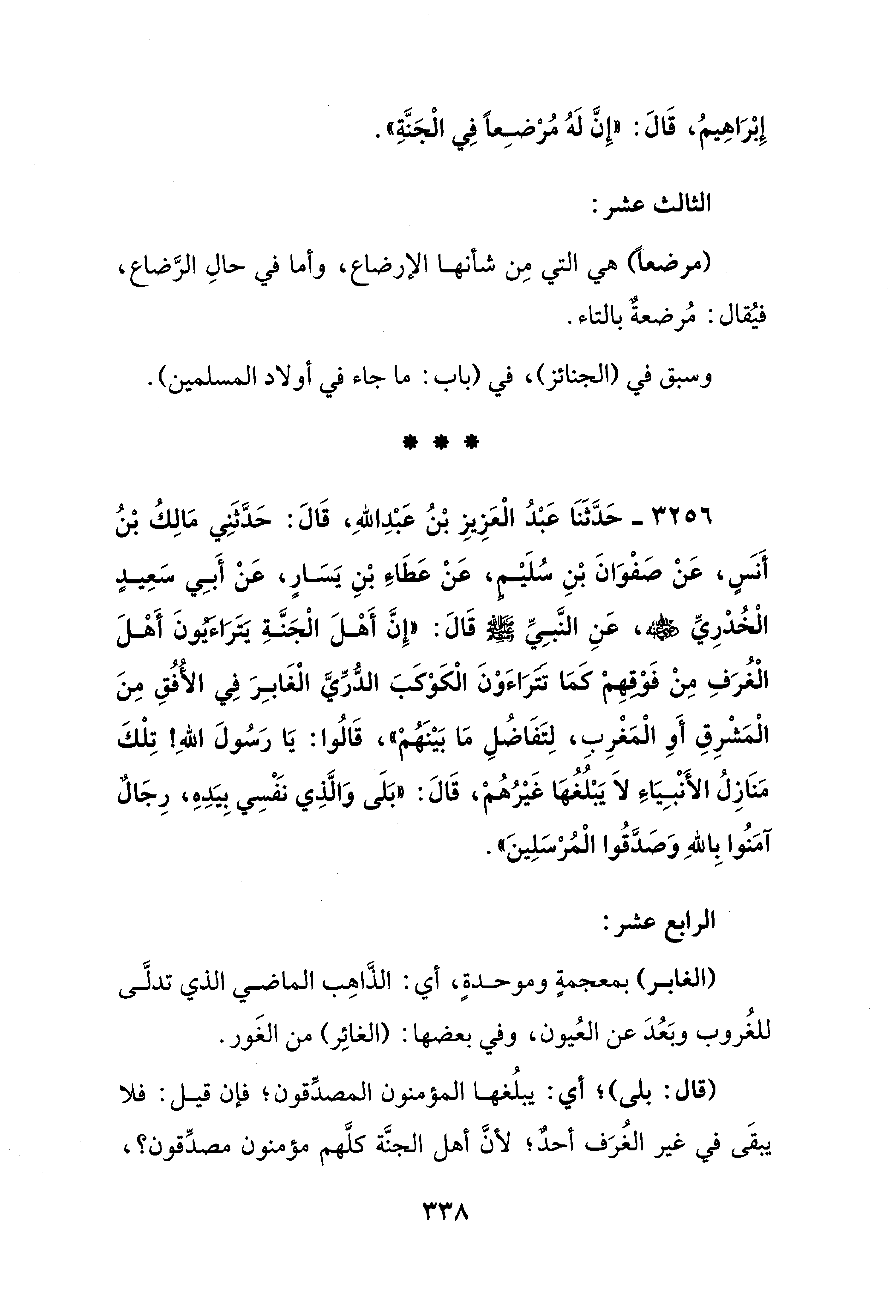 3256 - حَدَّثَنَا عَبْدُ الْعَزِيزِ بْنُ عَبْدِ اللهِ، قَالَ: حَدَّثَنِي مَالِكُ بْنُ أَنسٍ، عَنْ صَفْوَانَ بْنِ سُلَيْمٍ، عَنْ عَطَاء بْنِ يَسَارٍ، عَنْ أَبِي سَعِيدٍ الْخُدْرِيِّ - رضي الله عنه -، عَنِ النَّبِيِّ - صلى الله عليه وسلم - قَالَ: "إِنَّ أَهْلَ الْجَنَّة يتَرَاءيونَ أَهْلَ الْغُرَفِ مِنْ فَوْقِهم كمَا تترَاءَوْنَ الْكَوْكَبَ الدُّرِّيَّ الْغَابِرَ فِي الأُفُقِ مِنَ الْمَشْرِقِ أَوِ الْمَغْرِبِ، لِتَفَاضُلِ مَا بَيْنَهم"، قَالُوا: يَا رَسُولَ اللهِ! تِلْكَ مَنَازِلُ الأَنْبِيَاءِ لاَ يَبْلُغُها غَيْرُهم، قَالَ: "بَلَى وَالَّذِي نَفْسِي بِيَدِهِ، رِجالٌ آمَنُوا بِاللهِ وَصَدَّقُوا الْمُرْسَلِينَ".