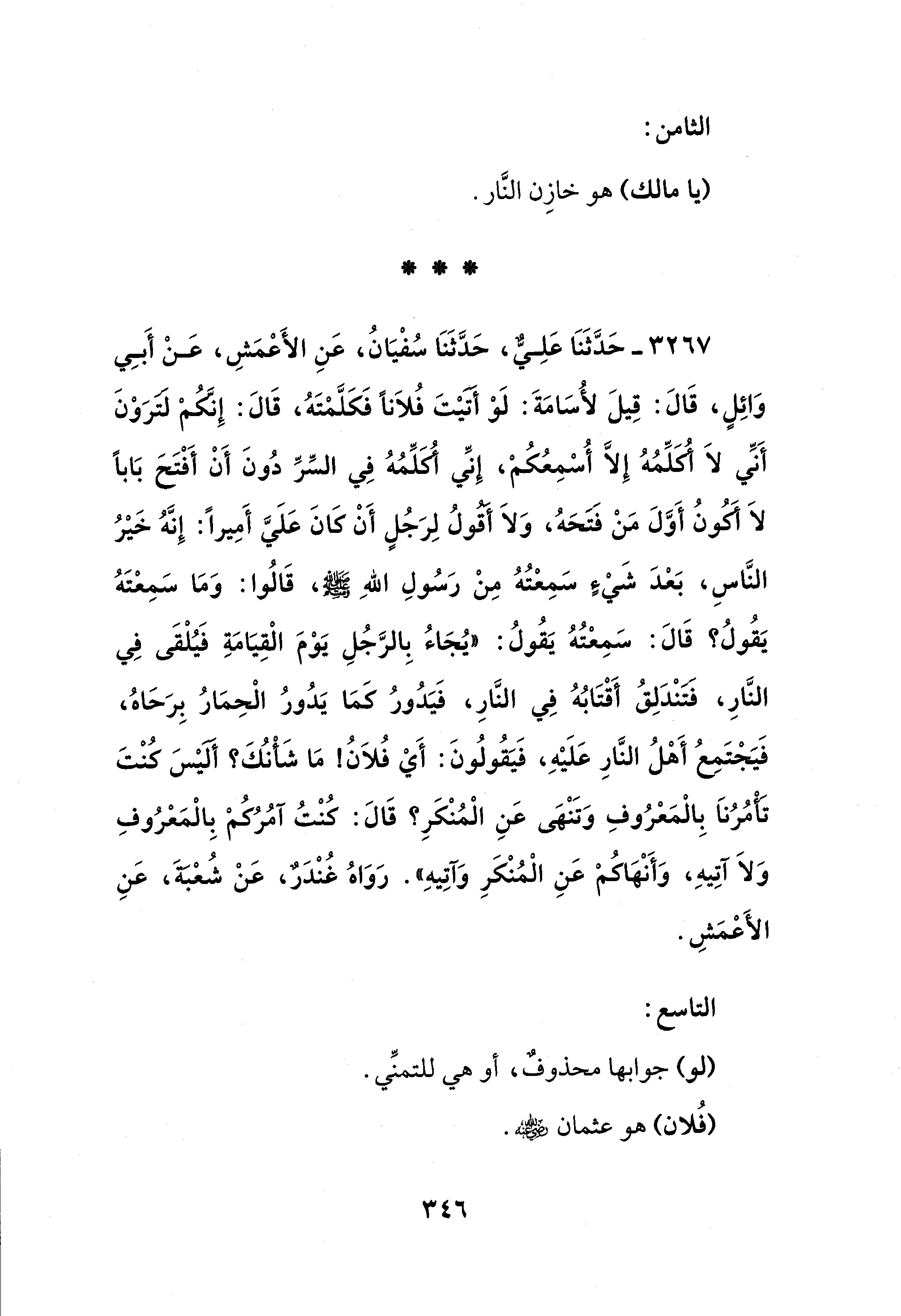 3267 - حَدَّثَنَا عَلِيٌّ، حَدَّثَنَا سُفْيَانُ، عَنِ الأَعْمَشِ، عَنْ أَبِي وَائِلٍ، قَالَ: قِيلَ لأُسَامَةَ: لَوْ أَتَيْتَ فُلاَنًا فَكَلَّمتَهُ، قَالَ: إِنَكم لترَوْنَ أنِّي لاَ أكُلِّمُهُ إِلَّا أُسْمِعُكُم، إِنِّي أكُلِّمُهُ فِي السِّرِّ دُونَ أَنْ أَفْتَحَ بَابًا لاَ أكُونُ أَوَّلَ مَنْ فتَحَهُ، وَلاَ أقولُ لِرَجُلٍ أَنْ كَانَ عَلَيَّ أَمِيرًا: إِنَّهُ خَيْرُ النَّاسِ، بَعْدَ شَيْءٍ سَمِعتُةُ مِنْ رَسُولِ الله - صلى الله عليه وسلم -، قَالُوا: وَمَا سَمِعْتَهُ يَقُولُ؟ قَالَ: سَمِعْتُهُ يَقُولُ: "يُجَاءُ بِالرَّجُلِ يَوْمَ الْقِيَامَةِ فَيُلْقَى فِي النَّارِ، فَتَنْدَلِقُ أَقْتَابُهُ فِي النَّارِ، فَيَدُورُ كمَا يَدُورُ الْحِمَارُ بِرَحَاهُ، فَيَجْتَمِعُ أَهْلُ النَّارِ عَلَيهِ، فَيَقُولُونَ: أَي فُلاَنُ! مَا شَأْنُكَ؟ أليْسَ كُنْتَ تأمُرُناَ بِالْمَعْرُوفِ وَتَنهى عَنِ الْمُنْكَرِ؟ قَالَ: كُنْتُ آمُرُكُمْ بِالْمعْرُوفِ وَلاَ آتِيهِ، وَأَنْهاكُم عَنِ الْمُنْكَرِ وَآتِيهِ". رَوَاهُ غُنْدرٌ، عَنْ شُعبةَ، عَنِ الأَعْمَشِ.