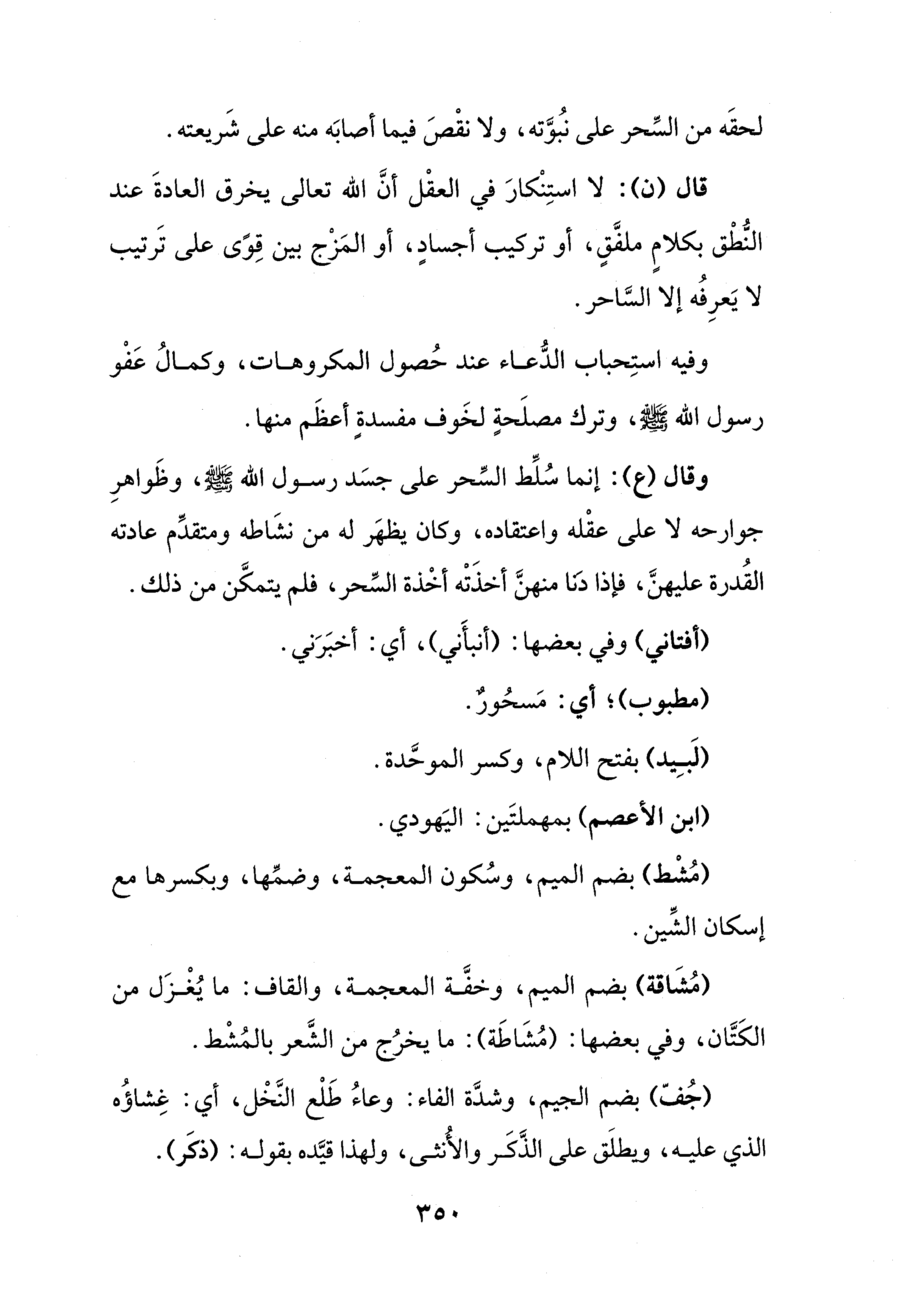 وقال (ع): إنما سُلِّط السِّحر على جسَد رسول الله - صلى الله عليه وسلم -، وظَواهرِ جوارحه لا على عقْله واعتقاده، وكان يظهَر له من نشَاطه ومتقدِّم عادته القُدرة عليهنَّ، فإذا دَنا منهنَّ أخذَتْه أخْذة السِّحر، فلم يتمكَّن من ذلك.