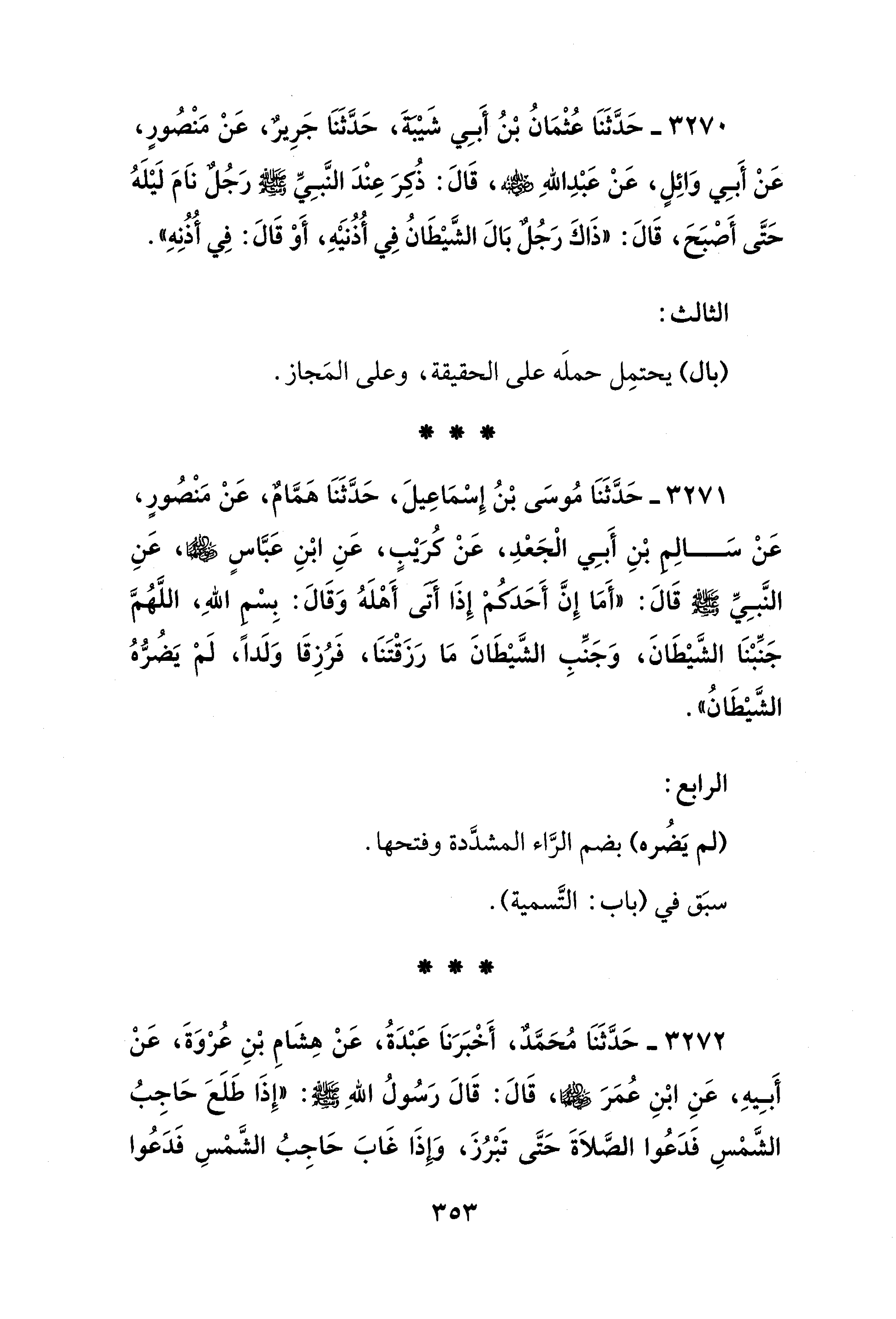 3270 - حَدَّثَنَا عُثْمَانُ بْنُ أَبِي شَيْبةَ، حَدَّثَنَا جَرِيرٌ، عَنْ مَنْصُورٍ، عَنْ أَبِي وَائِلٍ، عَنْ عَبْدِ اللهِ - رضي الله عنه -، قَالَ: ذُكِرَ عِنْدَ النَّبِيِّ - صلى الله عليه وسلم - رَجُلٌ ناَمَ لَيْلَهُ حَتَّى أَصْبَحَ، قَالَ: "ذَاكَ رَجُلٌ بَالَ الشَّيْطَانُ فِي أُذُنيهِ، أَوْ قَالَ: فِي أُذُنِهِ".