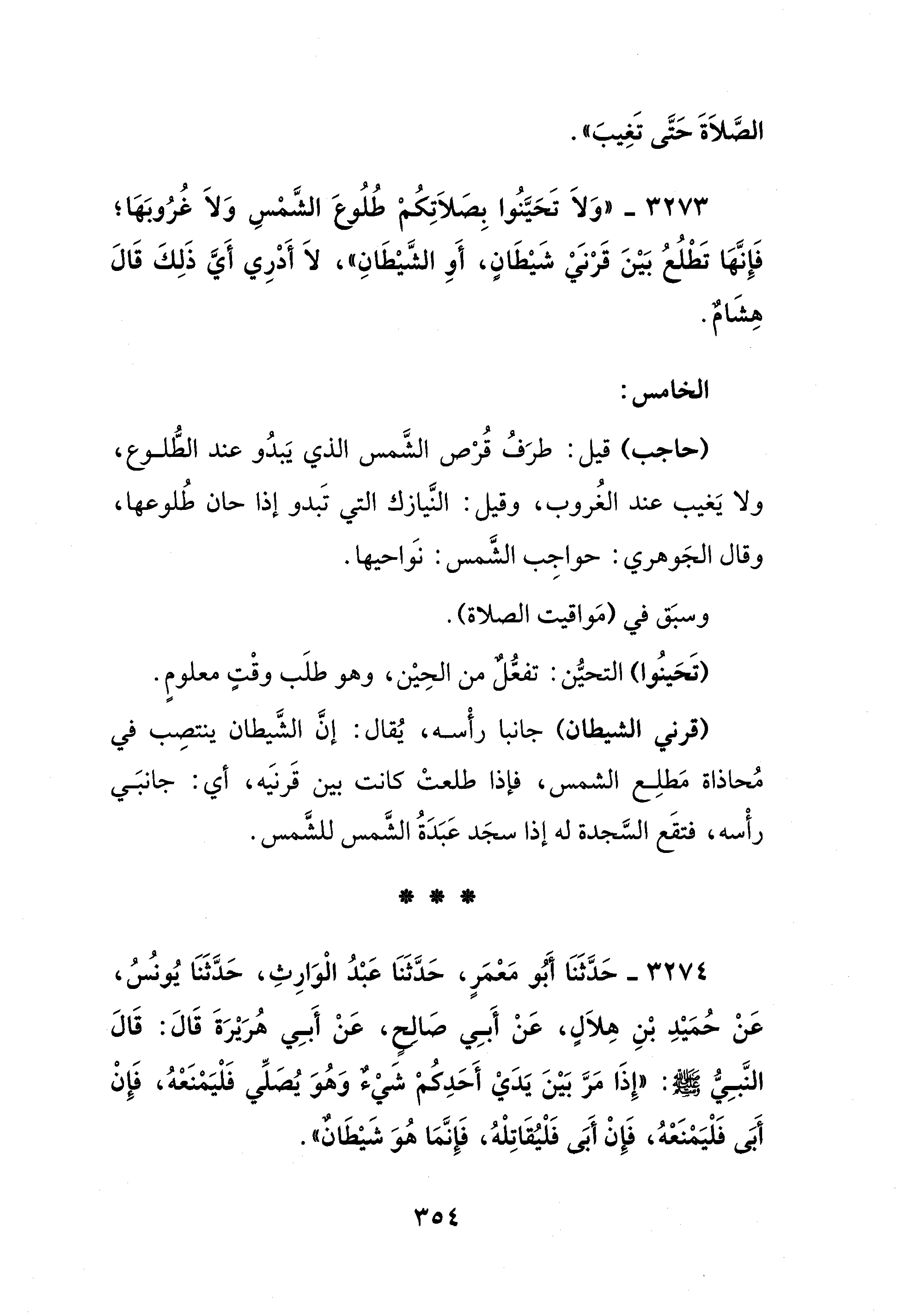 3273 - "وَلاَ تَحَيَّنُوا بِصَلاَتِكُمْ طُلُوعَ الشَّمسِ وَلاَ غُرُوبَها؛ فَإِنَّها تَطْلُعُ بَيْنَ قَرْني شَيْطَانٍ، أَوِ الشَّيْطَانِ"، لاَ أَدرِي أَيَّ ذَلِكَ قَالَ هِشَامٌ.