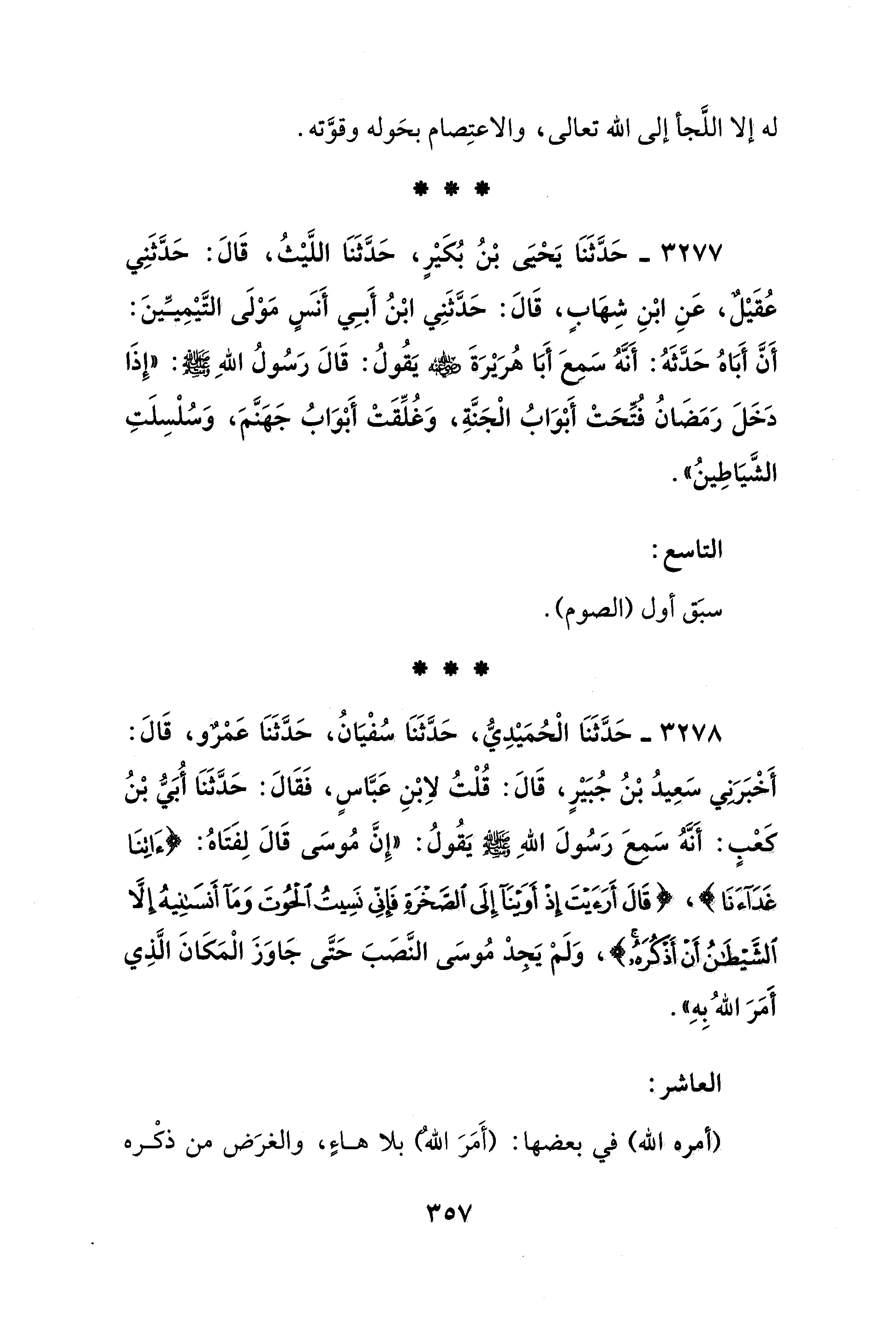 3277 - حَدَّثَنَا يَحيَى بْنُ بُكَيْر، حَدَّثَنَا اللَّيْثُ، قَالَ: حَدَّثَنِي عُقَيْلٌ، عَنِ ابْنِ شِهابٍ، قَالَ: حَدَّثَنِي ابْنُ أَبِي أَنسٍ مَوْلَى التَّيْمِيِّينَ: أَنَّ أَبَاهُ حَدَّثَهُ: أَنَّهُ سَمِعَ أَبَا هُرَيْرَةَ - رضي الله عنه - يَقُولُ: قَالَ رَسُولُ اللهِ - صلى الله عليه وسلم -: "إِذَا دَخَلَ رَمَضَانُ فتَحَتْ أَبْوَابُ الْجَنَّةِ، وَغُلِّقَتْ أَبْوَابُ جَهنَّمَ، وَسُلْسِلَتِ الشَّيَاطِينُ".