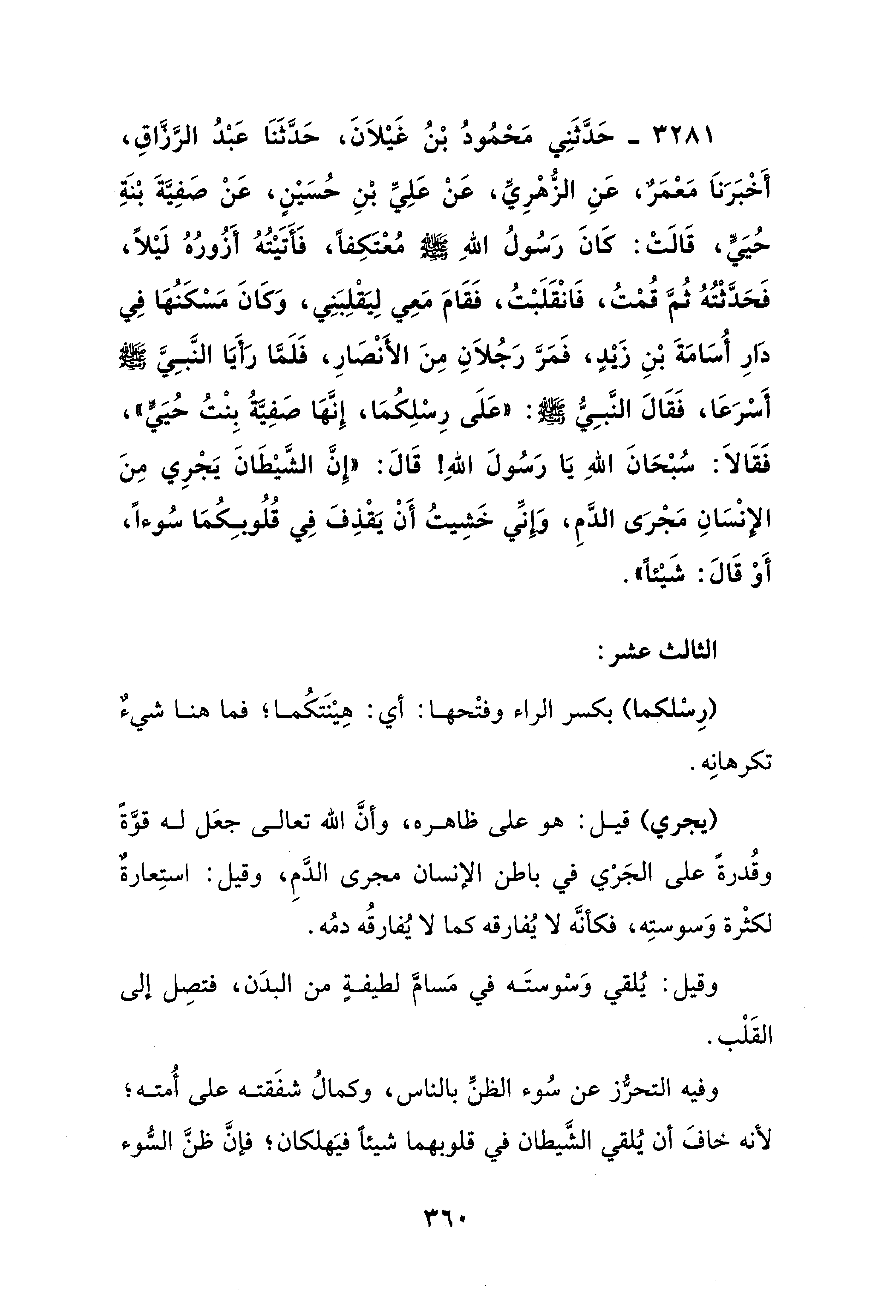 3281 - حَدَّثَنِي مَحمُودُ بْنُ غَيْلاَنَ، حَدَّثَنَا عَبْدُ الرَّزَّاقِ، أَخْبَرَنَا مَعمَرٌ، عَنِ الزُّهْرِيِّ، عَنْ عَلِيِّ بْنِ حُسَيْنٍ، عَنْ صَفِيَّةَ بْنَةِ حُيَيٍّ، قَالَتْ: كَانَ رَسُولُ اللهِ - صلى الله عليه وسلم - مُعْتكِفًا، فَأَتَيْتُهُ أَزُورُهُ لَيْلًا، فَحَدَّثْتُهُ ثُمَّ قُمْتُ، فَانْقَلَبْتُ، فَقَامَ مَعِي لِيَقْلِبَنِي، وَكَانَ مَسْكَنُهَا فِي دارِ أسُامَةَ بْنِ زَيْدٍ، فَمَرَّ رَجُلاَنِ مِنَ الأَنْصَارِ، فَلَمَّا رَأَيَا النَّبِيَّ - صلى الله عليه وسلم - أَسْرَعَا، فَقَالَ النَّبِيُّ - صلى الله عليه وسلم -: "عَلَى رِسْلِكُمَا، إِنَّها صَفِيَّةُ بِنْتُ حُيَيٍّ"، فَقَالاَ: سُبْحَانَ اللهِ يَا رَسُولَ اللهِ! قَالَ: "إِنَّ الشَّيْطَانَ يَجْرِي مِنَ الإنْسَانِ مَجْرَى الدَّمِ، وَإِنِّي خَشِيتُ أَنْ يَقْذِفَ فِي قُلُوبِكُمَا سُوءًا، أو قَالَ: شَيْئًا".
