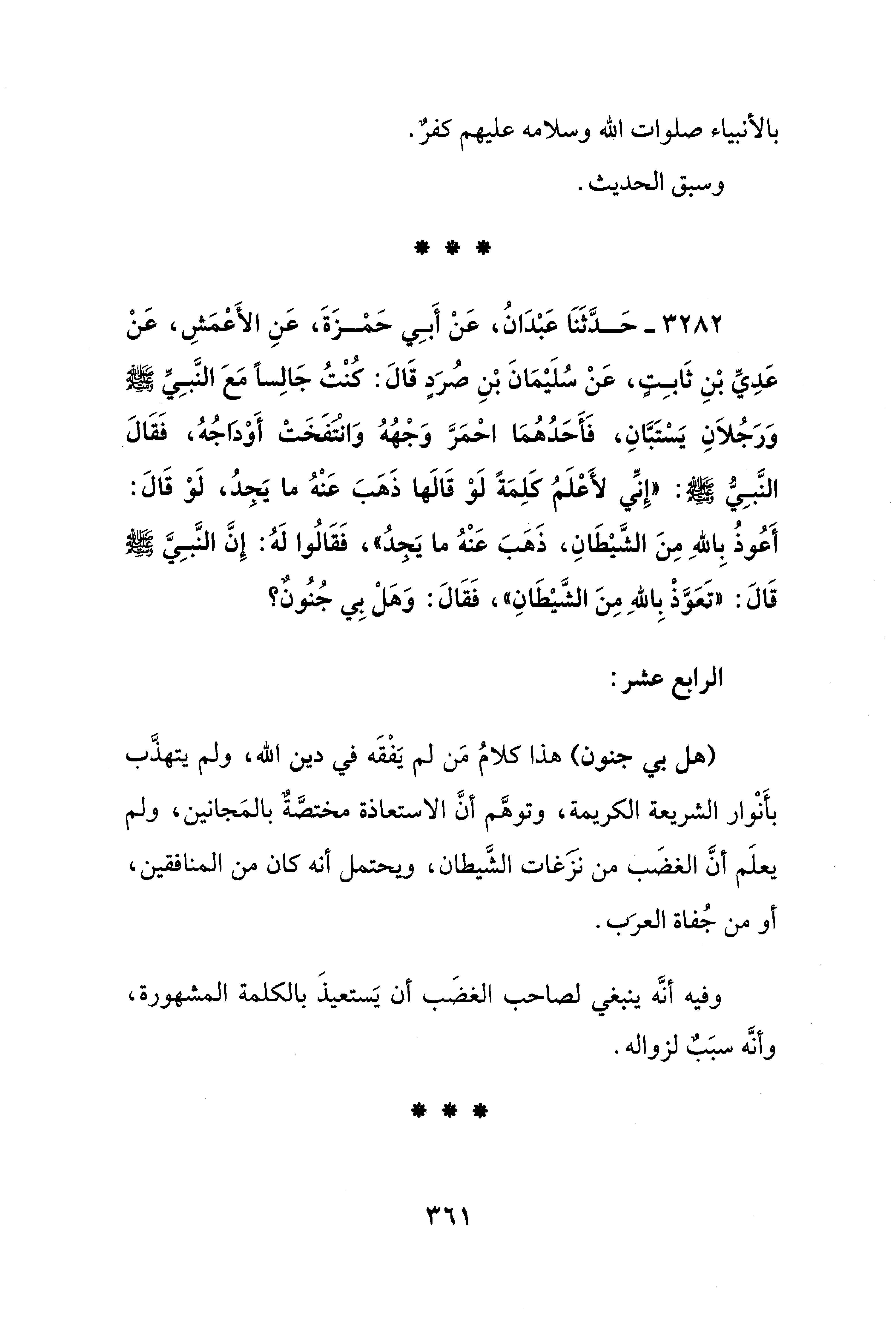 3282 - حَدَّثَنَا عَبْدَانُ، عَنْ أَبِي حَمزَةَ، عَنِ الأَعمَشِ، عَنْ عَدِيِّ بْنِ ثَابِتٍ، عَنْ سُلَيْمَانَ بْنِ صرَدٍ قَالَ: كانْتُ جَالِسًا مَعَ النَّبي - صلى الله عليه وسلم - وَرَجُلاَنِ يَسْتَبَّانِ، فَأَحَدُهُمَا احمَرَّ وَجْهُهُ وَانتفَخَتْ أَوْداجُهُ، فَقَالَ النَّبِيُّ - صلى الله عليه وسلم -: "إِنِّي لأَعْلَمُ كَلِمَةً لَوْ قَالَها ذَهبَ عَنْهُ ما يَجدُ، لَوْ قَالَ: أَعُوذُ بِاللهِ مِنَ الشَّيْطَانِ، ذَهبَ عَنْهُ ما يَجدُ"، فَقَالُوا لَهُ: إِنَّ النَّبِيَّ - صلى الله عليه وسلم - قَالَ: "تَعوَّذْ بِاللهِ مِنَ الشَّيْطَانِ"، فَقَالَ: وَهلْ بِي جُنُونٌ؟