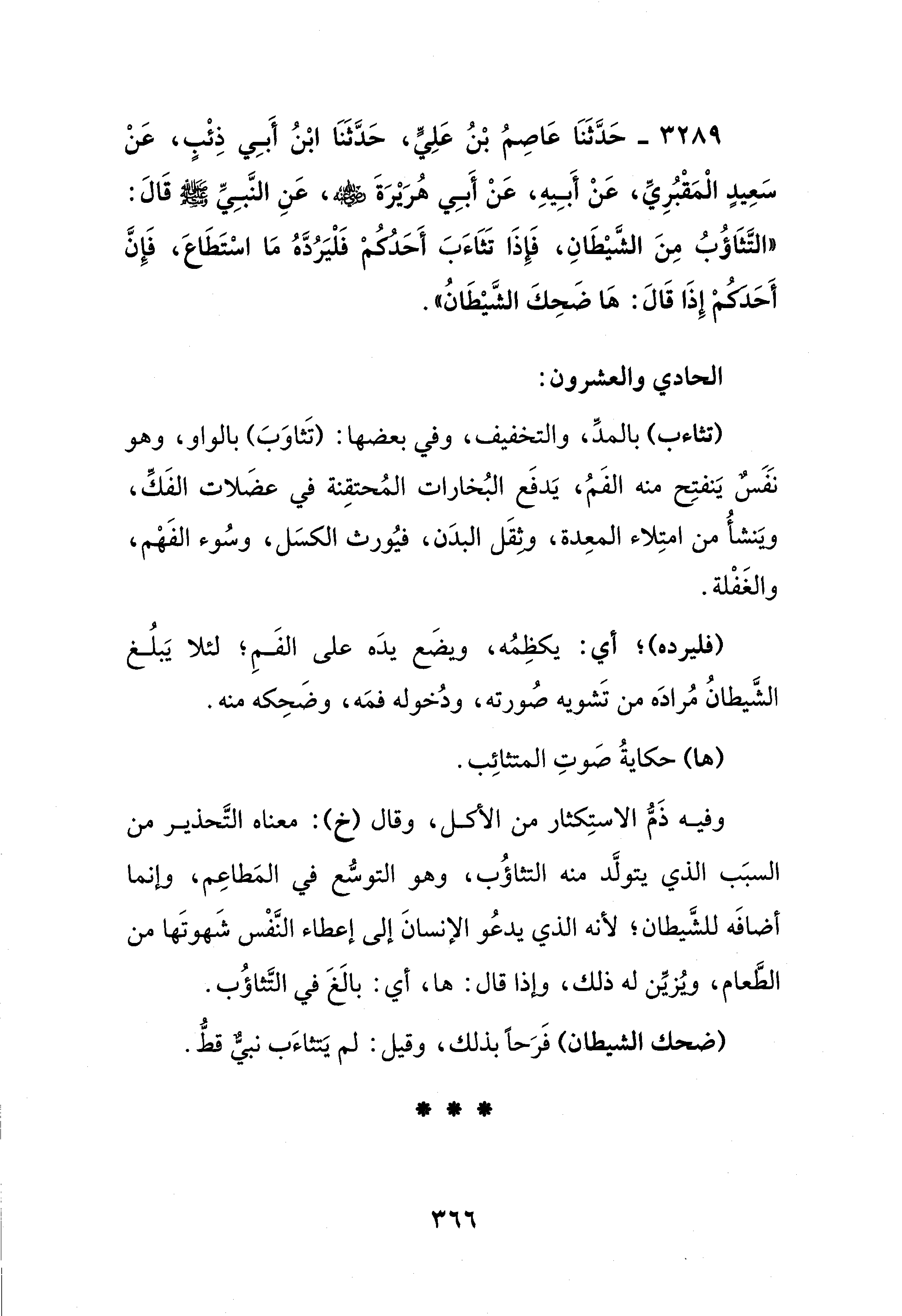3289 - حَدَّثَنَا عَاصِمُ بْنُ عَلِيٍّ، حَدَّثَنَا ابْنُ أَبِي ذِئْبٍ، عَنْ سَعِيدٍ الْمَقْبُرِيِّ، عَنْ أَبِيهِ، عَنْ أَبِي هُرَيْرَة - رضي الله عنه -، عَنِ النَّبِيِّ - صلى الله عليه وسلم - قَالَ: "التَّثَاؤُبُ مِنَ الشَّيْطَانِ، فَإِذَا تَثَاءَبَ أَحَدكم فَلْيَرُدَّهُ مَا اسْتَطَاعَ، فَإِنَّ أَحَدكم إِذَا قَالَ: ها ضَحِكَ الشَّيْطَانُ".