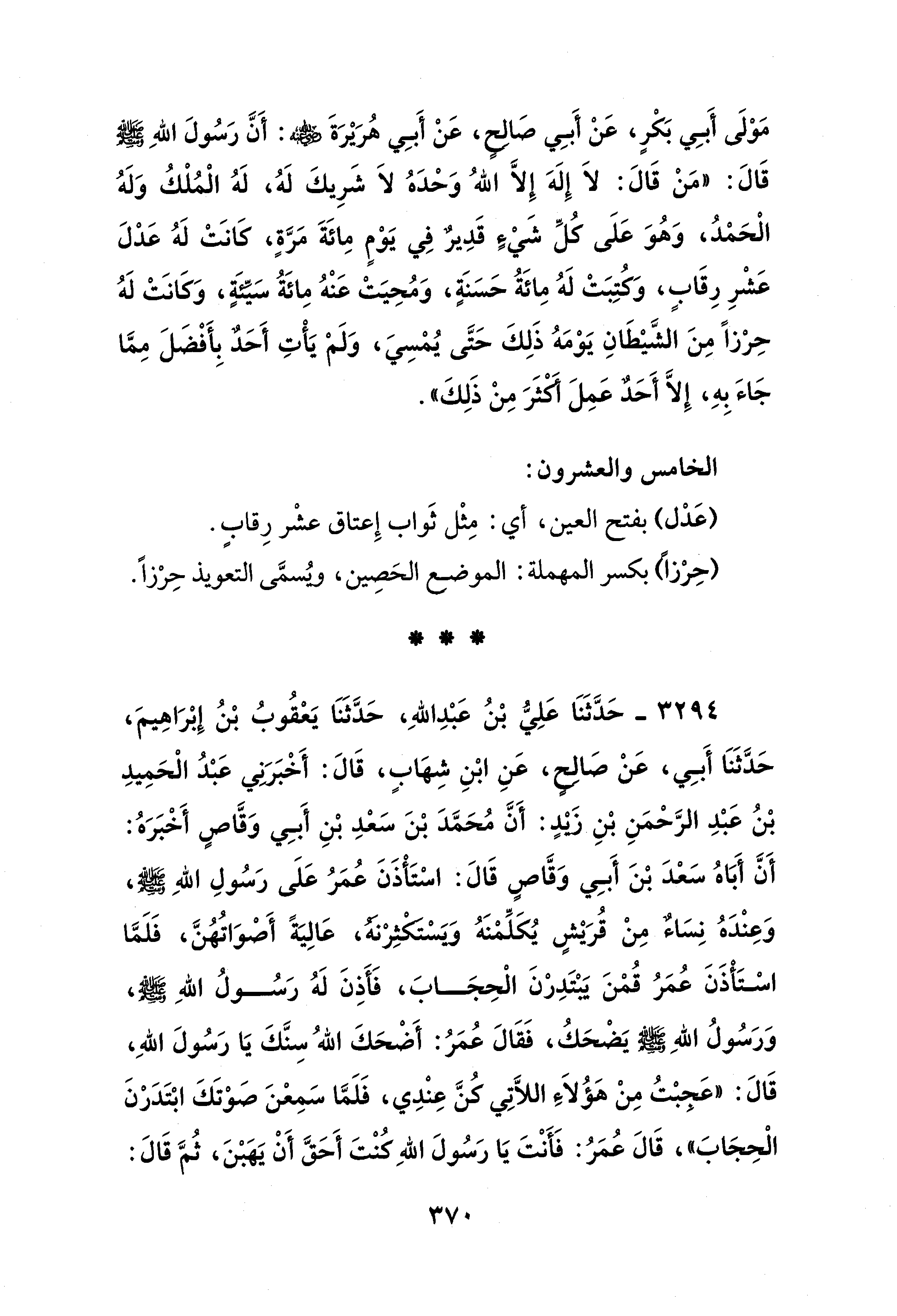 مَوْلَى أَبِي بَكْرٍ، عَنْ أَبِي صَالحٍ، عَنْ أَبِي هُرَيْرَةَ - رضي الله عنه -: أَنَّ رَسُولَ اللهِ - صلى الله عليه وسلم - قَالَ: "مَنْ قَالَ: لاَ إِلَه إِلَّا اللهُ وَحْدَهُ لاَ شَرِيكَ لَهُ، لَهُ الْمُلْكُ وَلَهُ الْحمْدُ، وَهُوَ عَلَى كُلِّ شَيْء قَدِيرٌ فِي يَوْمٍ مِائَةَ مَرَّةٍ، كَانَتْ لَهُ عدْلَ عَشْرِ رِقَابٍ، وَكُتِبَتْ لَهُ مِائَةُ حَسَنَةٍ، وَمُحِيَتْ عَنْهُ مِائَةُ سَيِّئةٍ، وَكَانَتْ لَهُ حِرْزًا مِنَ الشَّيْطَانِ يَوْمَهُ ذَلِكَ حَتَّى يُمْسِيَ، وَلَمْ يَأْتِ أَحدٌ بِأَفْضَلَ مِمَّا جَاءَ بِهِ، إِلَّا أَحدٌ عَمِلَ أكثَرَ مِنْ ذَلِكَ".