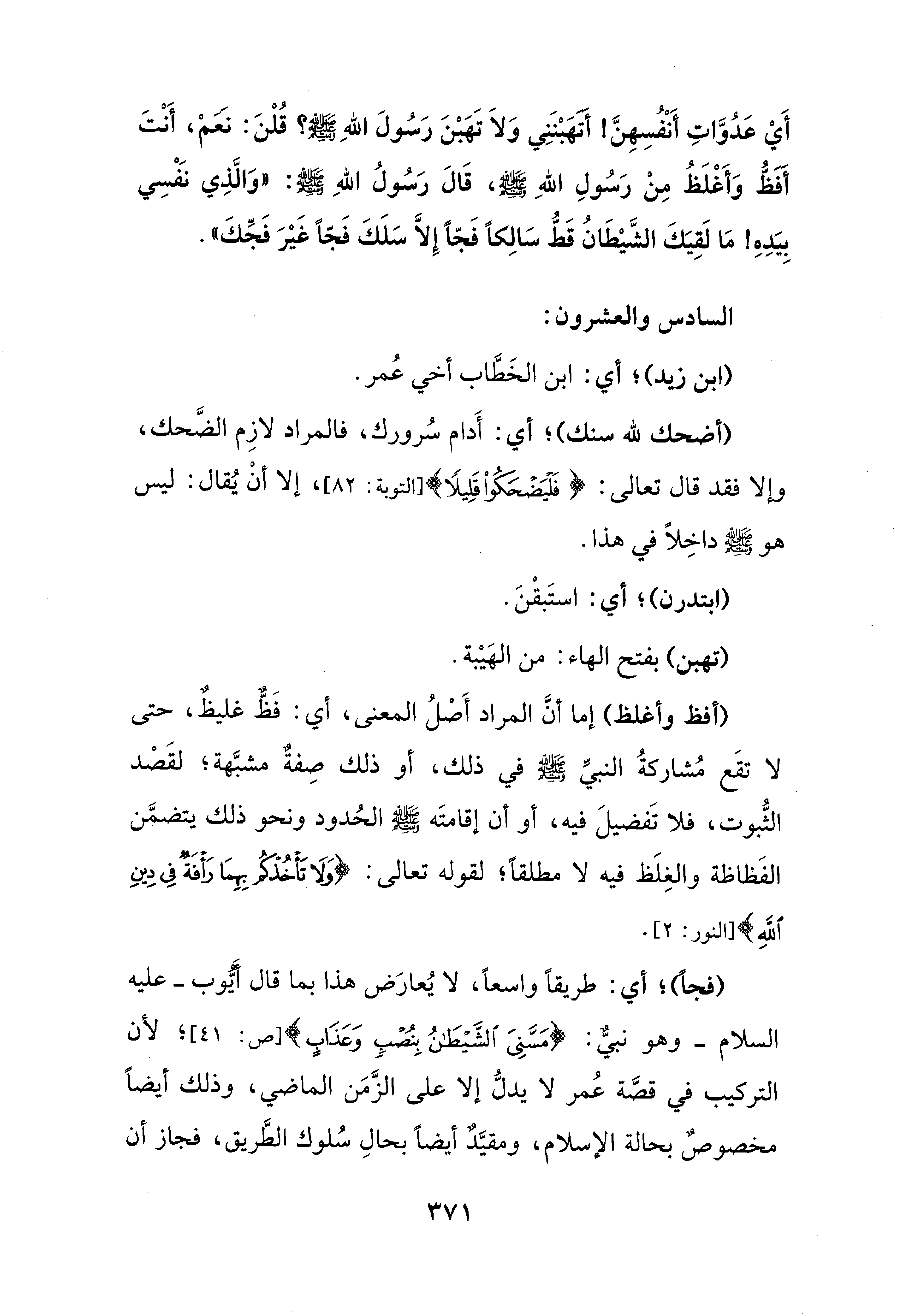 أَيْ عَدُوَّاتِ أَنْفُسِهِنَّ! أتهبْنَنِي وَلاَ تَهبْنَ رَسُولَ اللهِ - صلى الله عليه وسلم -؟ قُلْنَ: نعم، أَنْتَ أفظُّ وَأَغْلَظُ مِنْ رَسُولِ اللهِ - صلى الله عليه وسلم -، قَالَ رَسُولُ اللهِ - صلى الله عليه وسلم -: "وَالَّذِي نَفْسِي بِيَدِهِ! مَا لَقِيَكَ الشَّيْطَانُ قَطُّ سَالِكًا فَجًّا إِلَّا سَلَكَ فَجًّا غَيْرَ فَجِّكَ".