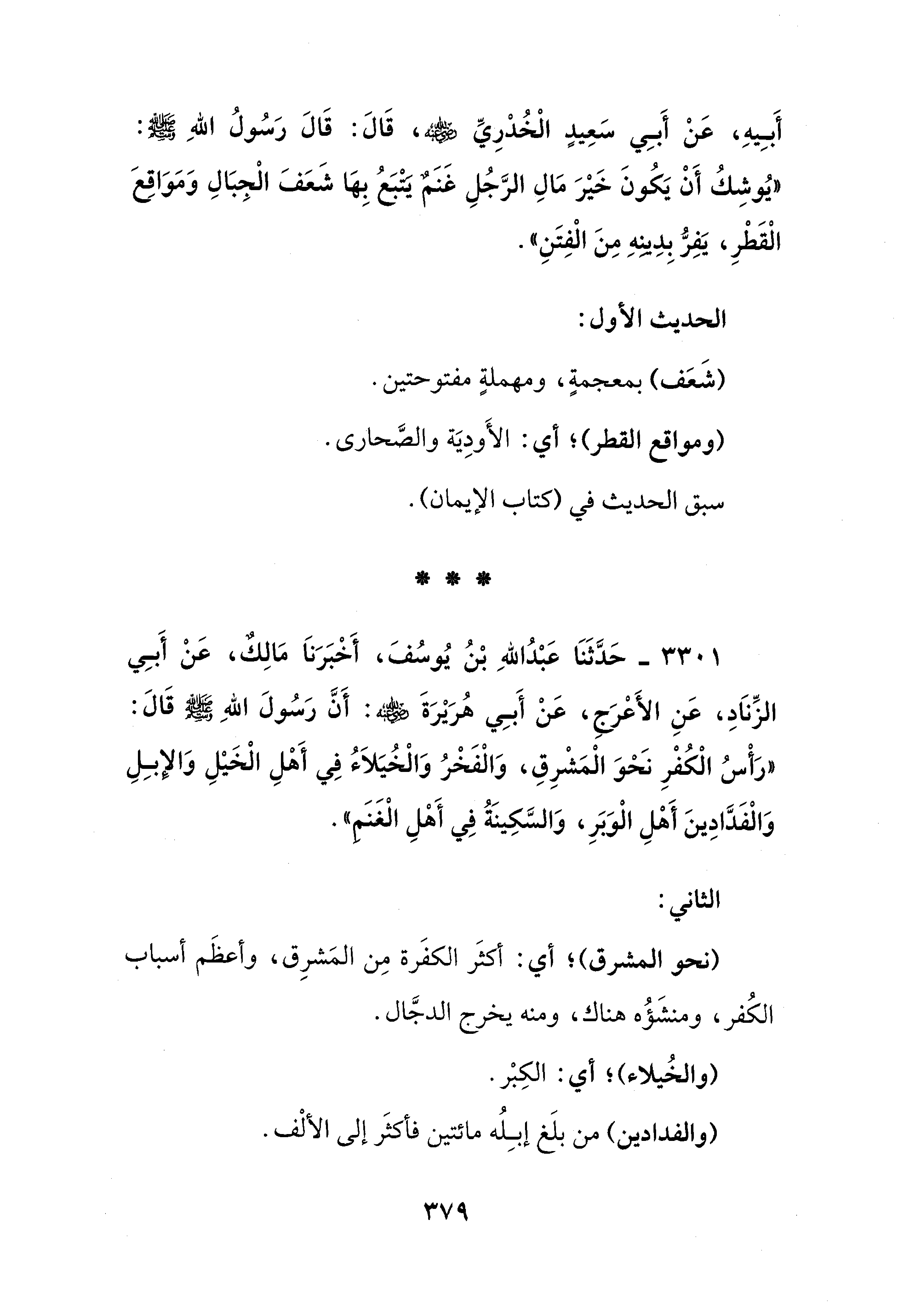 3301 - حَدَّثَنَا عَبْدُ اللهِ بْنُ يُوسُفَ، أَخْبَرَنَا مَالكٌ، عَنْ أَبِي الزِّنَادِ، عَنِ الأَعْرَجِ، عَنْ أَبِي هُرَيْرَةَ - رضي الله عنه -: أَنَّ رَسُولَ اللهِ - صلى الله عليه وسلم - قَالَ: "رَأْسُ الْكُفْرِ نَحْوَ الْمَشْرِقِ، وَالْفَخْرُ وَالْخُيَلاَءُ فِي أَهْلِ الْخَيْلِ وَالإبِلِ وَالْفَدَّادِينَ أَهْلِ الْوَبَرِ، وَالسَّكِينَةُ فِي أَهْلِ الْغَنَم".