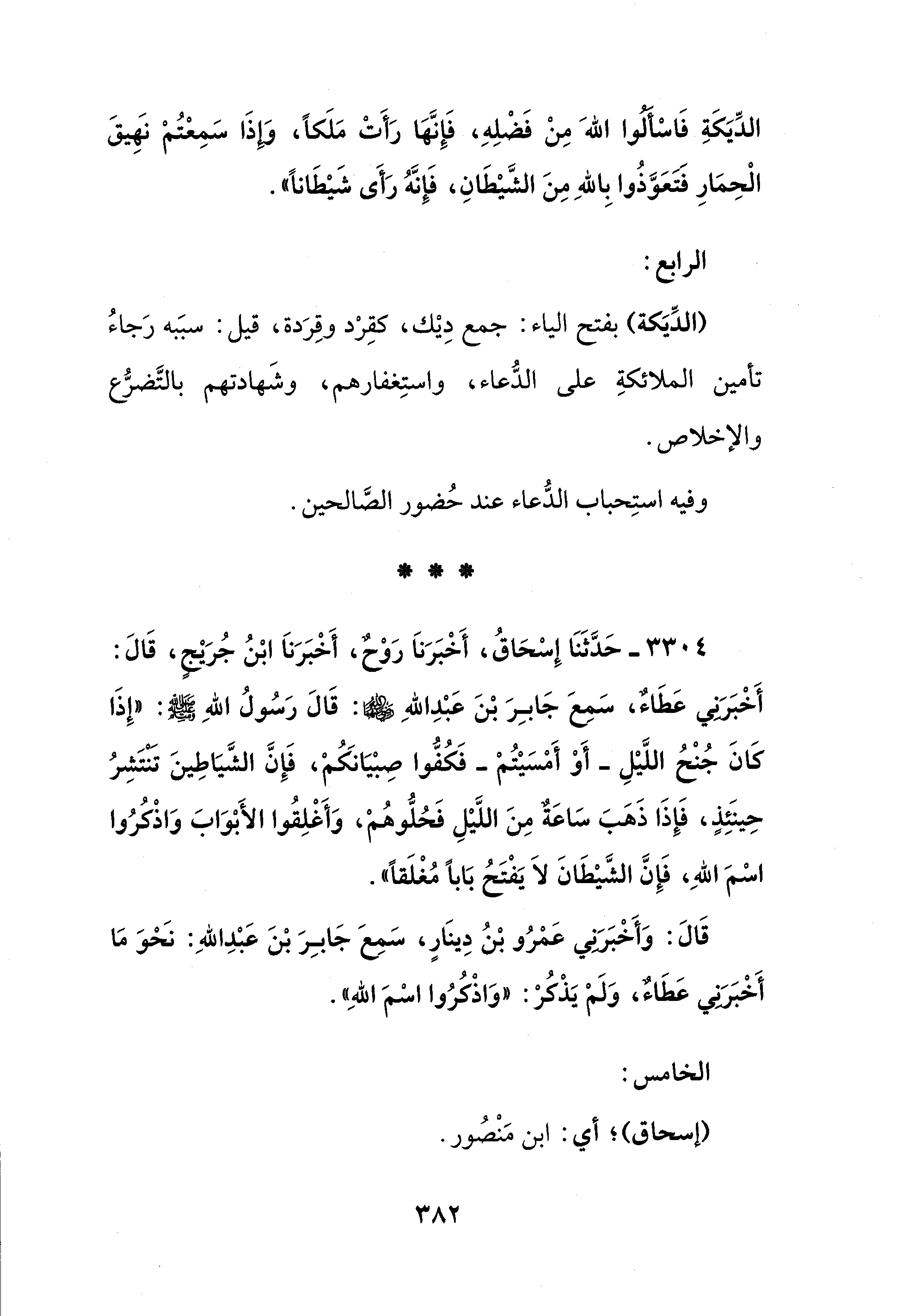 3304 - حَدَّثَنَا إِسْحَاقُ، أَخْبَرَنَا رَوْحٌ، أَخْبَرَنَا ابْنُ جُرَيْجٍ، قَالَ: أَخْبَرَني عَطَاءٌ، سَمِعَ جَابِرَ بْنَ عَبْدِ اللهِ - رضي الله عنهما -: قَالَ رَسُولُ اللهِ - صلى الله عليه وسلم -: "إِذَا كَانَ جُنْحُ اللَّيْلِ -أَوْ أَمْسَيْتُم- فَكُفُّوا صِبْيَانكُم، فَإِنَّ الشَّيَاطِينَ تَنْتَشِرُ حِينَئِذٍ، فَإِذَا ذَهبَ سَاعَةٌ مِنَ اللَّيْلِ فَحُلُّوهُم، وَأَغْلِقُوا الأَبْوَابَ وَاذْكُرُوا اسْمَ اللهِ، فَإِنَّ الشَّيْطَانَ لاَ يَفْتَحُ بَابًا مُغْلَقًا".