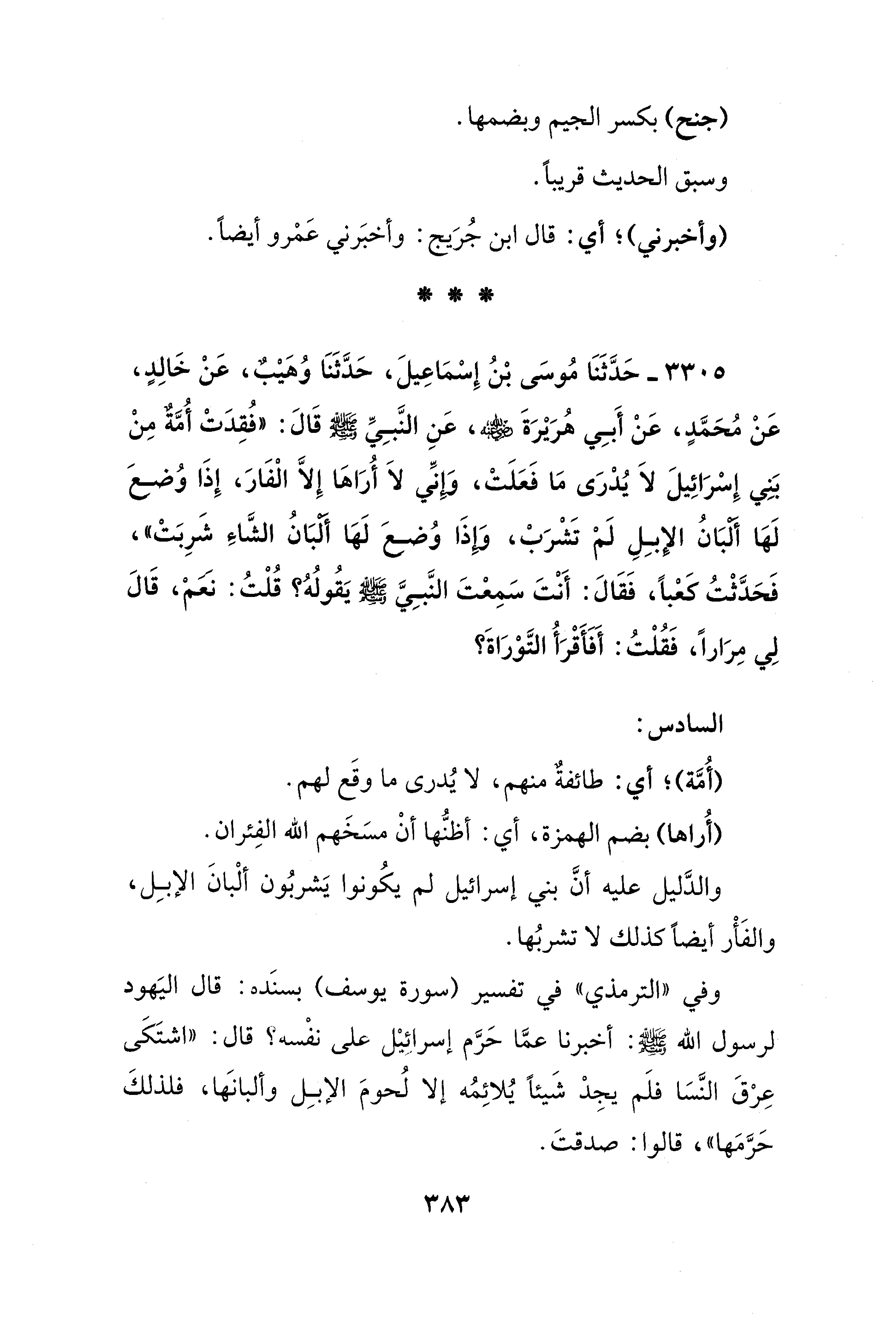 3305 - حَدَّثَنَا مُوسَى بْنُ إِسْمَاعِيلَ، حَدَّثَنَا وُهيْبٌ، عَنْ خَالِدٍ، عَنْ مُحَمَّدٍ، عَنْ أَبِي هُرَيْرَةَ - رضي الله عنه -، عَنِ النَّبِيِّ - صلى الله عليه وسلم - قَالَ: "فُقِدَتْ أُمَّةٌ مِنْ بَنِي إِسْرَائِيلَ لاَ يُدرَى مَا فَعَلَتْ، وإنِّي لاَ أُرَاها إِلَّا الْفَارَ، إِذَا وُضعَ لَها ألبَانُ الإبِلِ لم تَشْرَبْ، وَإِذَا وُضِعَ لَها ألبَانُ الشَّاءِ شَرِبَتْ"، فَحَدَّثْتُ كَعْبًا، فَقَالَ: أَنْتَ سَمِعْتَ النَّبِيَّ - صلى الله عليه وسلم - يَقُولُهُ؟ قُلْتُ: نعم، قَالَ لِي مِرَارًا، فَقُلْتُ: أفأقْرَأُ التَّوْرَاةَ؟