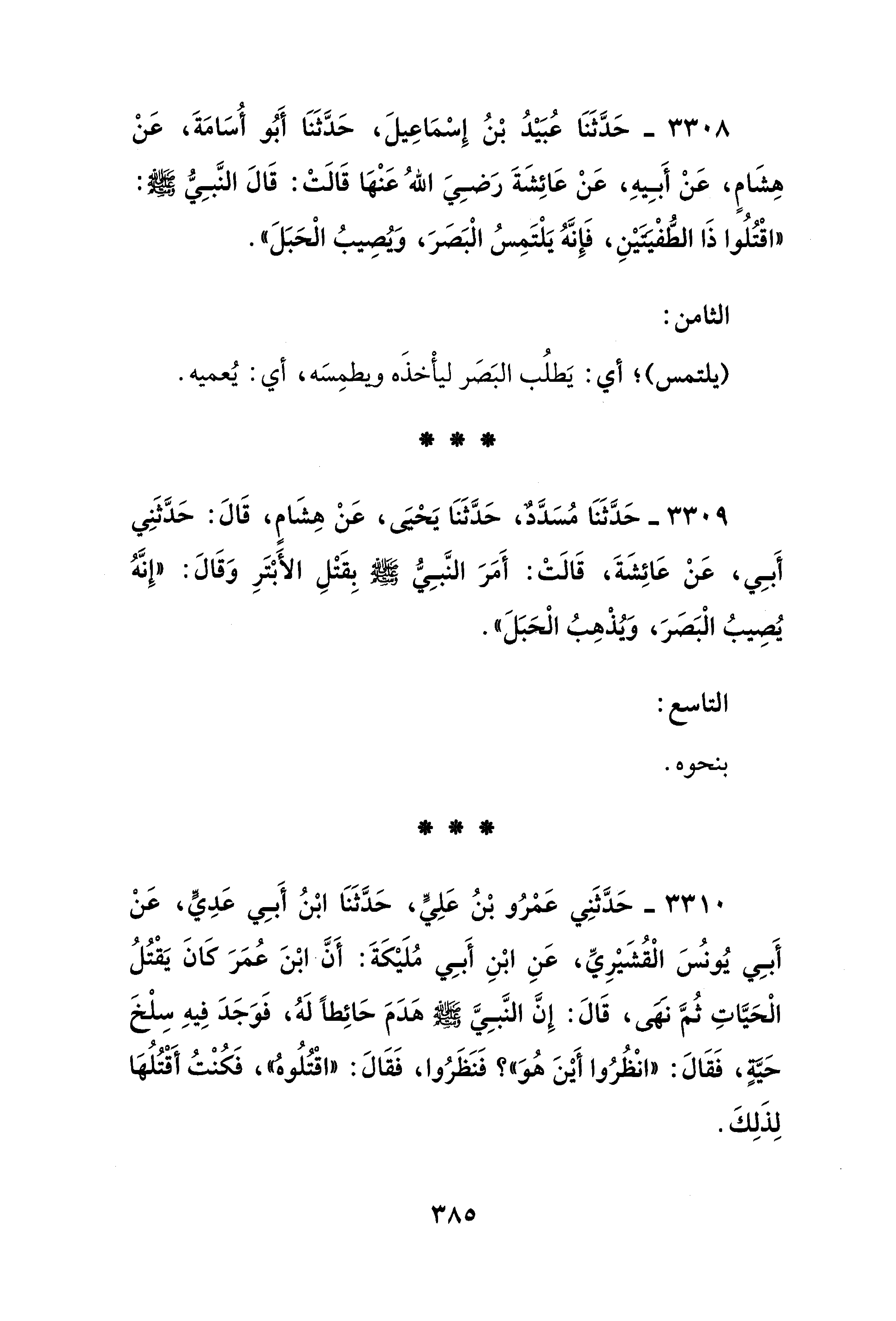 3308 - حَدَّثَنَا عُبَيْدُ بْنُ إِسْمَاعِيلَ، حَدَّثَنَا أَبُو أُسَامَةَ، عَنْ هِشَامٍ، عَنْ أَبِيهِ، عَنْ عَائِشَةَ رَضِيَ اللهُ عَنْها قَالَتْ: قَالَ النَّبِيُّ - صلى الله عليه وسلم -: "اقْتُلُوا ذَا الطُّفْيتَيْنِ، فَإِنَّهُ يَلْتَمِسُ الْبَصَرَ، وَيُصِيبُ الْحَبَلَ".