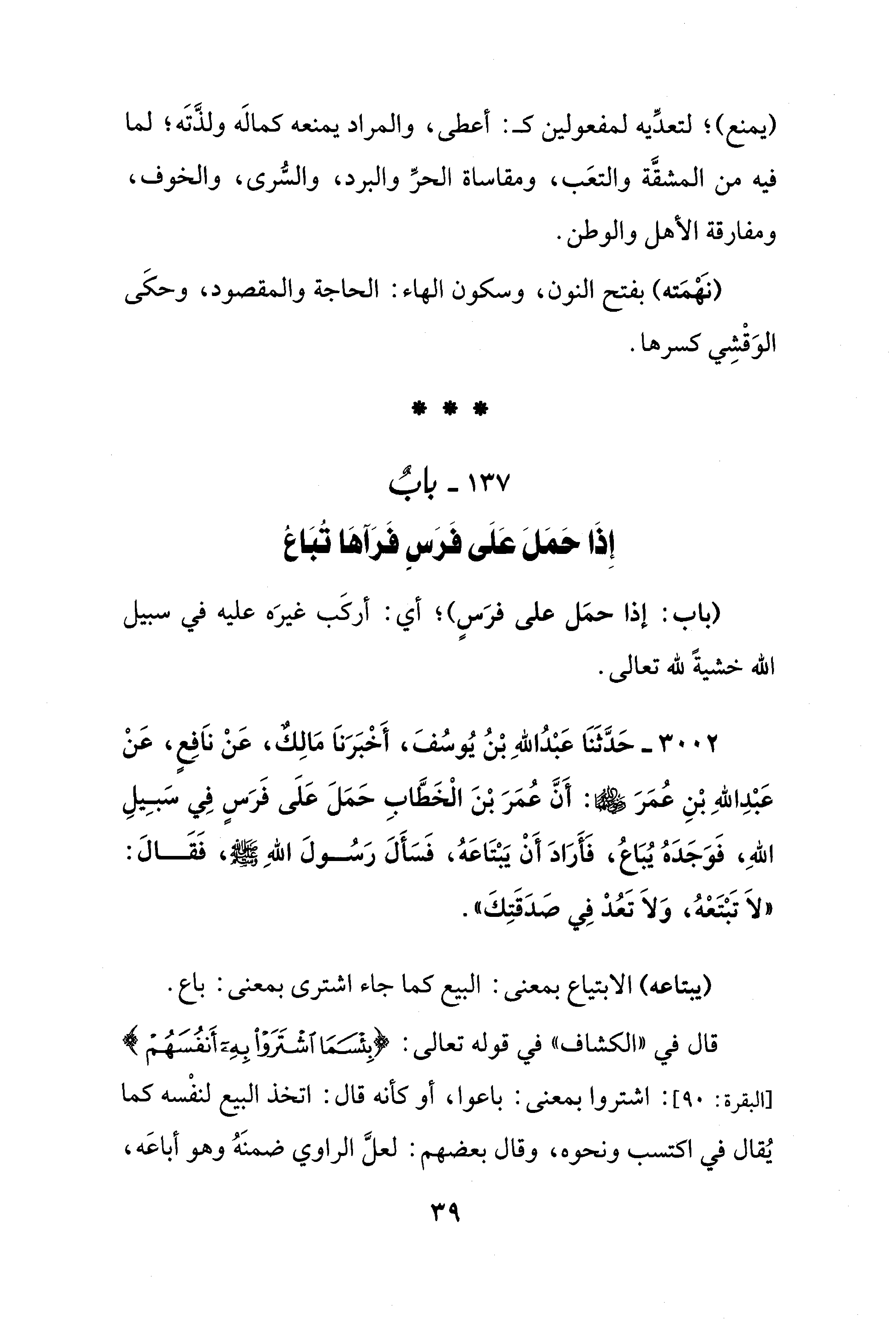 3002 - حَدَّثَنَا عَبْدُ اللهِ بْنُ يُوسُفَ، أَخْبَرَنَا مَالِكٌ، عَنْ نَافِعٍ، عَنْ عَبْدِ اللهِ بْنِ عُمَرَ - رضي الله عنهما -: أَنَّ عُمَرَ بْنَ الْخَطَّابِ حَمَلَ عَلَى فَرَسٍ فِي سَبِيلِ اللهِ، فَوَجَدَهُ يُبَاعُ، فَأَرَادَ أَنْ يَبْتَاعَهُ، فَسَأَلَ رَسُولَ اللهِ - صلى الله عليه وسلم -، فَقَالَ: "لاَ تَبْتَعْهُ، وَلاَ تَعُدْ فِي صَدَقَتِكَ".