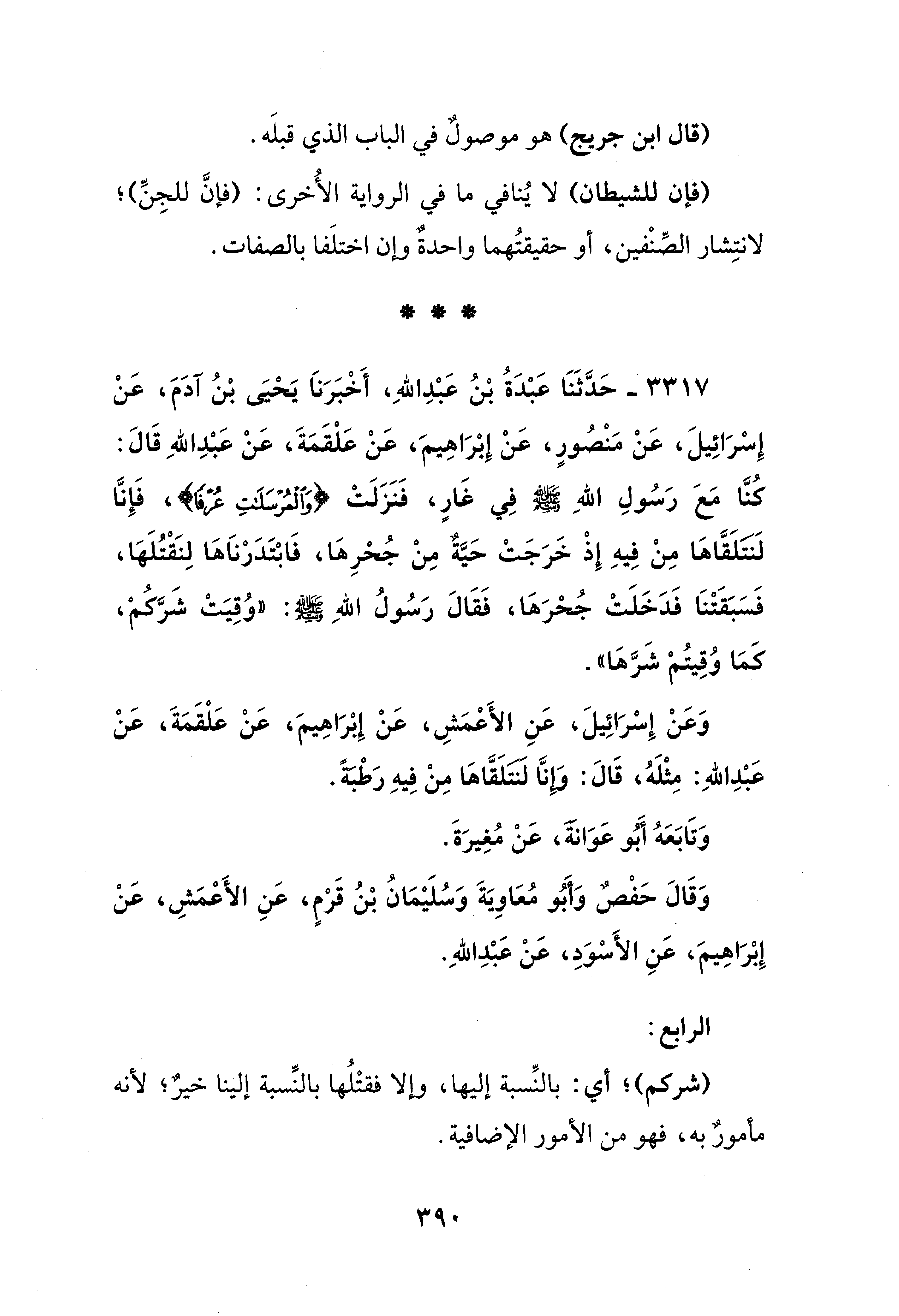 3317 - حَدَّثَنَا عَبْدَةُ بْنُ عَبْدِ اللهِ، أَخْبَرَنَا يَحيَى بْنُ آدَمَ، عَنْ إِسْرَائِيلَ، عَنْ مَنْصُورٍ، عَنْ إِبْرَاهِيمَ، عَنْ عَلْقَمَةَ، عَنْ عَبْدِ اللهِ قَالَ: كنَّا مَعَ رَسُولِ اللهِ - صلى الله عليه وسلم - فِي غَارٍ، فَنَزَلَتْ {وَالْمُرْسَلَاتِ عُرْفًا}، فَإِنَّا لَنتَلَقَّاها مِنْ فِيهِ إِذْ خَرَجَتْ حَيَّةٌ مِنْ جُحرها، فَابْتَدَرناَها لِنَقْتُلها، فَسَبَقَتْنَا فَدَخَلَتْ جُحرَها، فَقَالَ رَسُولُ اللهِ - صلى الله عليه وسلم -: "وُقِيَتْ شَرَّكُمْ، كمَا وُقِيتمْ شَرَّها".